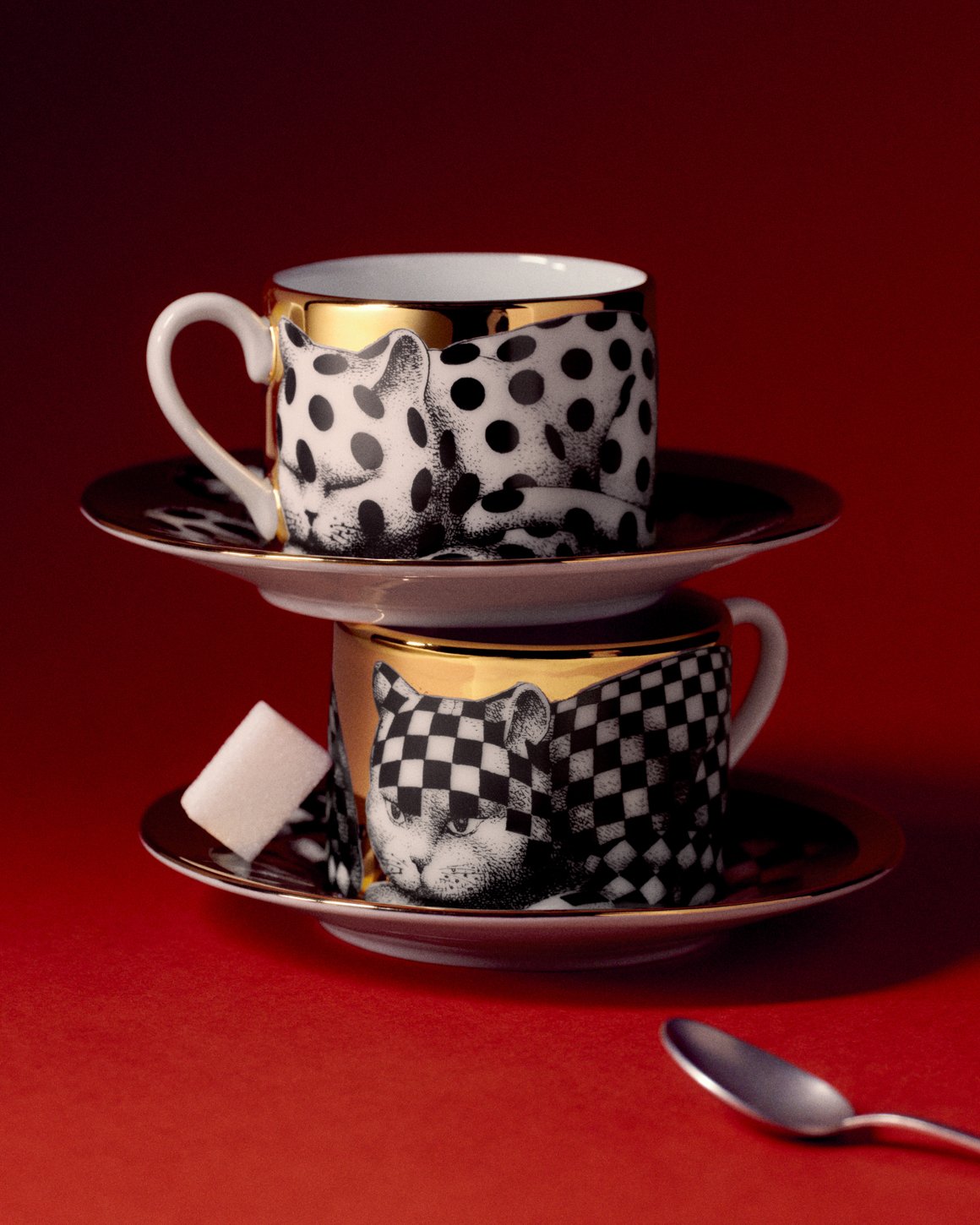 The new High Fidelity tea and coffee sets reinterpret the principle of variation. Floral, dotted, or checkered: the cat’s coat changes on each cup and saucer, turning the table into an original visual game.