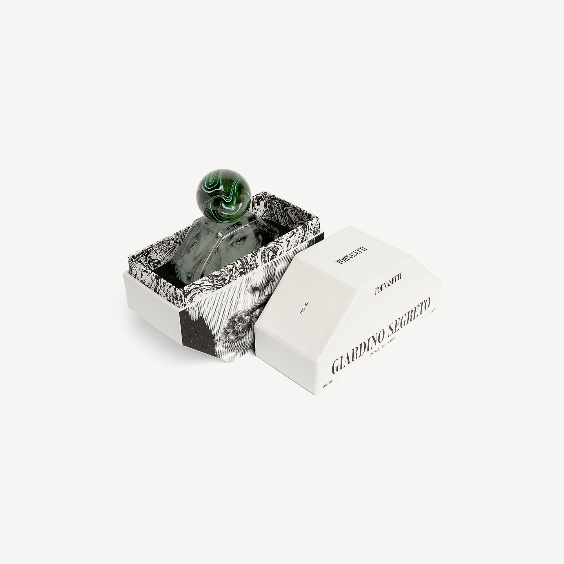 The bottle’s novel octagonal design makes the Fornasetti extrait de parfum a unique object, whilst the green Malachite cap adds an elegant, refined touch.The box plays with the octagonal shape, evoking the design of the bottle.