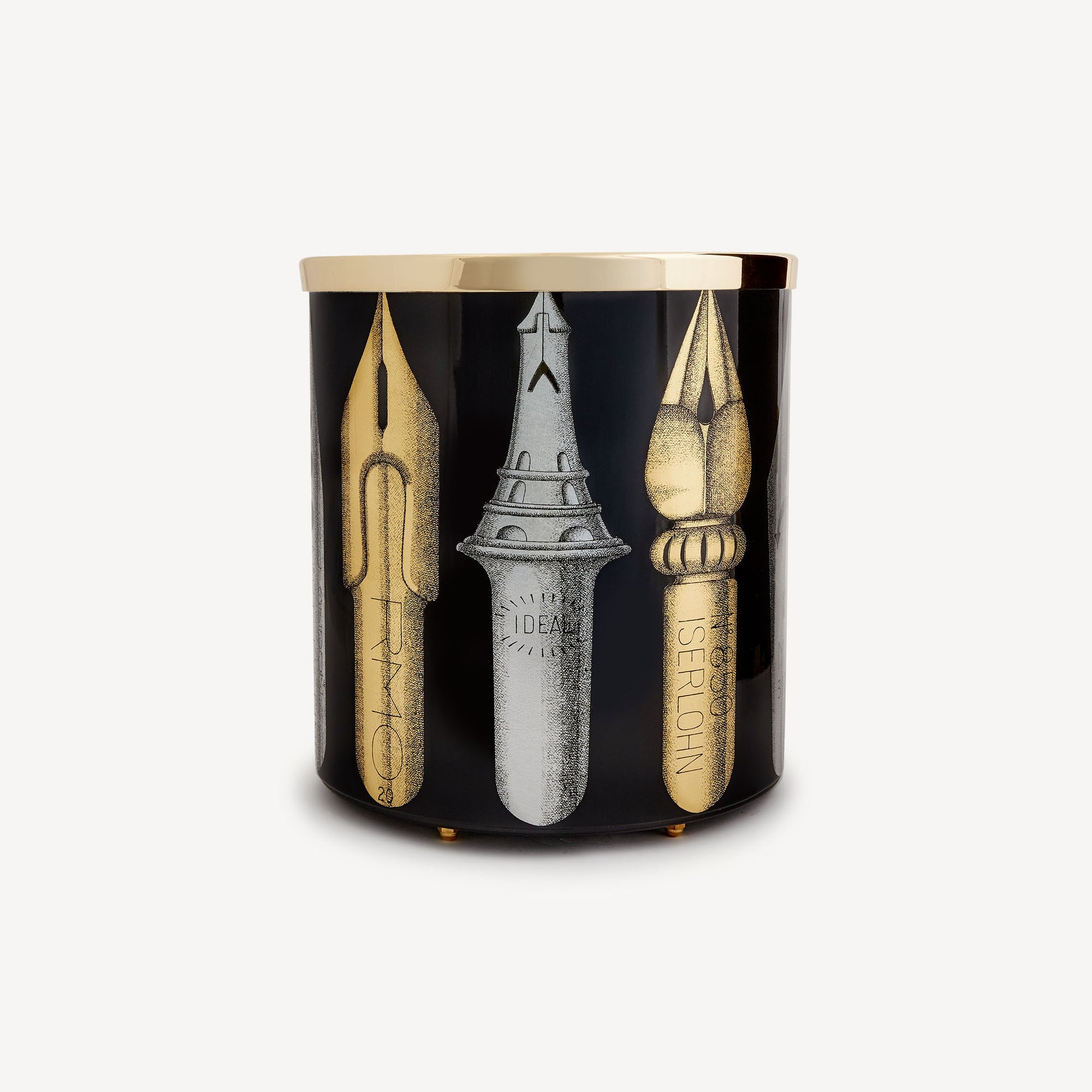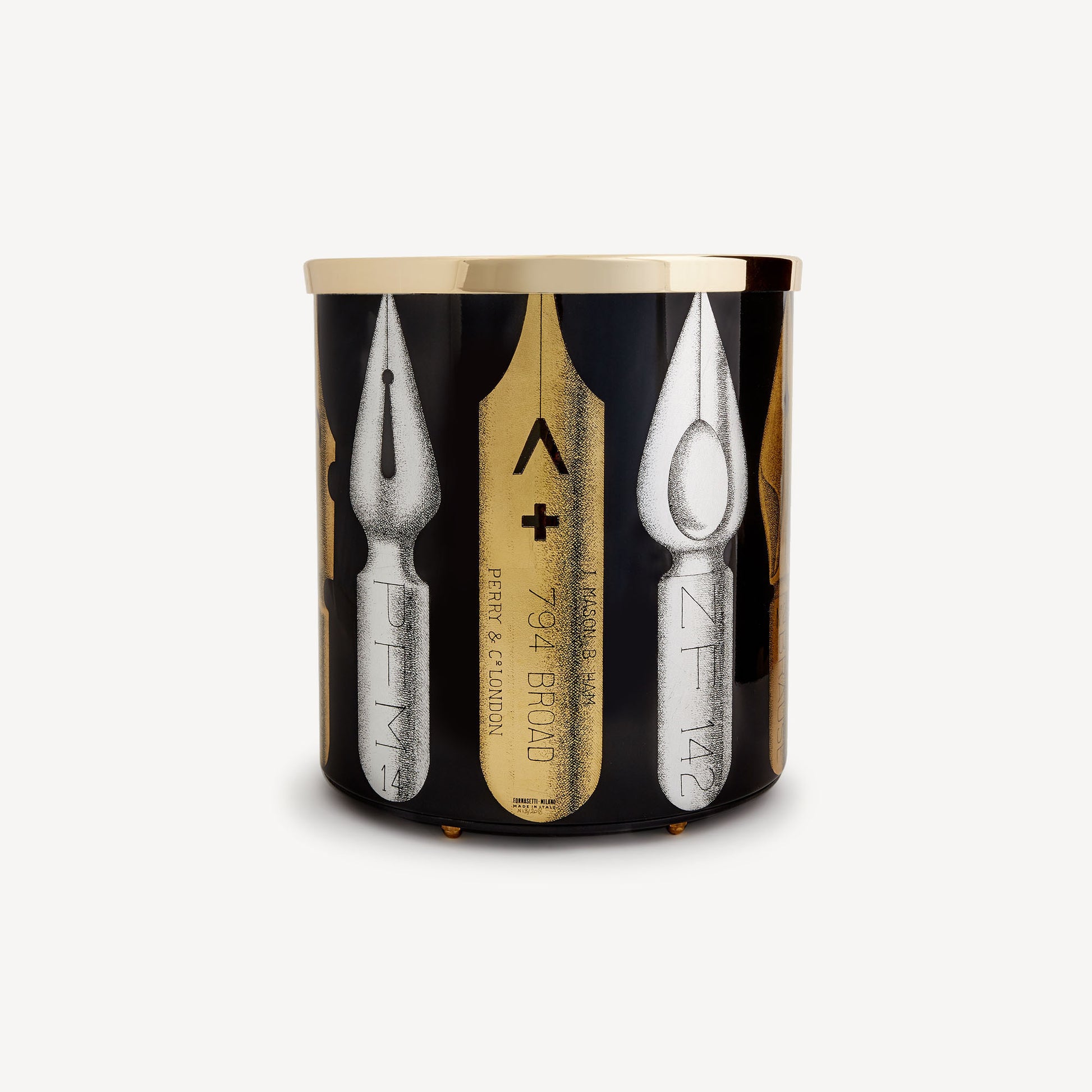 - A lover of subtle and precise graphic strokes, Fornasetti pays tribute to them with a series of nibs that decorate this paper basket made of hand-silkscreened, painted, and lacquered metal, with a brass top edge and fitted with feet. Its eclectic shape allows it to be transformed into a container, vase holder, or simple accessory. For cleaning, we recommend a damp cloth without any soaps or solvents.