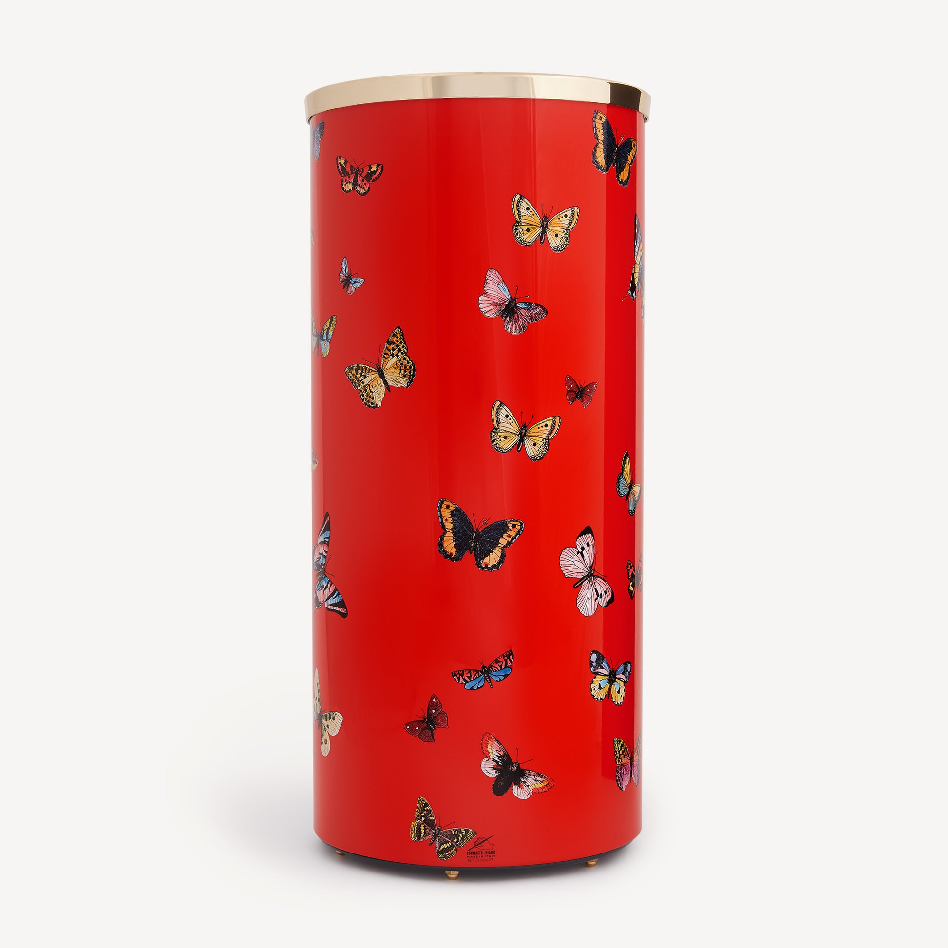 - The gracefulness of the butterflies in flight, the protagonists of this decoration, lends an up-to-date and surprising charm to this hand-painted, lacquered, and silkscreened metal umbrella stand, with a brass upper edge and equipped with feet. Its eclectic shape allows it to be transformed into a container, vase holder, or simple accessory. For cleaning, we recommend a damp cloth without any soaps or solvents.