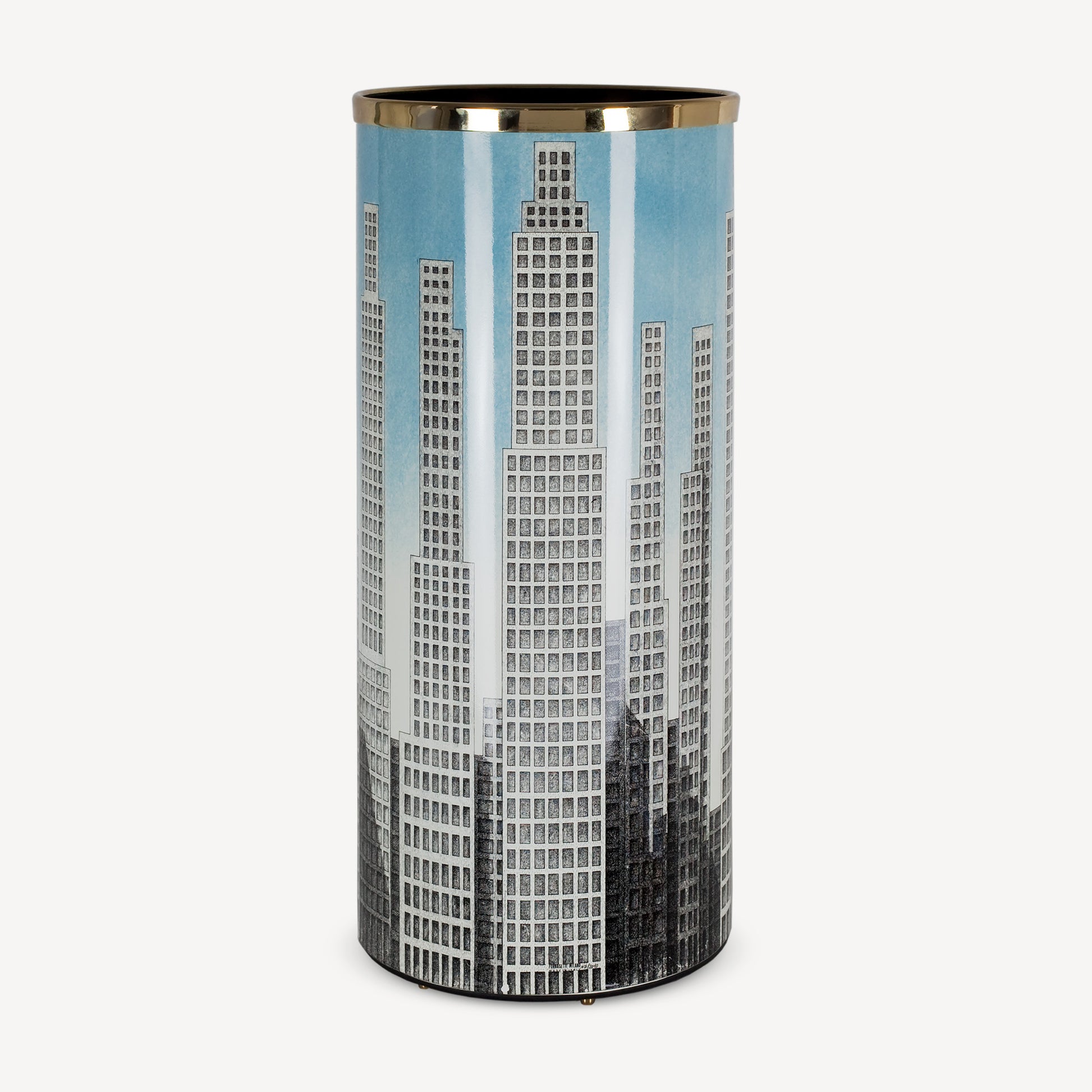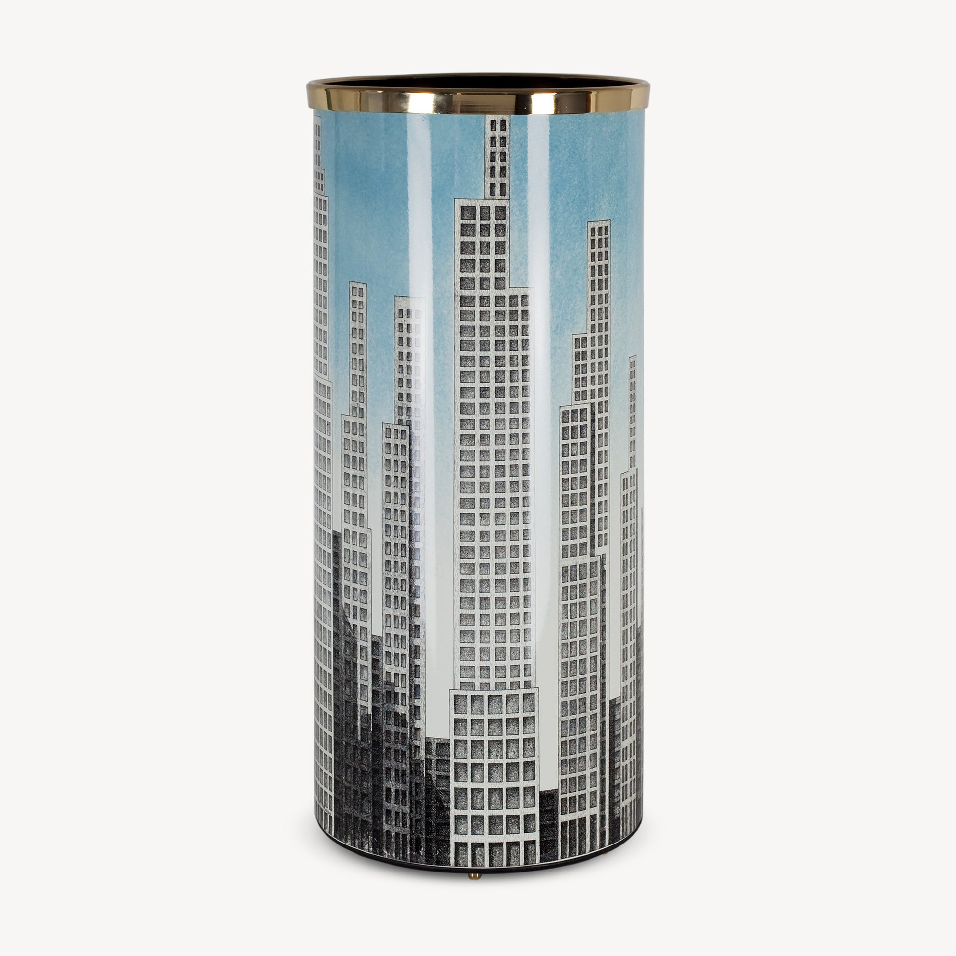 The Grattacieli décor turns the Fornasetti umbrella stand into a modern skyline, playing between fiction and reality.