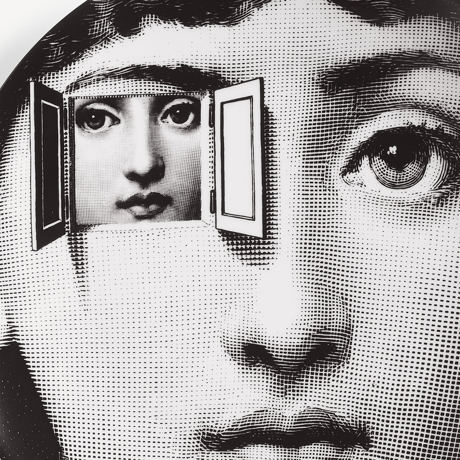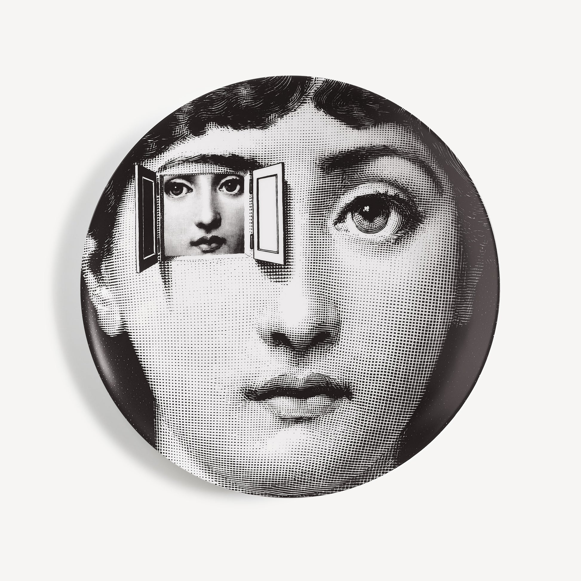 - The unmistakable features of Lina Cavalieri's face, playfully reinterpreted by Fornasetti, provide the inspiration for the Tema e Variazioni series to which this hand-decorated porcelain plate belongs. A true collector's item, you can use this creation as a wall plate, thanks to the two holes on the back, but also as an ornamental piece for table art. For cleaning, we recommend a damp cloth without any soaps or solvents.