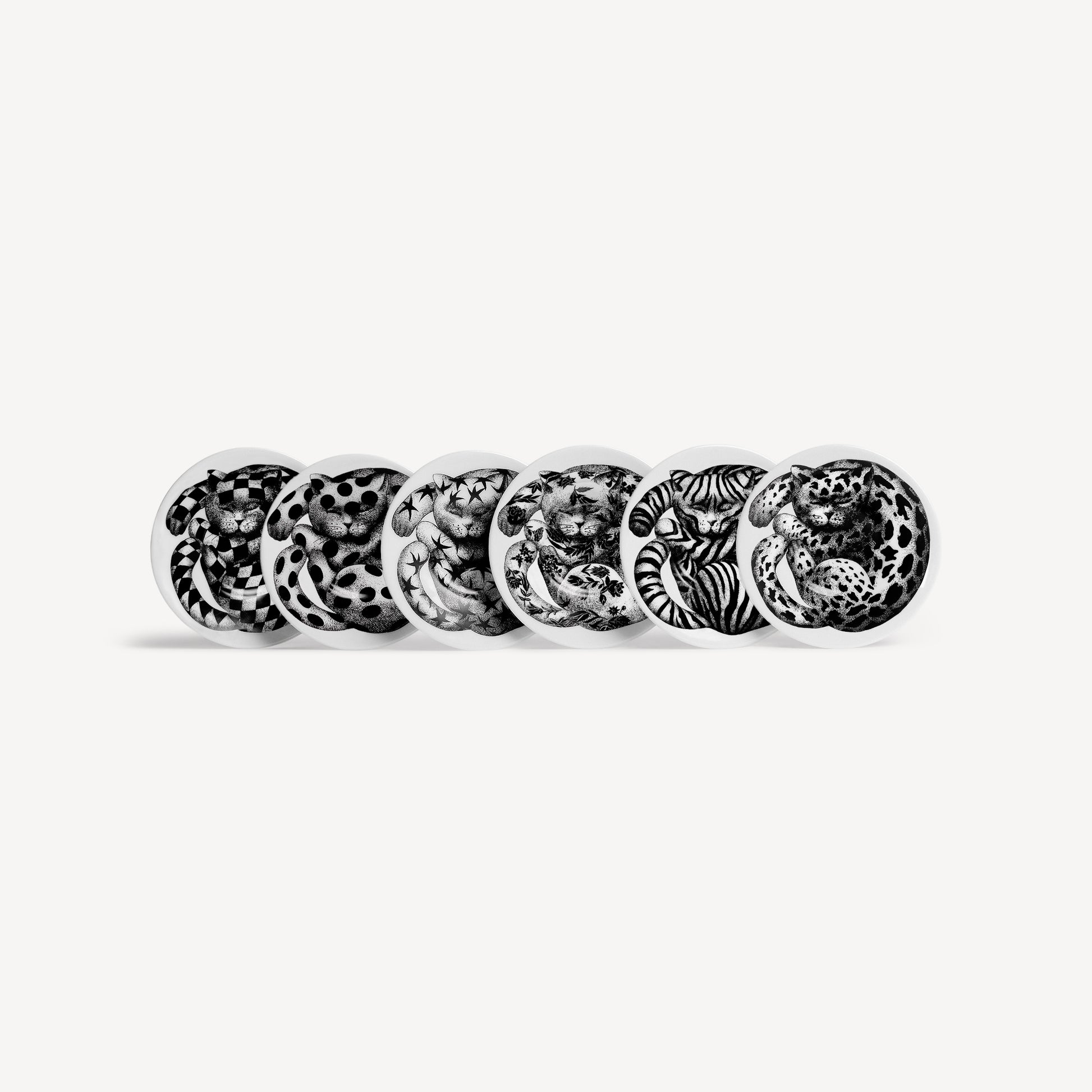 The High Fidelity design is a true decorative divertissement, based on the principle of variations on a theme. A crafty-looking, lounging cat appears always in the same position, while the pattern of its coat changes on each cup and saucer set: striped, spotted, covered with stars, polka dots, flowers or chequered.