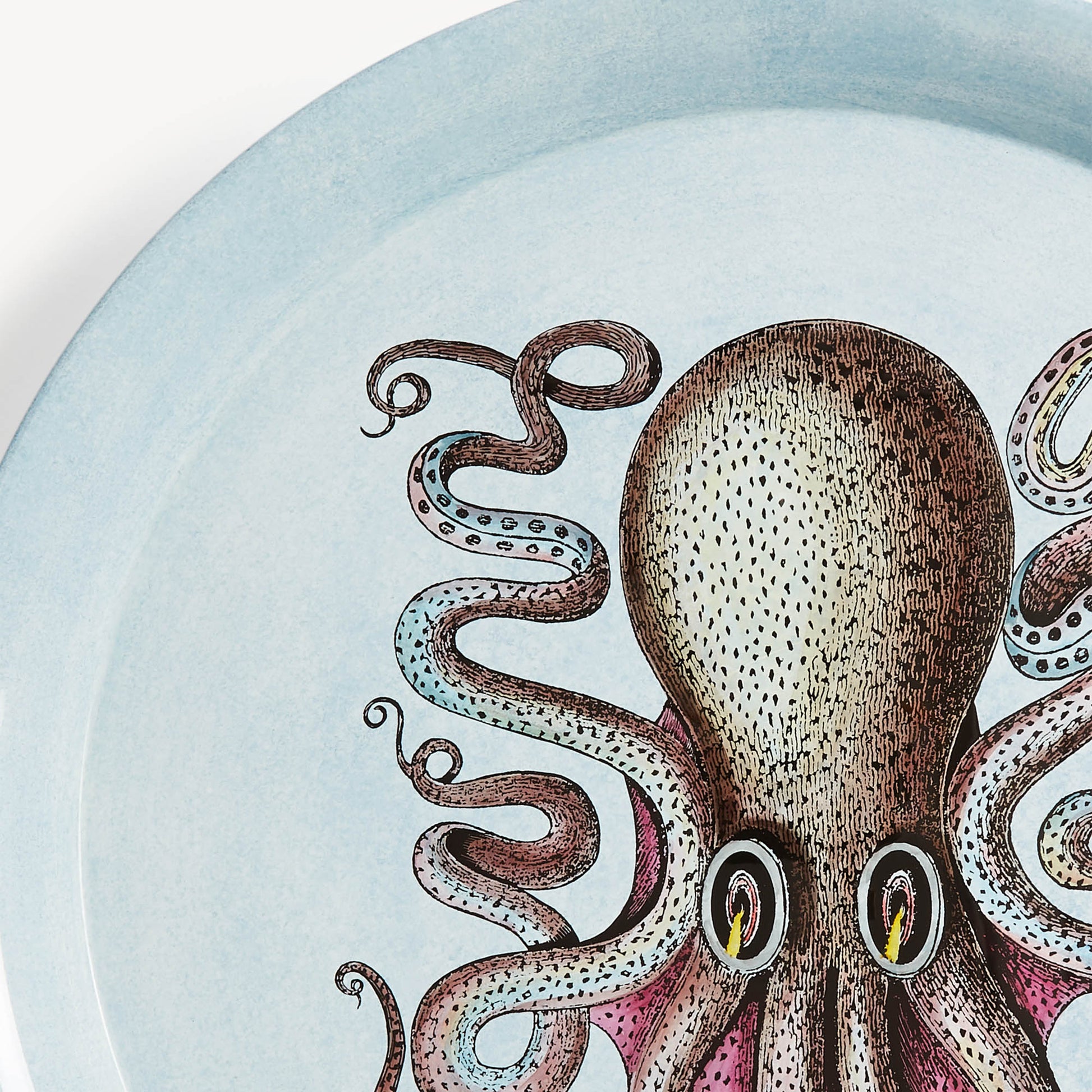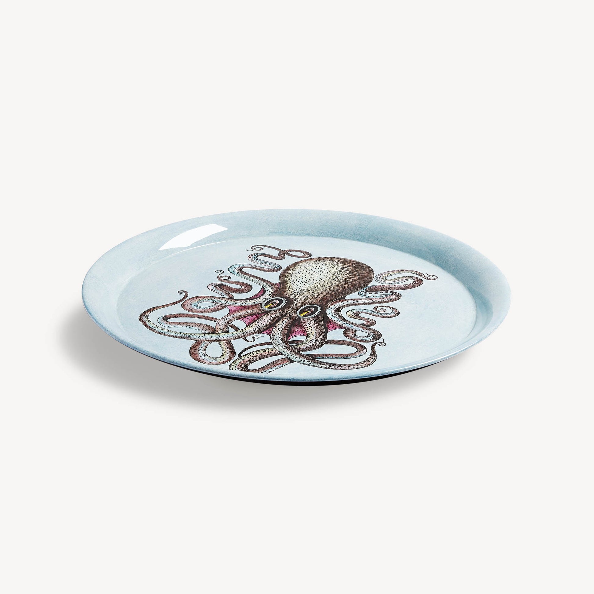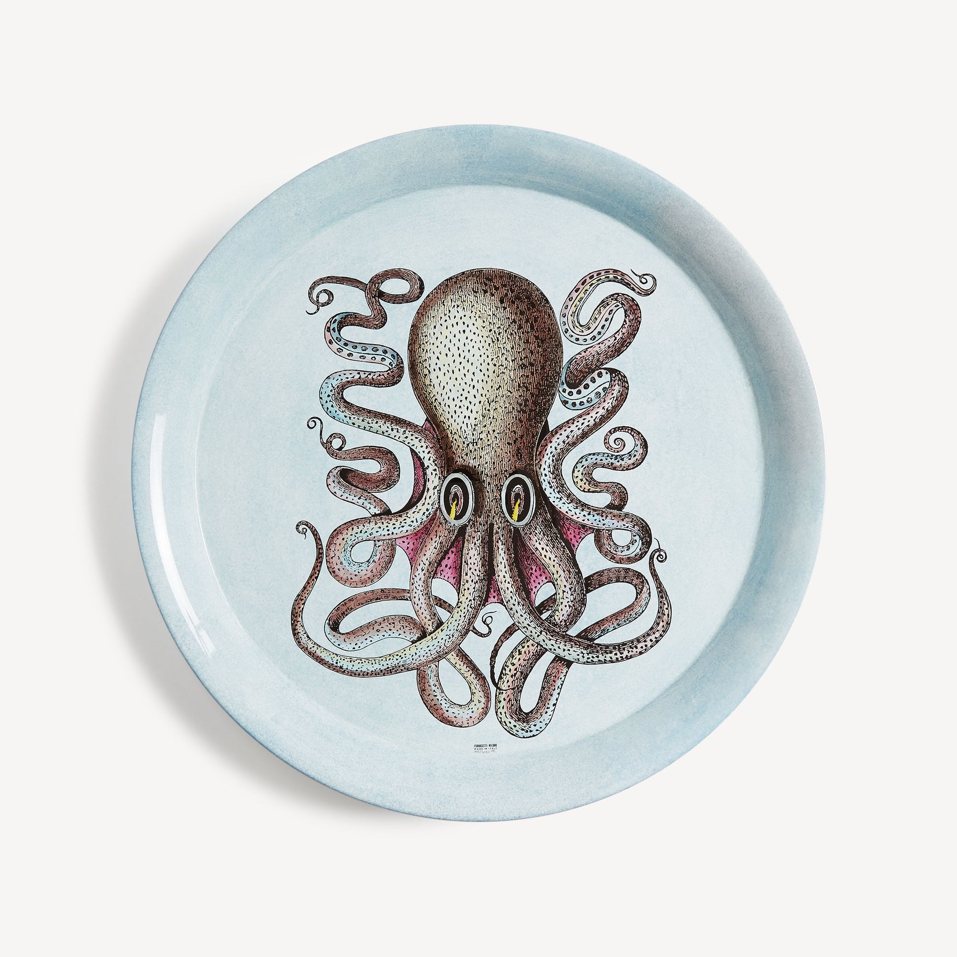 - The circular shape and flat surface give great prominence to the Atelier's decorations. This hand-decorated tray with gold accents is embellished with the mysterious silhouette of an octopus, a testament to Fornasetti's love of zoomorphic subjects. Combined with a foldable stand, the tray can be transformed into a coffee table.