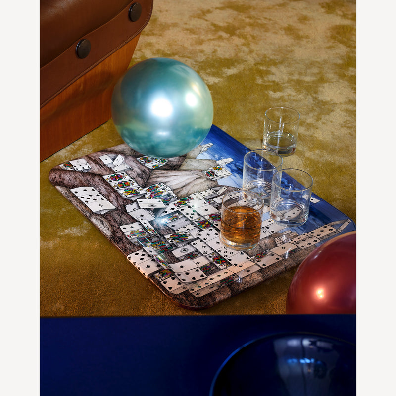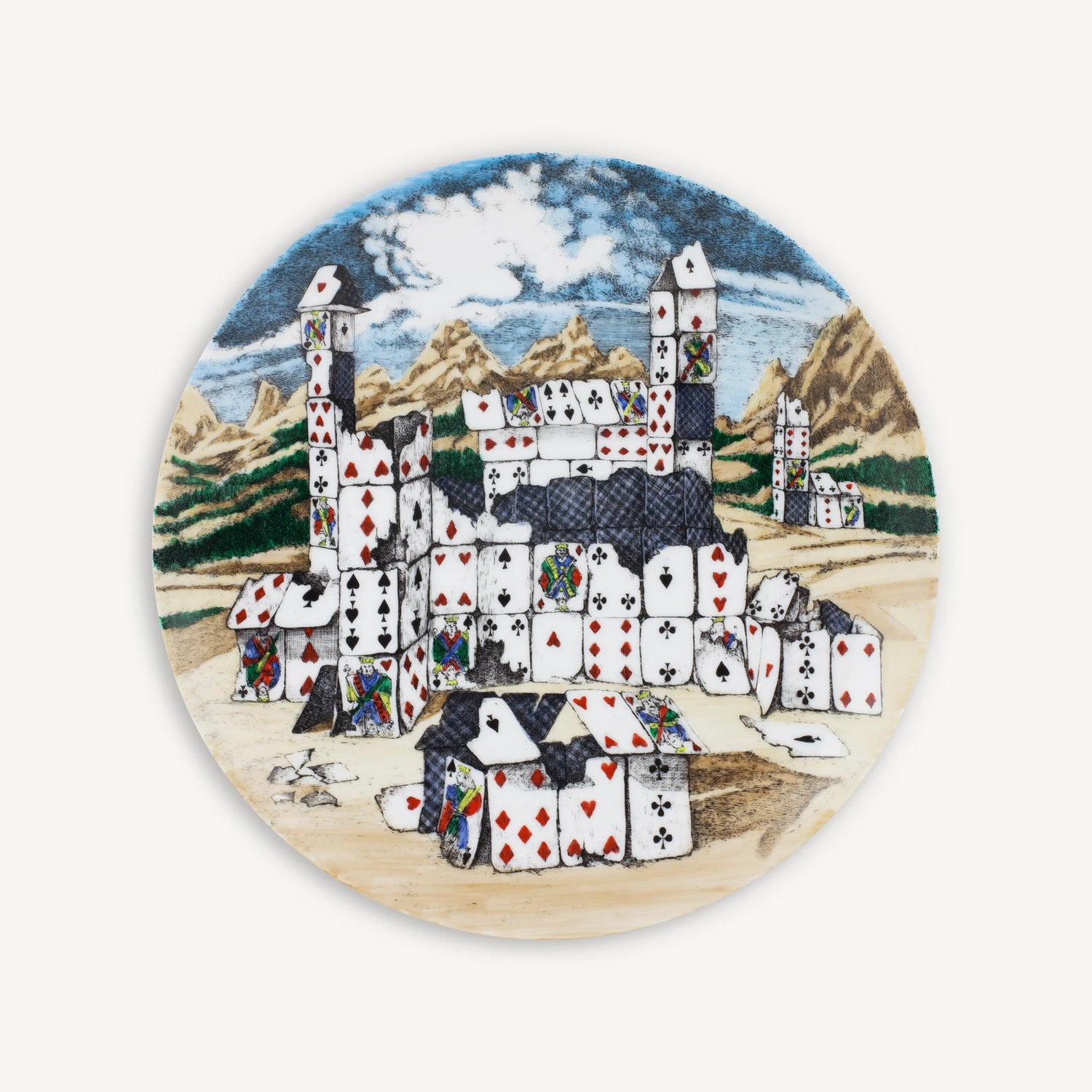 A tireless collector of objects, clippings and images, Fornasetti explored the theme of cards games starting from his own private collections. From tarot cards to playing cards, what fascinated him about them was their iconographic and illustrative aspect, but he also understood games metaphorically as an imaginative, artistic dimension, parallel to the real world. This is how he constructs invented landscapes and surreal cities, inhabited by kings and queens and dominated by voluminous yet light, precarious and intriguing architecture.