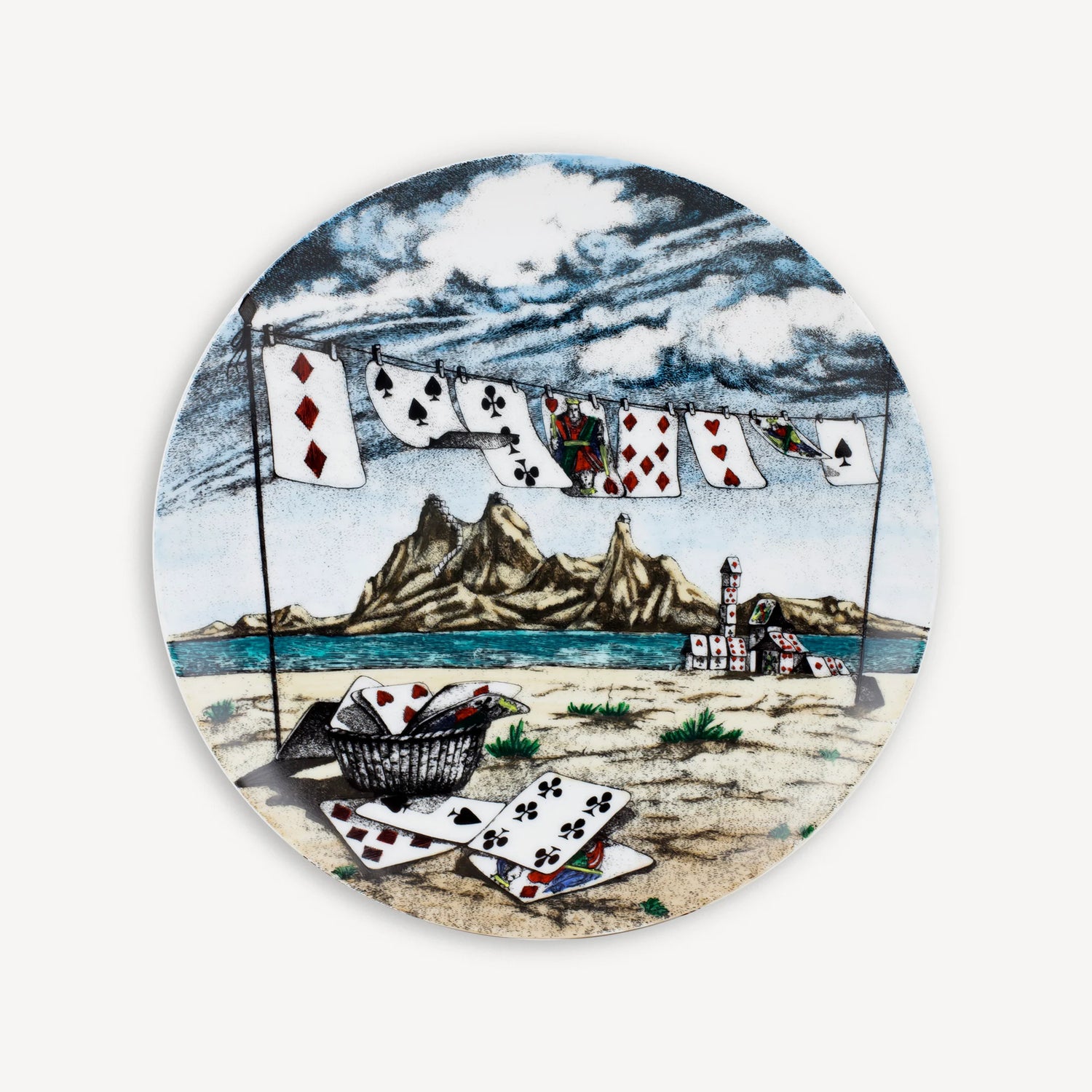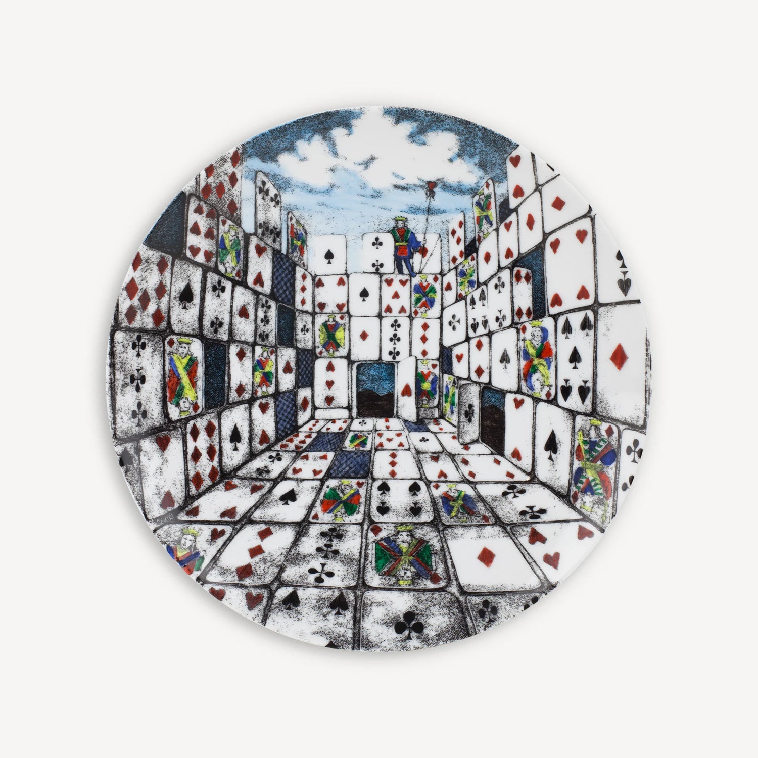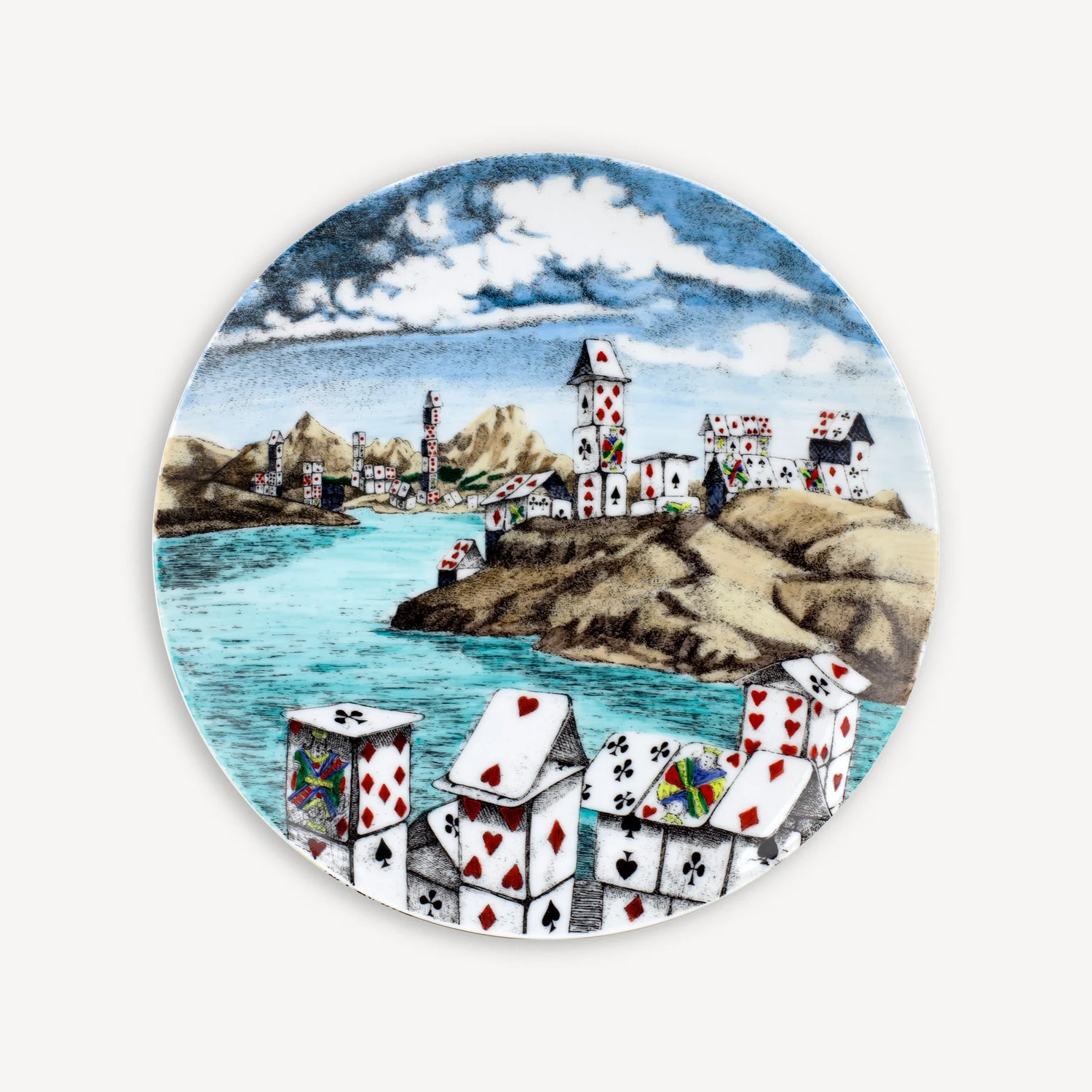 The set of 12 hand-decorated plates is a journey into Fornasetti's visionary mind. Each plate is a different landscape where images of architecture and playing cards merge into dreamlike scenes.