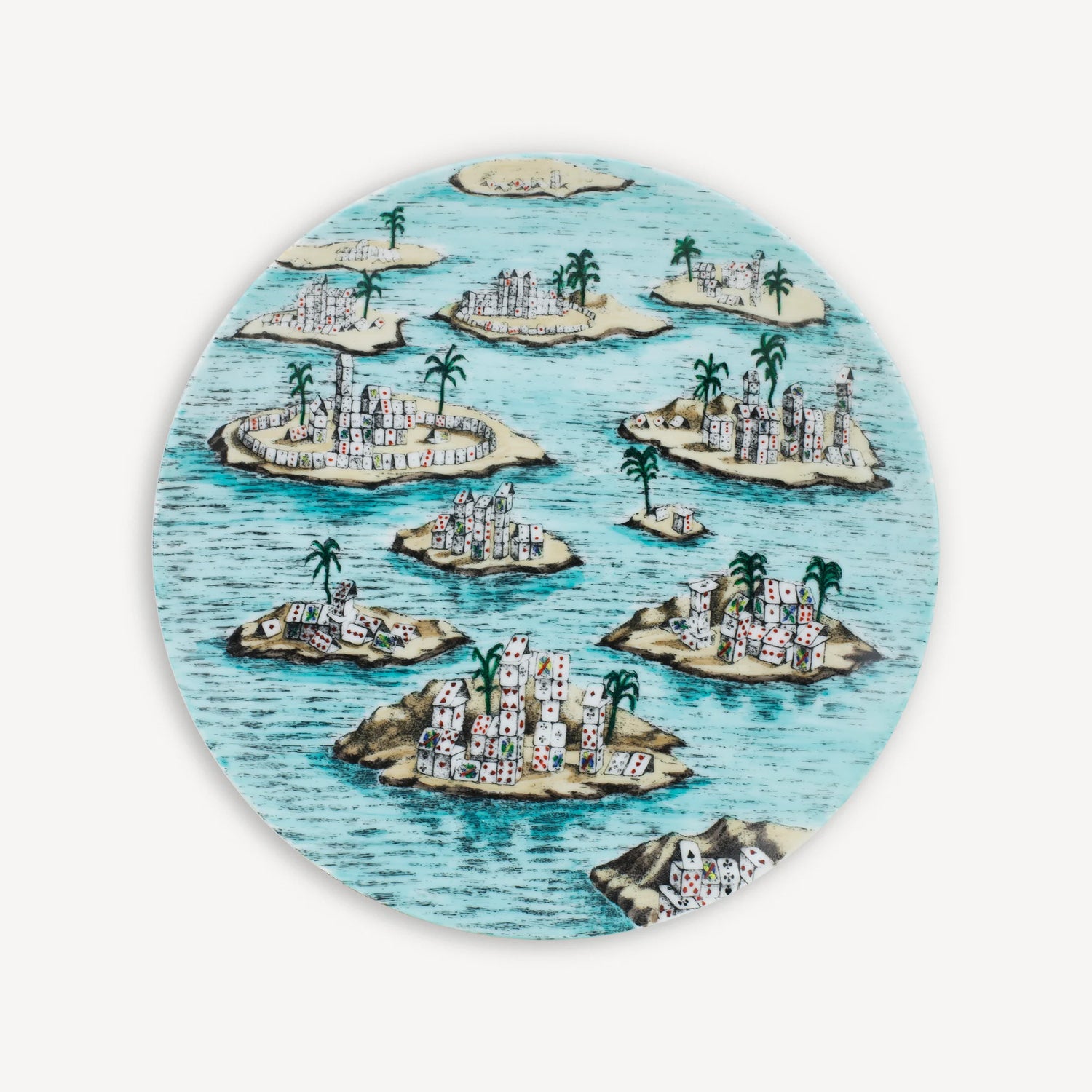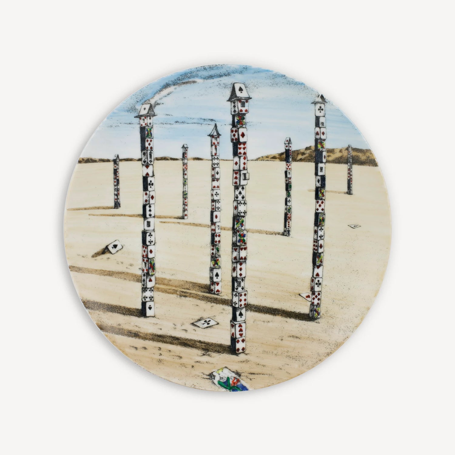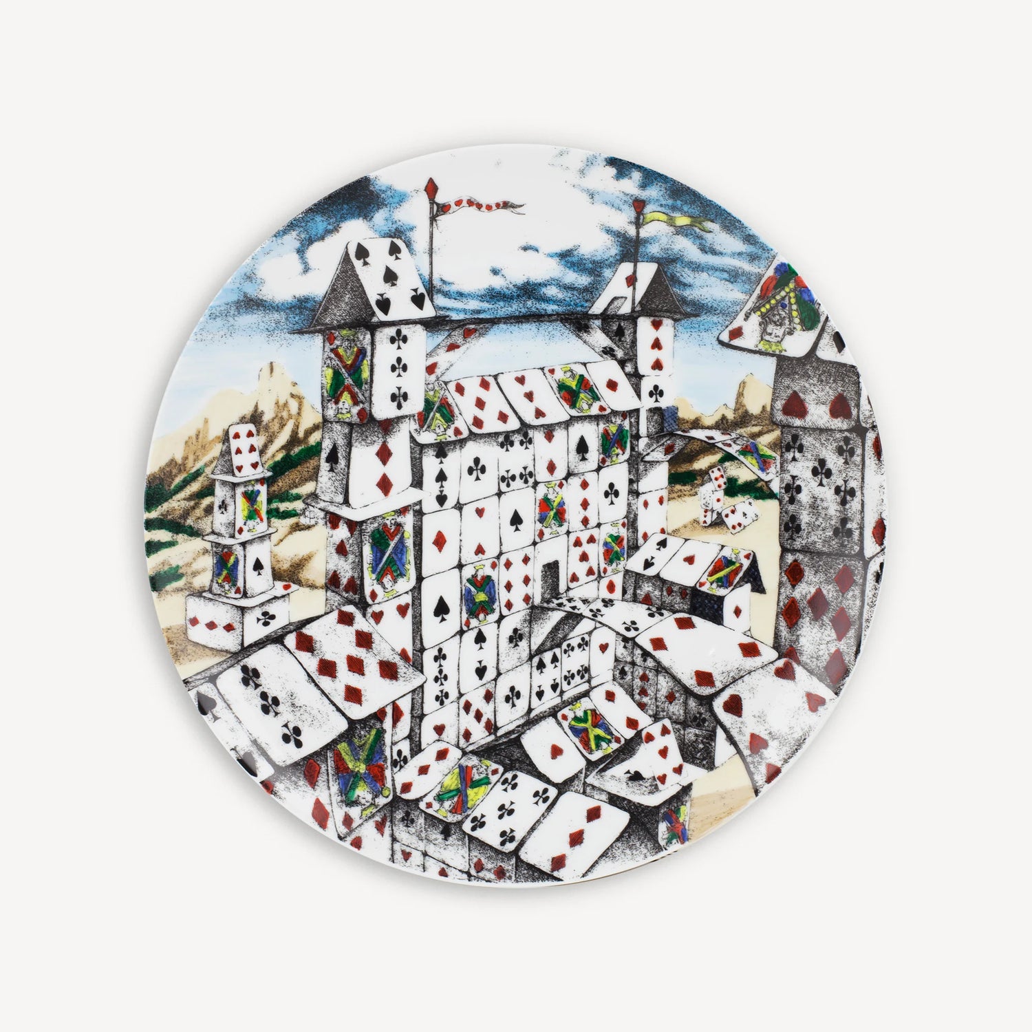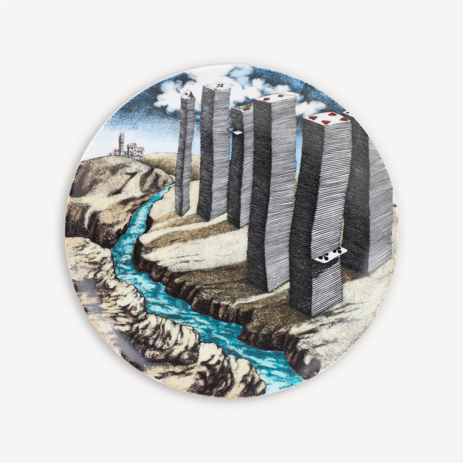 The set of 12 hand-decorated plates is a journey into Fornasetti's visionary mind. Each plate is a different landscape where images of architecture and playing cards merge into dreamlike scenes.