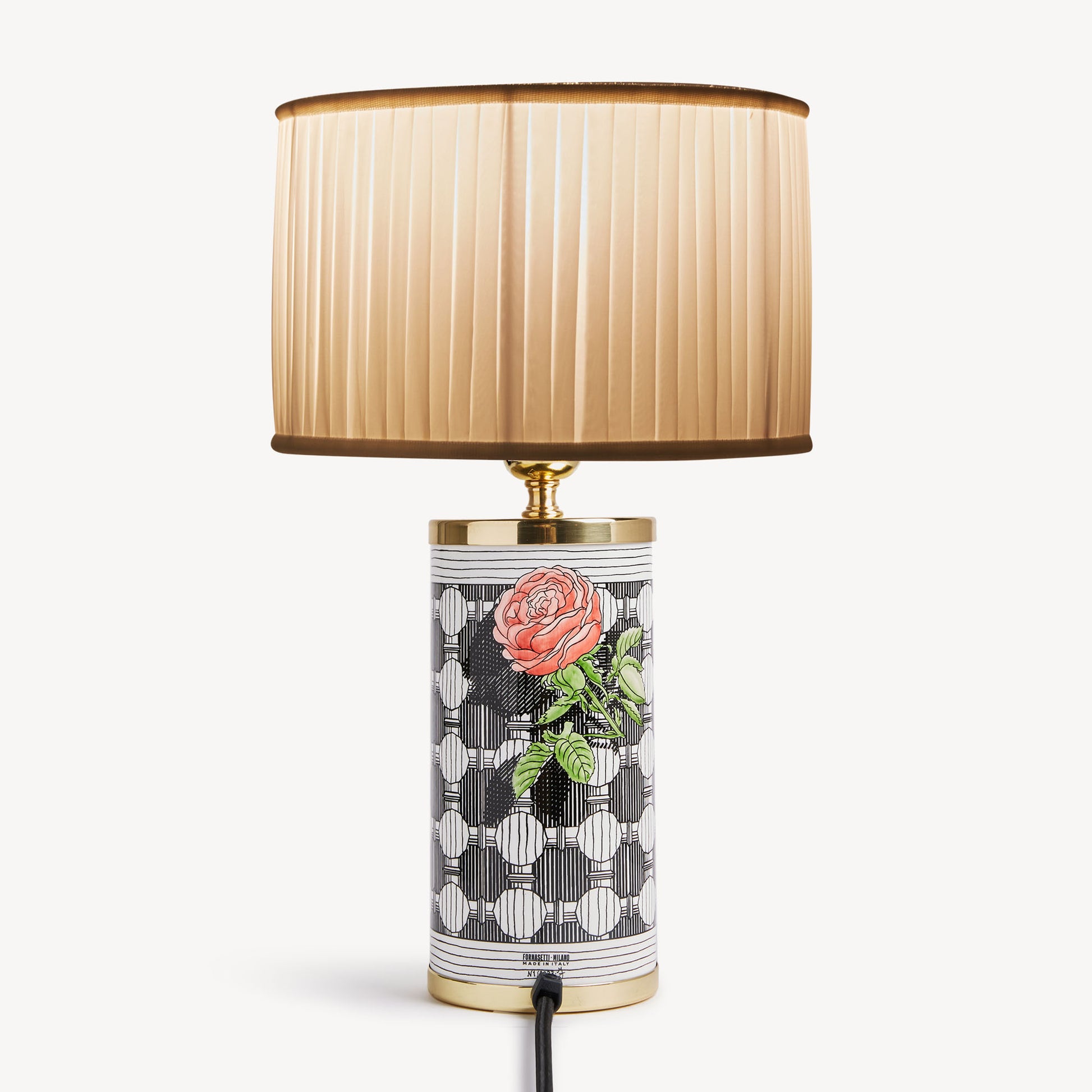 - This cylindrical lampshade in pleated fabric with a metal frame is the ideal complement to create the Fornasetti lamp for the table or the night stand: an object that turns the everyday gestures in artistic.