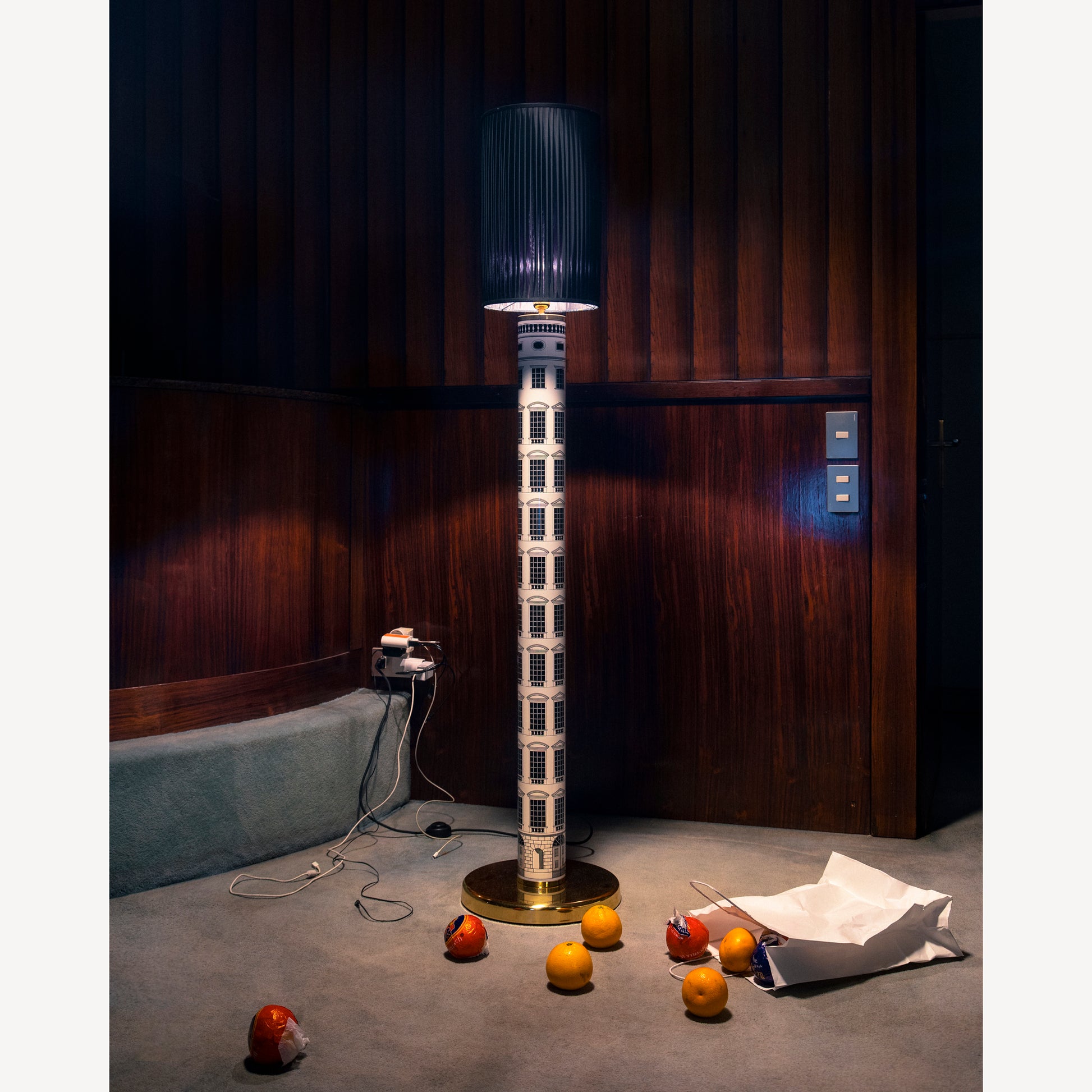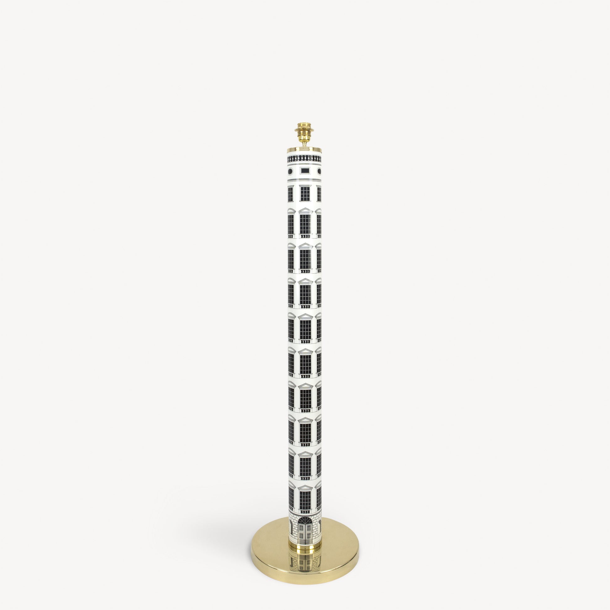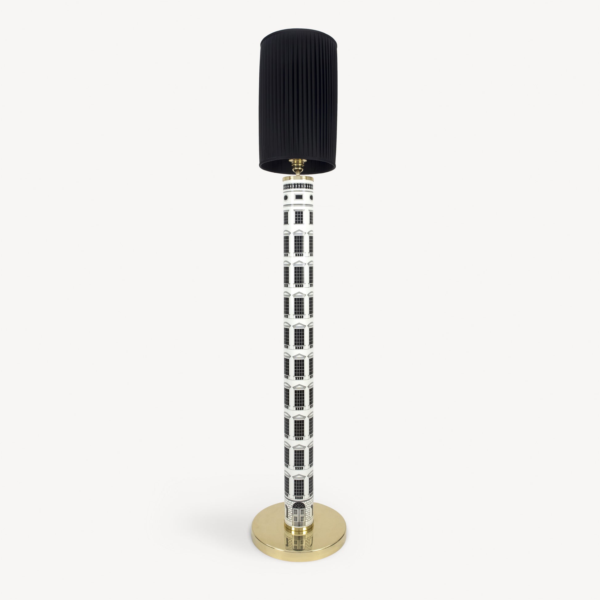 - The architectural decoration makes this hand-silkscreened and decorated floor lamp resemble an imaginative Renaissance skyscraper. Its mere presence illuminates living spaces and environments with wonder.