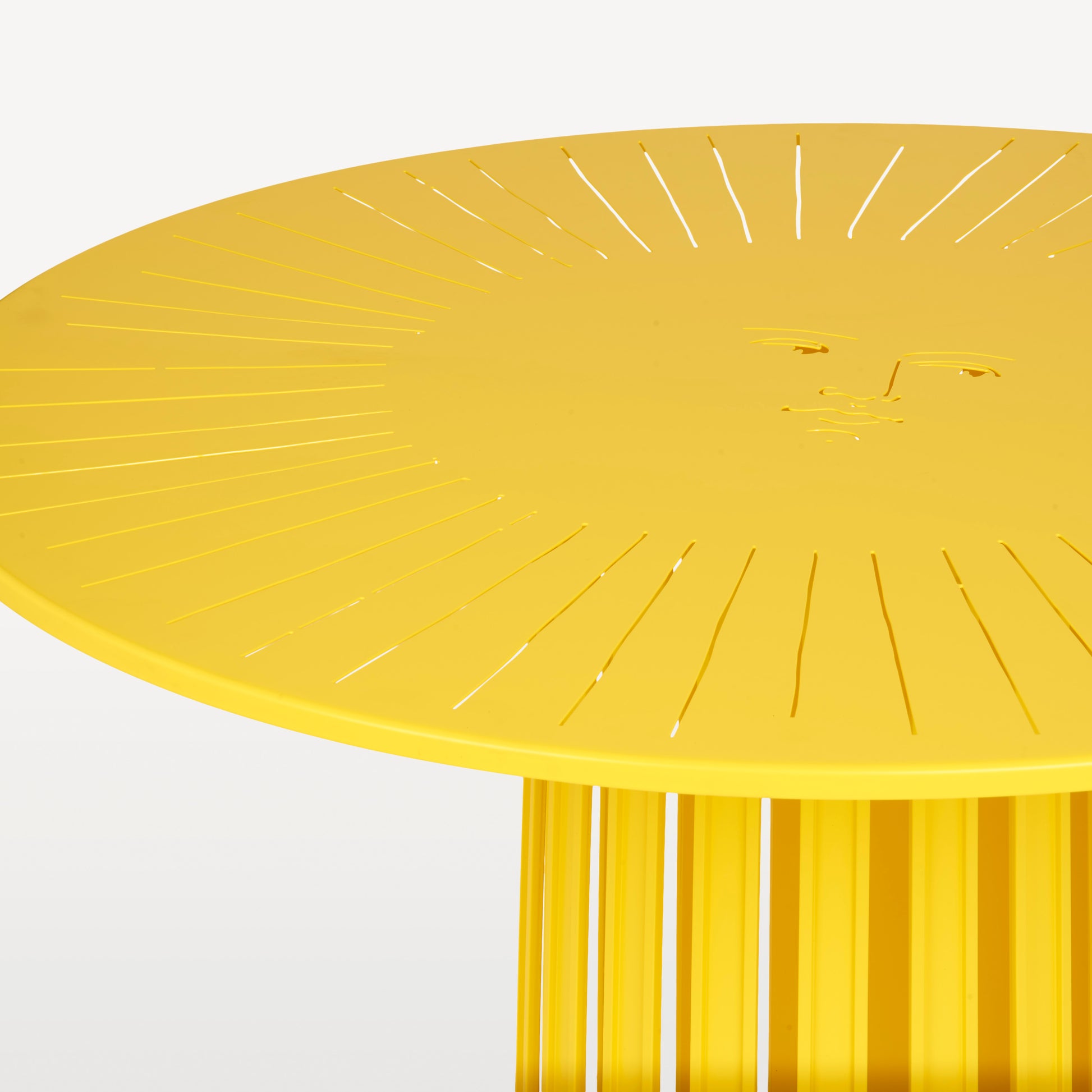 The base of the table recalls the grooves of classical columns, while the unmistakable Fornasetti Sole stands out on the table top.