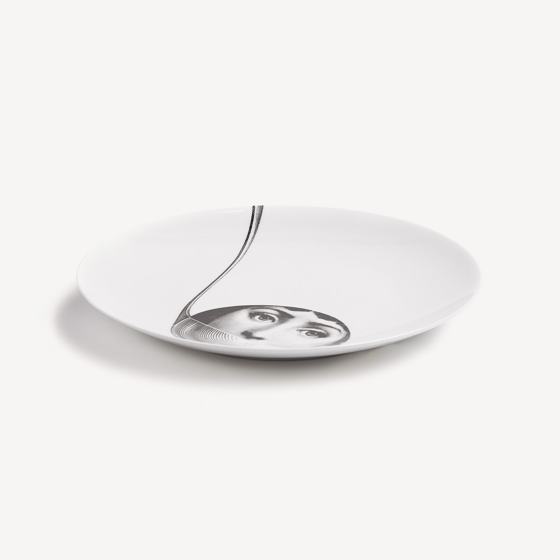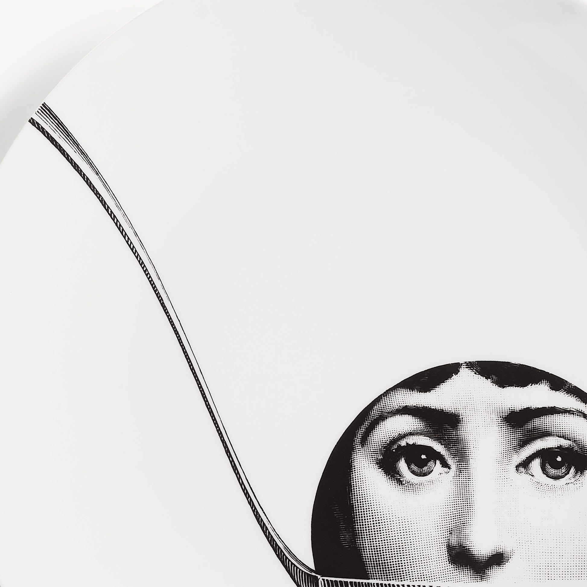 - The face of opera singer Lina Cavalieri, reinterpretated by Piero Fornasetti, adorns this hand-decorated porcelain plate from the iconic Tema e Variazioni series. A true collector's item, you can use it as a wall plate, thanks to the two holes on the back, but also as an ornamental plate for table art. For cleaning, we recommend a damp cloth without any soaps or solvents.
