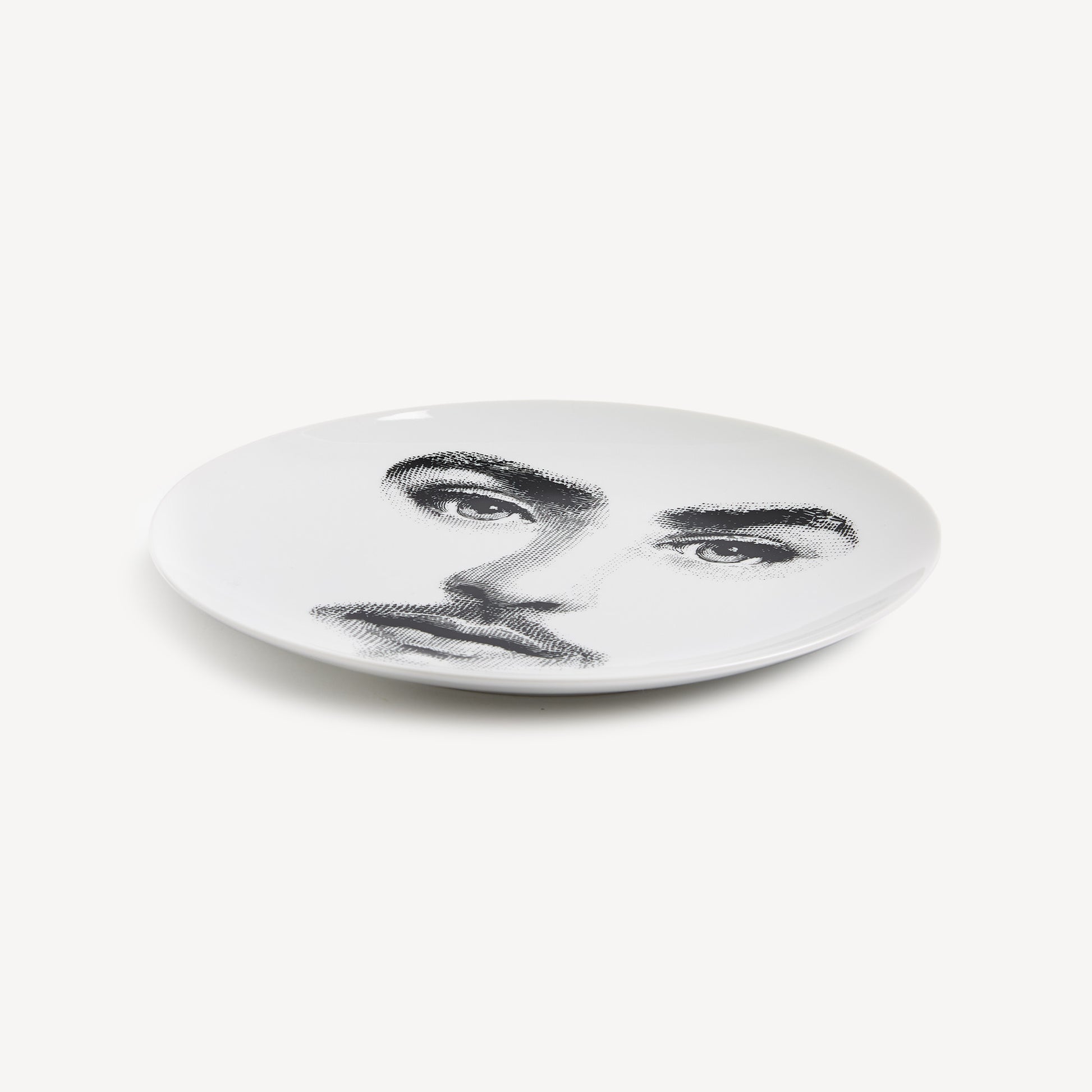 - The face of opera singer Lina Cavalieri, reinterpretated by Piero Fornasetti, adorns this hand-decorated porcelain plate from the iconic Tema e Variazioni series. A true collector's item, you can use it as a wall plate, thanks to the two holes on the back, but also as an ornamental plate for table art. For cleaning, we recommend a damp cloth without any soaps or solvents.
