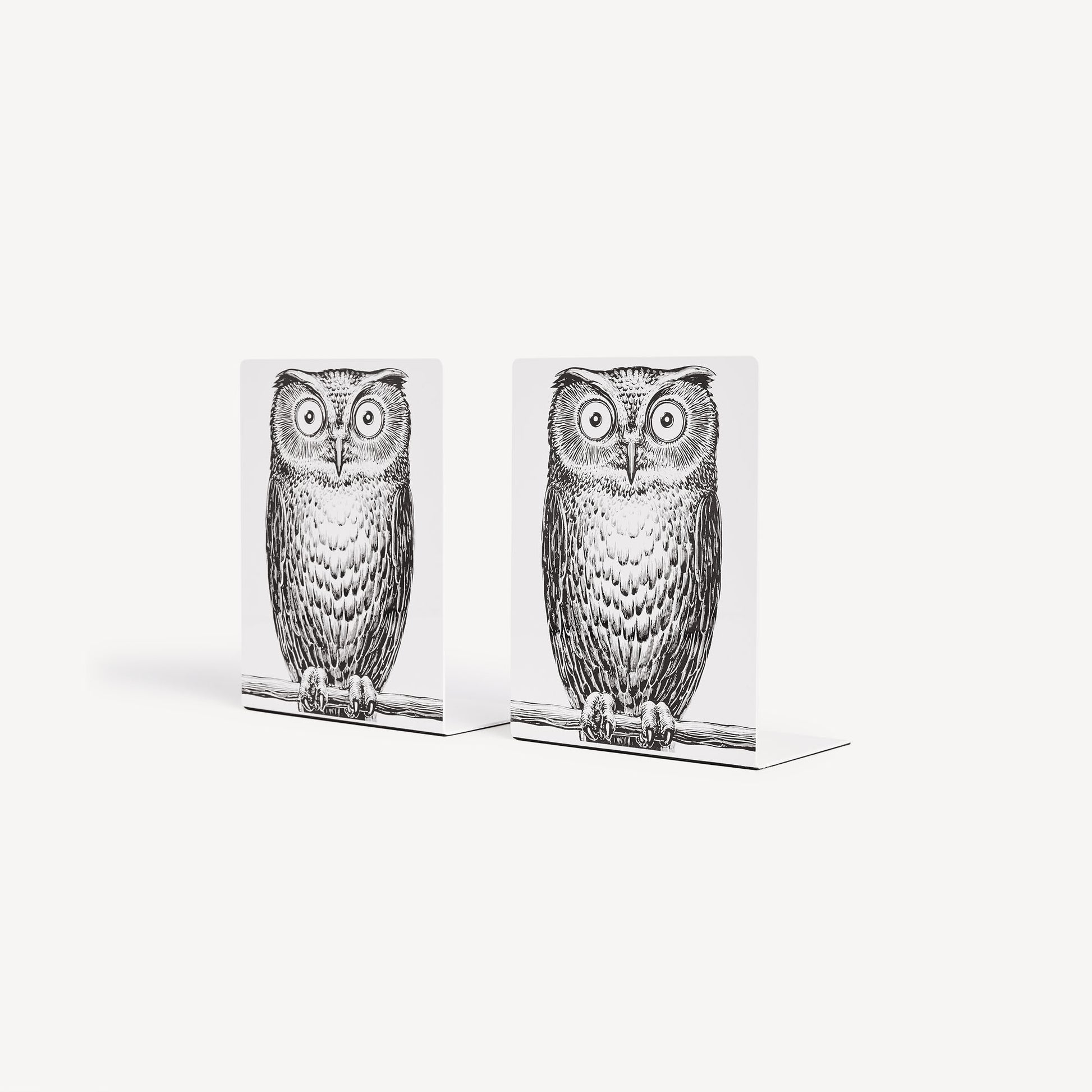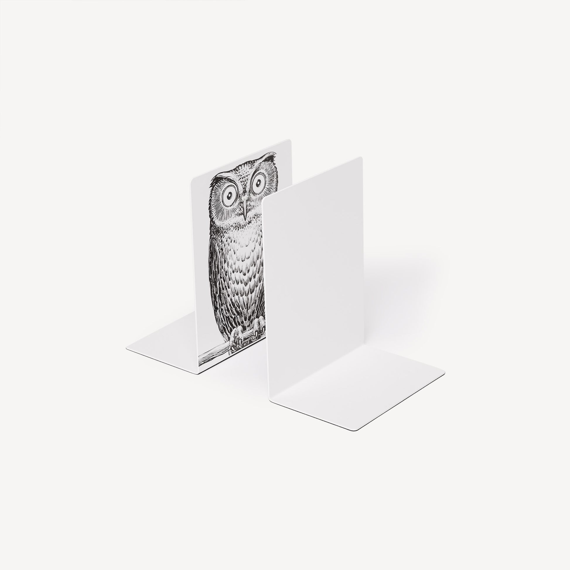 - This pair of hand-silkscreened metal bookends is embellished with the design of two owls: a symbol of foresight for an eye-catching addition to any shelf or countertop.