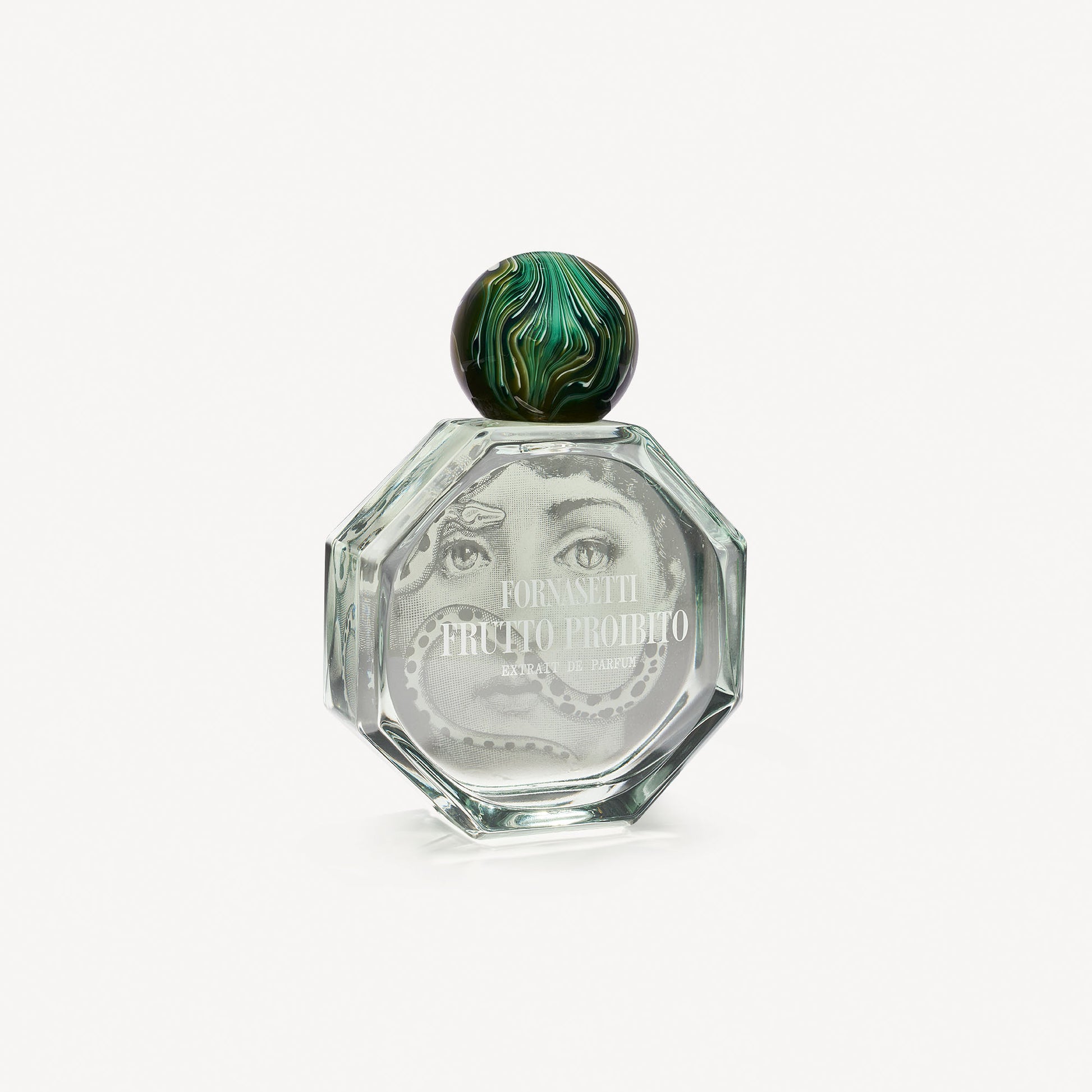 The bottle’s novel octagonal design makes the Fornasetti extrait de parfum a unique object, whilst the green Malachite cap adds an elegant, refined touch.The box plays with the octagonal shape, evoking the design of the bottle.