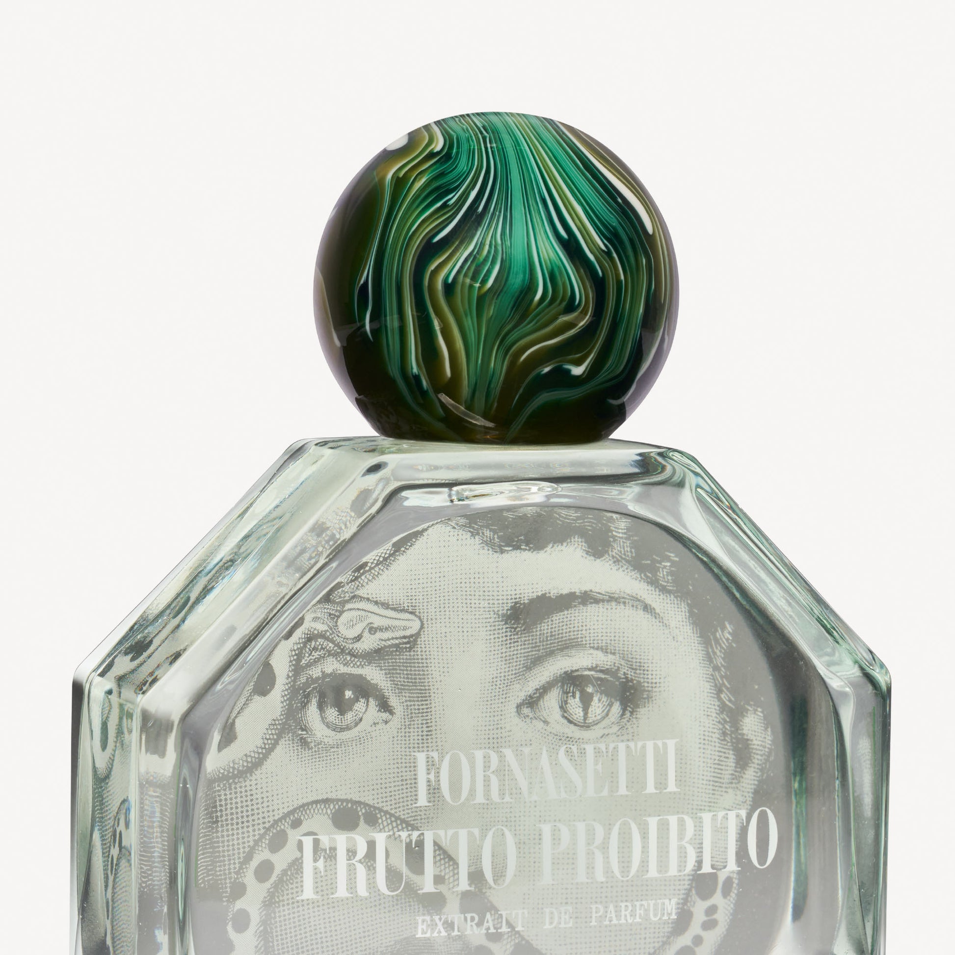 The Frutto Proibito fragrance is visually interpreted by the face of the 19th century opera singer, Lina Cavalieri, who was both a classical beauty with an enigmatic gaze and Fornasetti's muse, and who is now an icon. The woman encounters the temptation of the snake, a reminder of Original Sin.