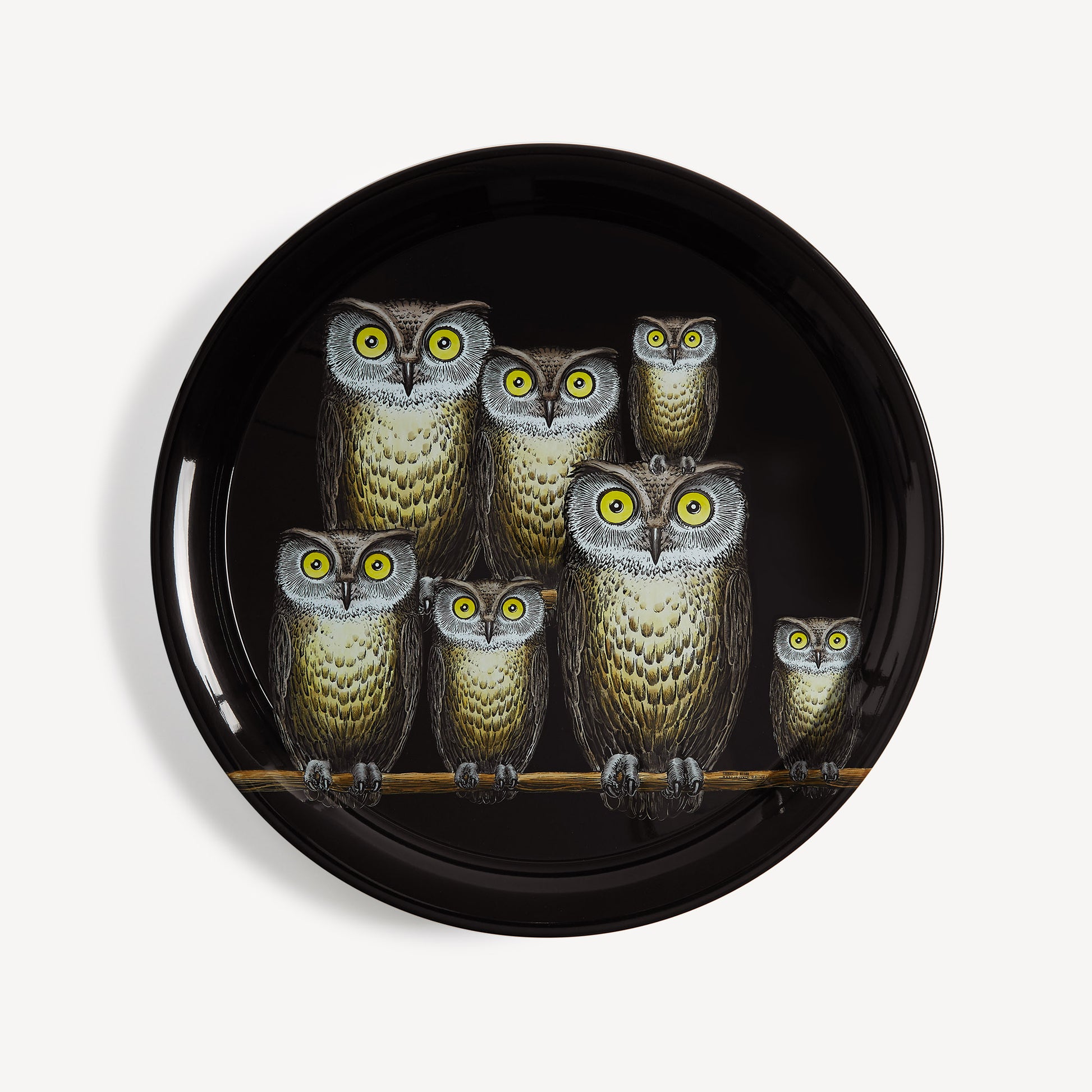 - The circular shape and flat surface give great prominence to the Atelier's decorations. This hand-silkscreened, painted, and lacquered tray depicts a group of austere owls, an animal symbolising foresight. Combined with a foldable stand, the tray can be transformed into a coffee table.