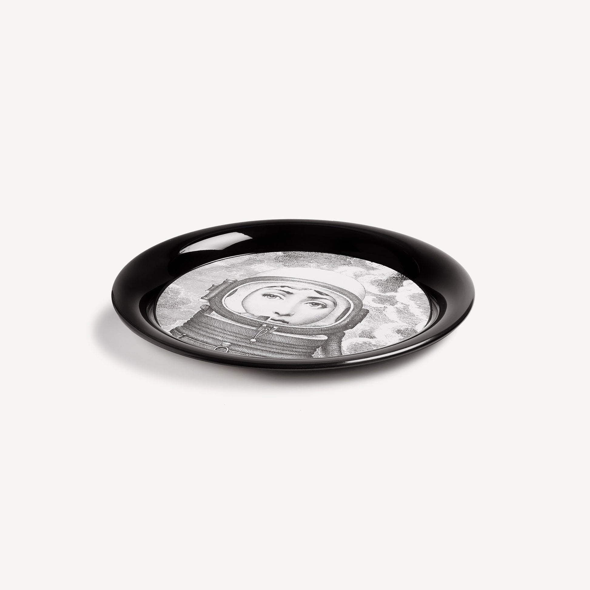 - The circular shape and flat surface give great prominence to the Atelier's decorations. This hand-decorated tray interprets Lina Cavalieri's face in an unusual and ironic way. Combined with a foldable stand, the tray can be transformed into a coffee table.
