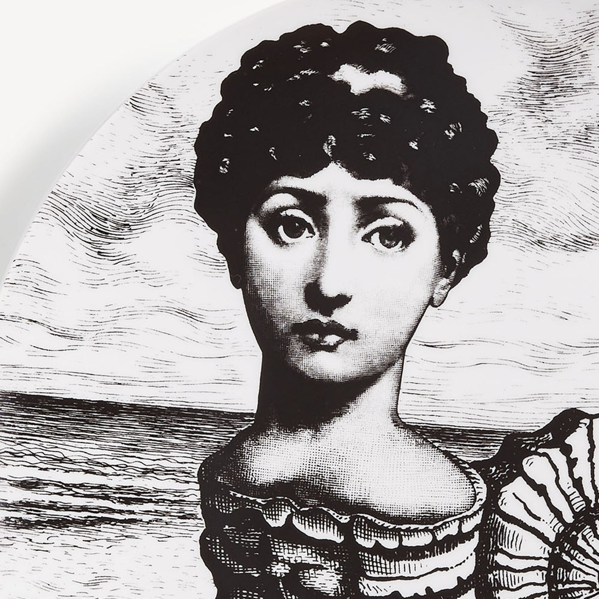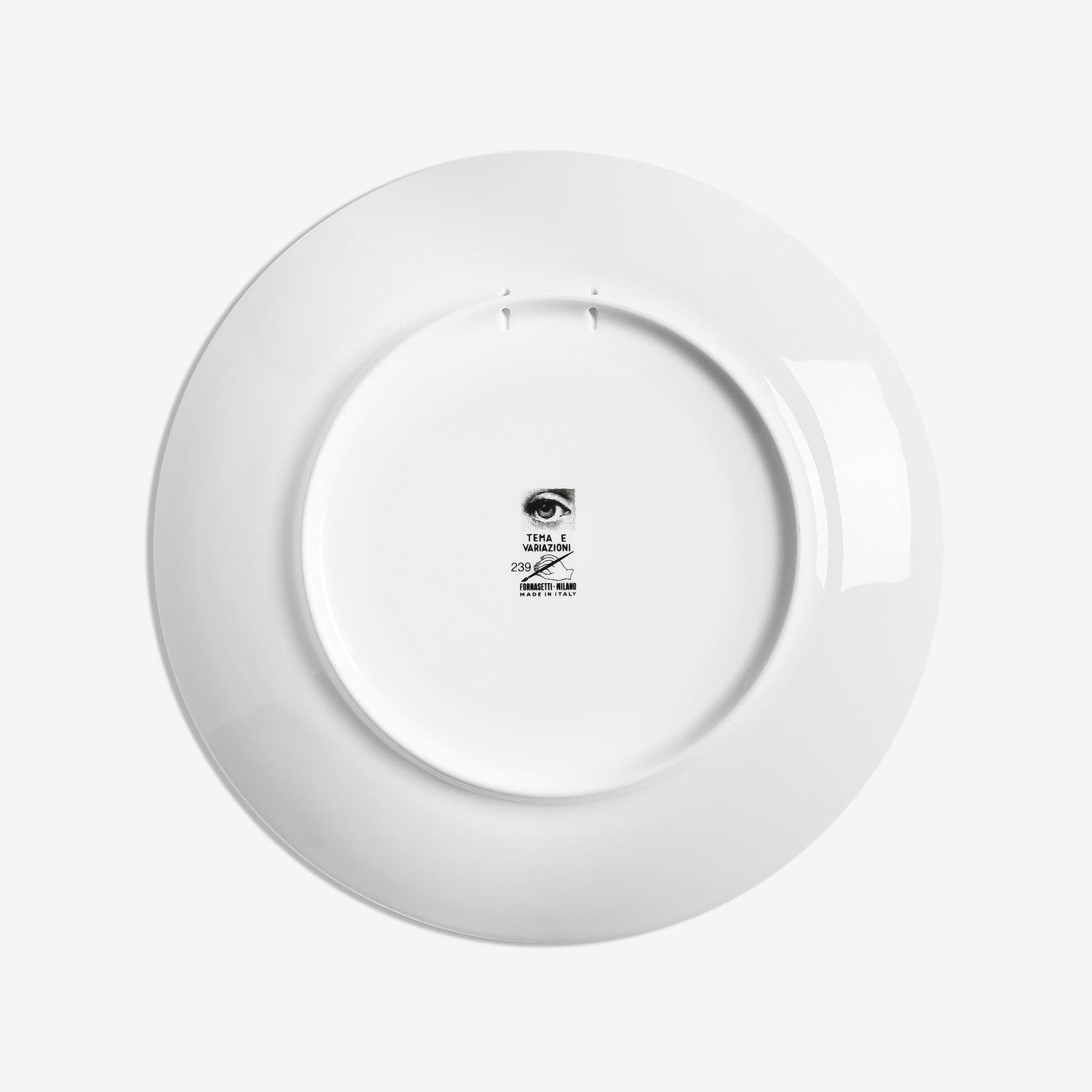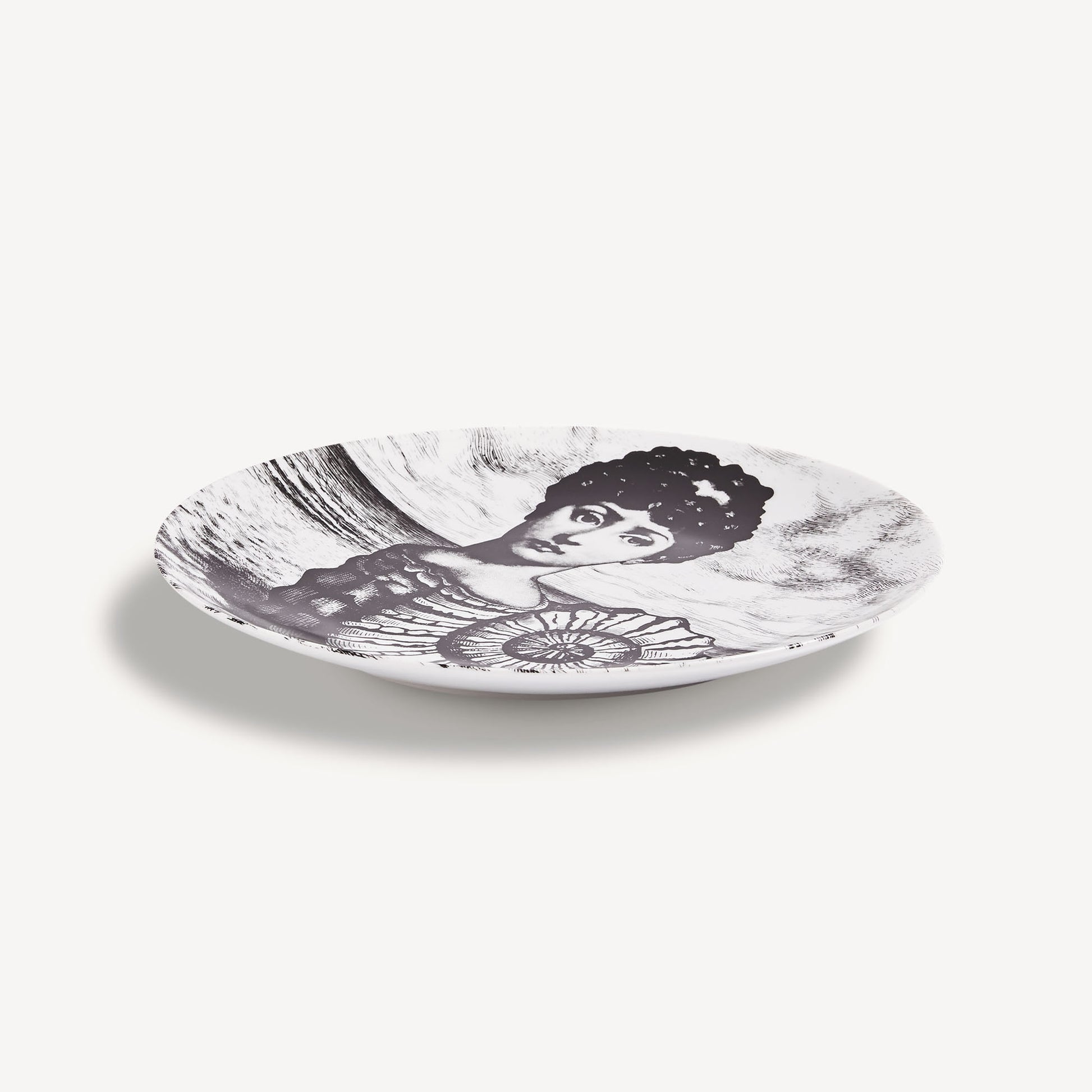 - The unmistakable features of Lina Cavalieri's face, playfully reinterpreted by Fornasetti, provide the inspiration for the Tema e Variazioni series to which this hand-decorated porcelain plate belongs. A true collector's item, you can use this creation as a wall plate, thanks to the two holes on the back, but also as an ornamental piece for table art. For cleaning, we recommend a damp cloth without any soaps or solvents.