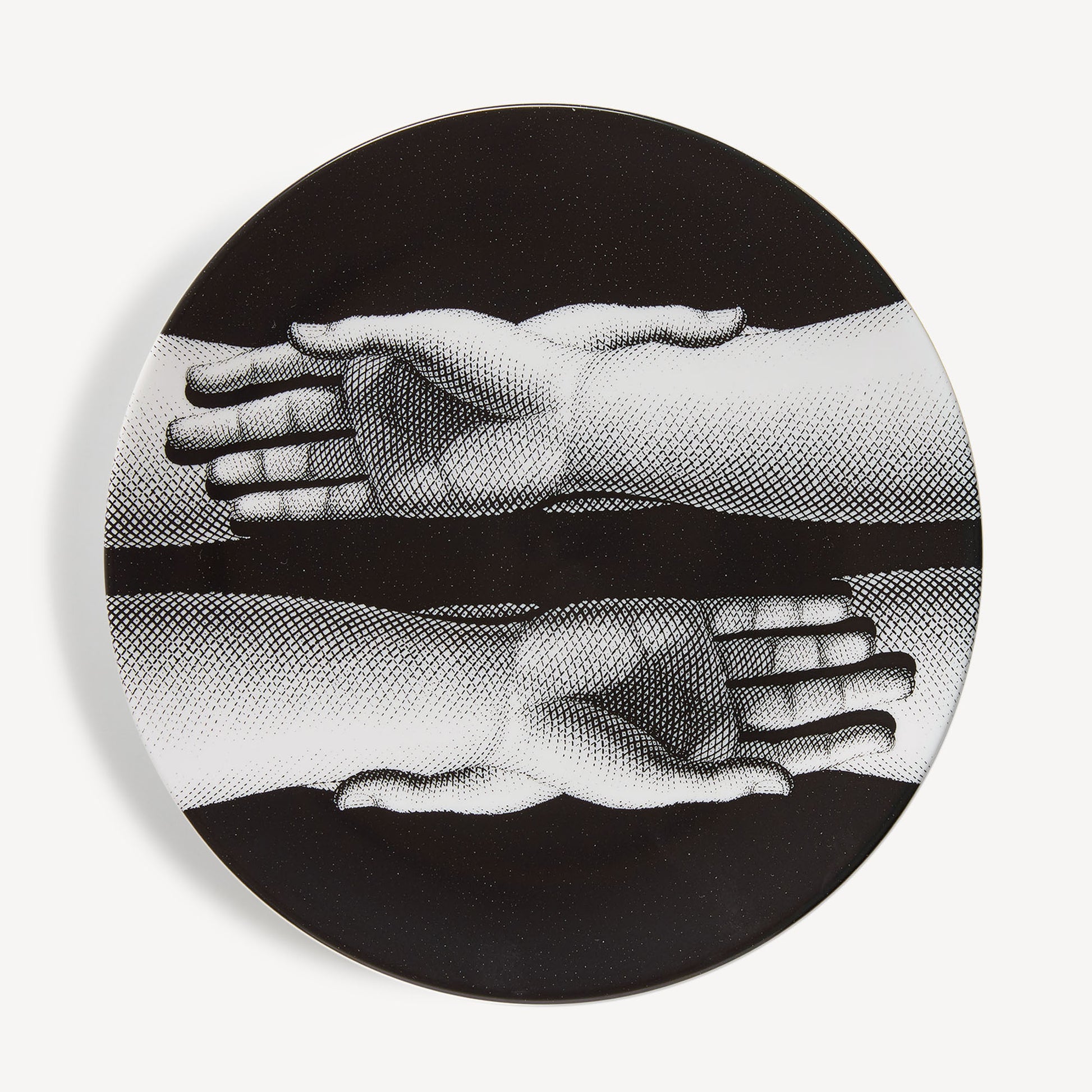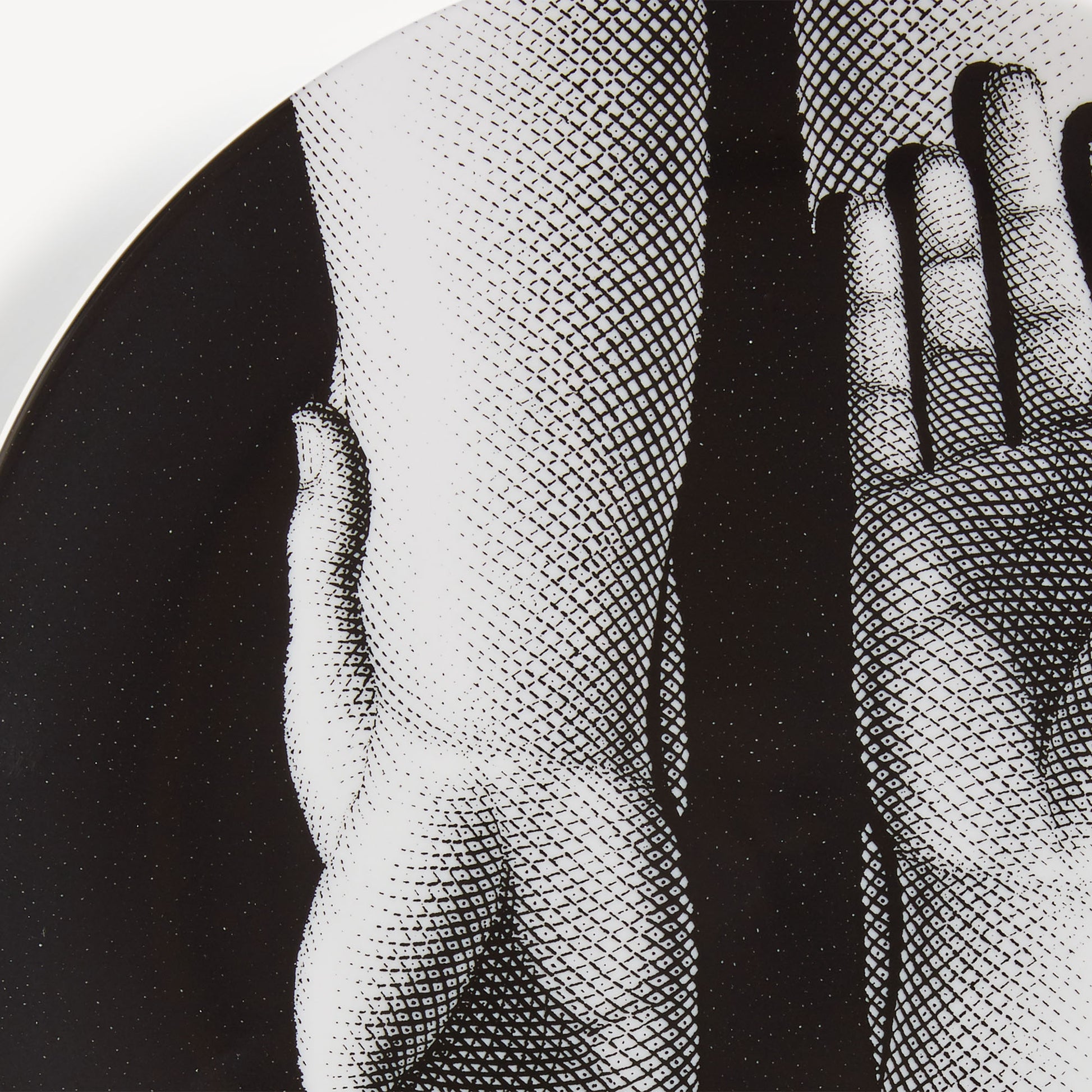 - The Fornasetti motif of the hands characterises this elegant hand-decorated porcelain plate: a true collector's item, which you can use as an ornament for table art. For cleaning, we recommend a damp cloth without any soaps or solvents.