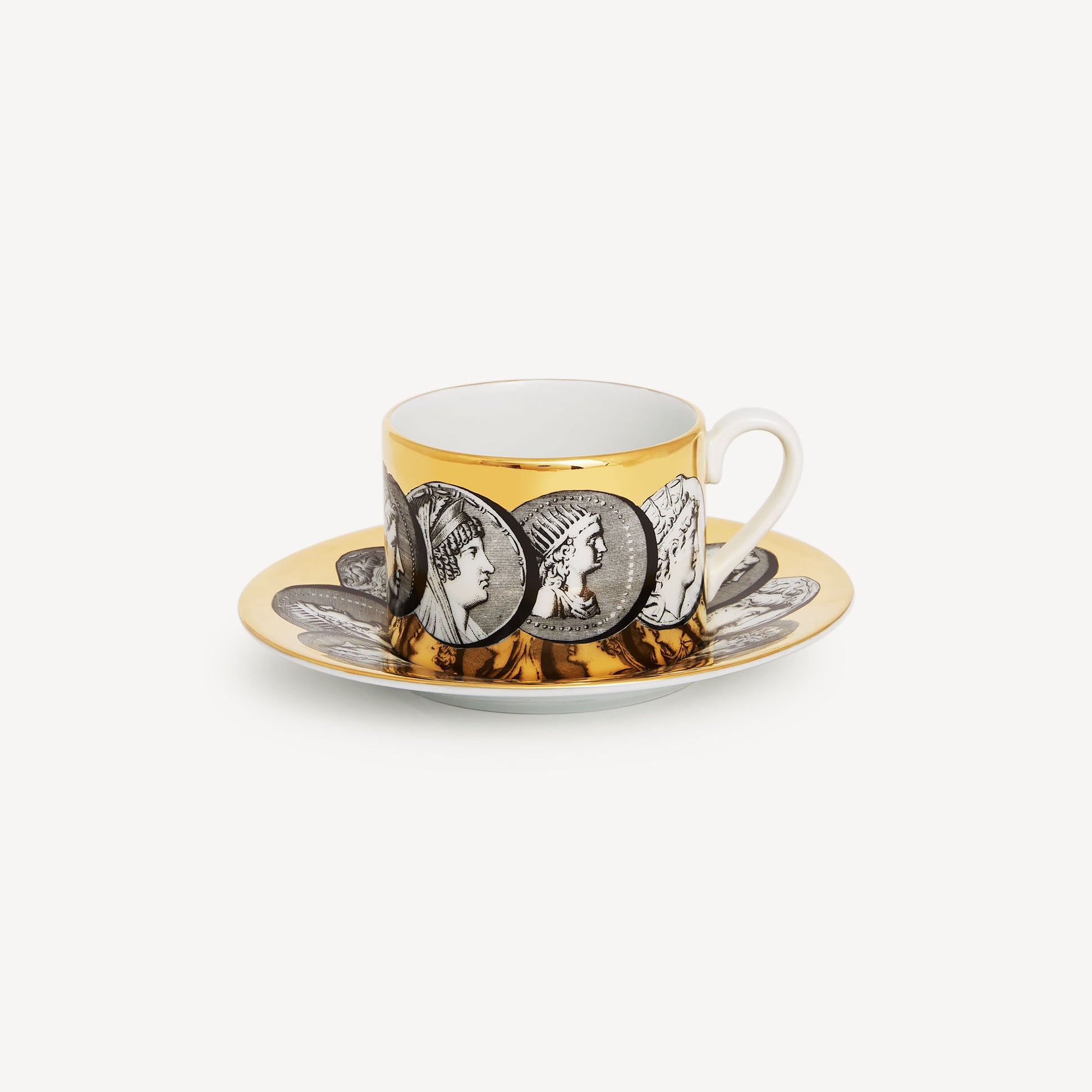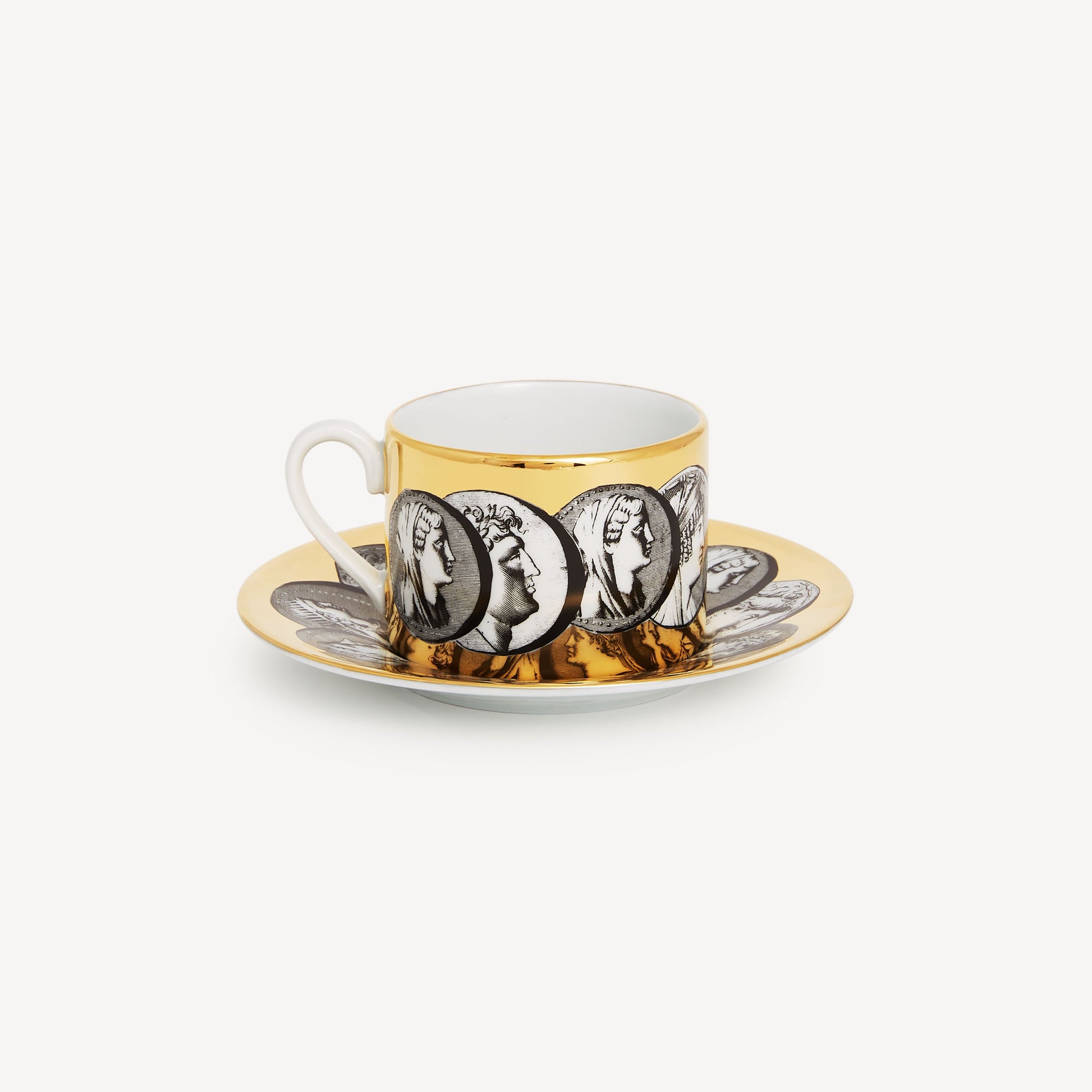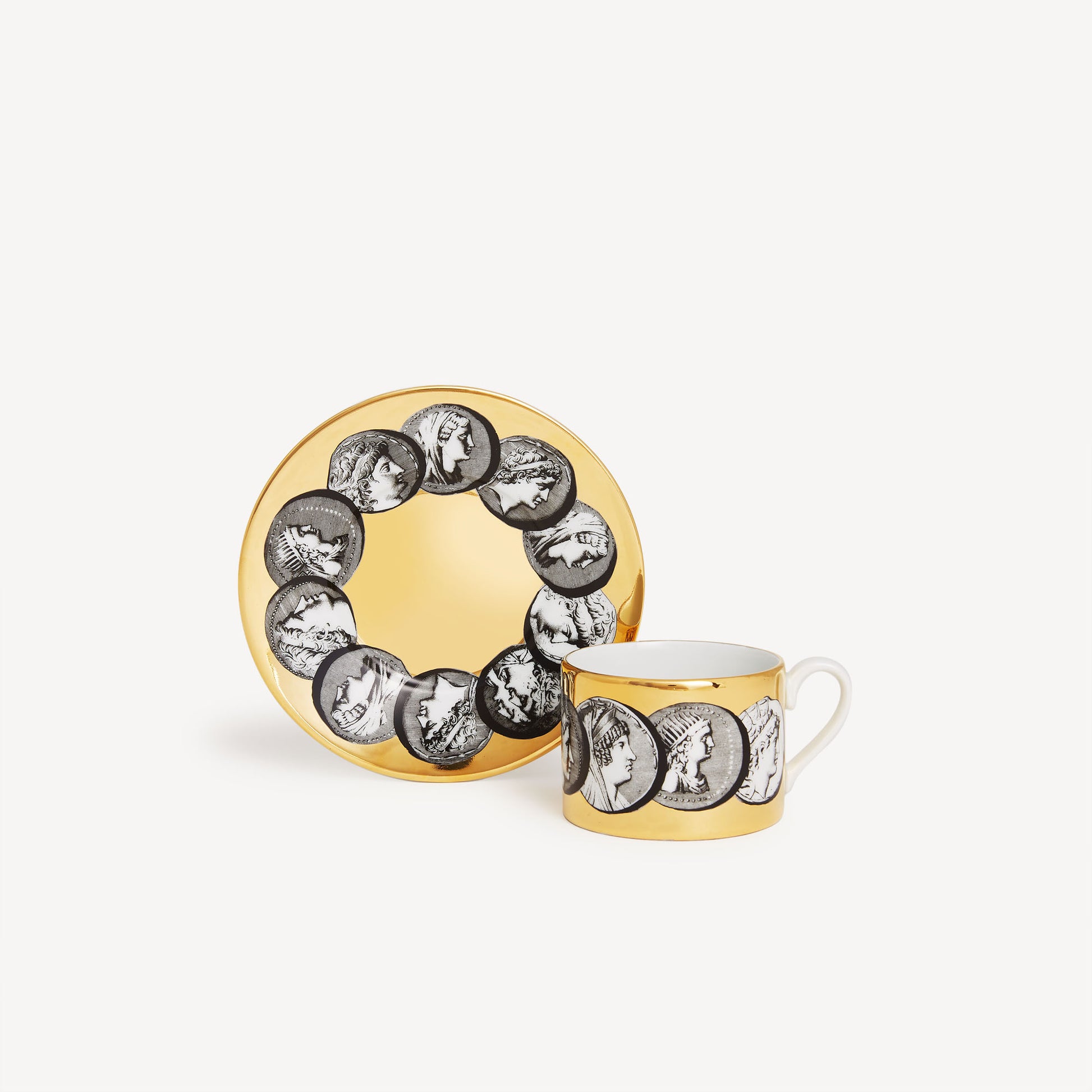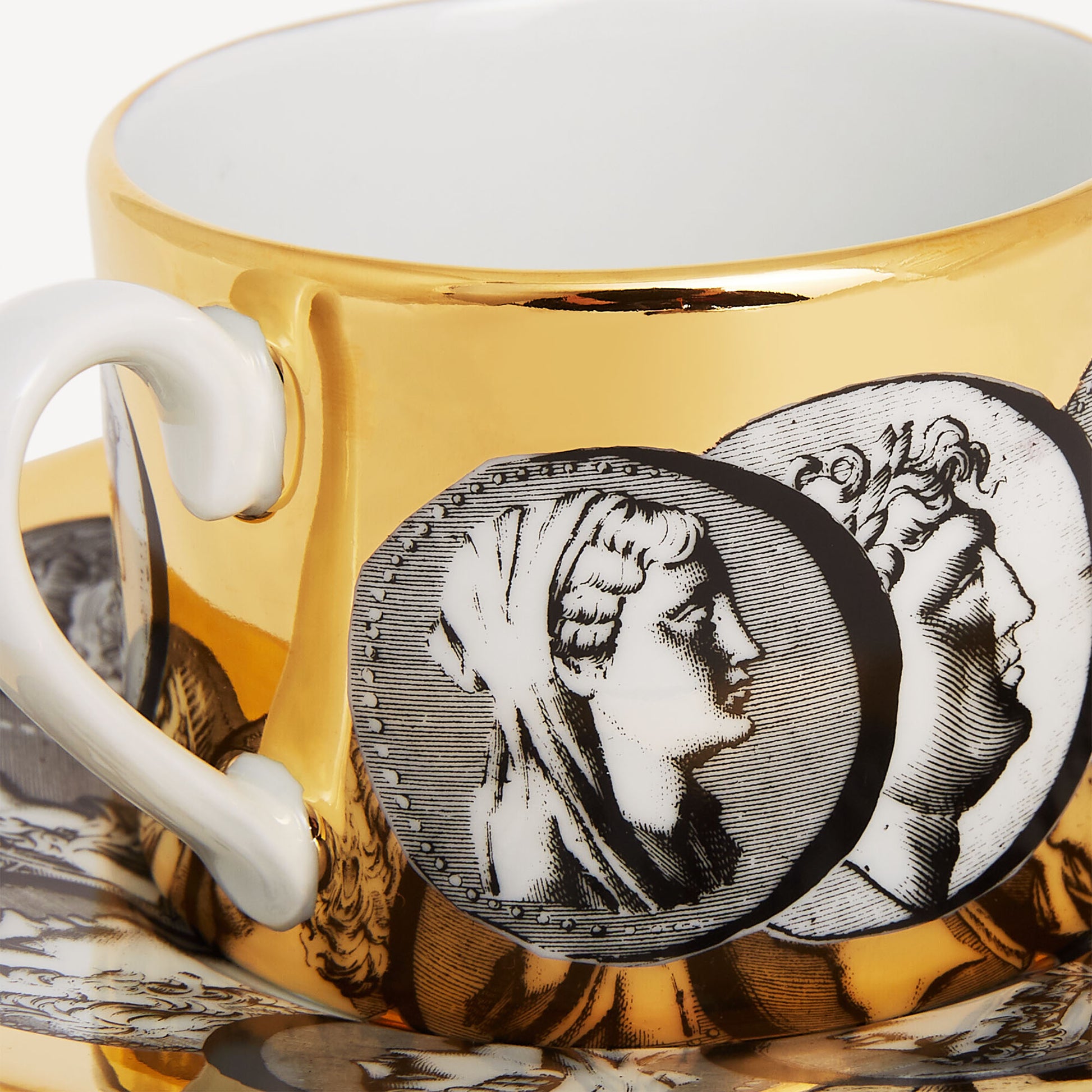 - Elegant numismatic motifs cover this hand-decorated porcelain teacup with gold accents, transferring Fornasetti's imagery to an object for daily use and thereby turning it into a collector's item.