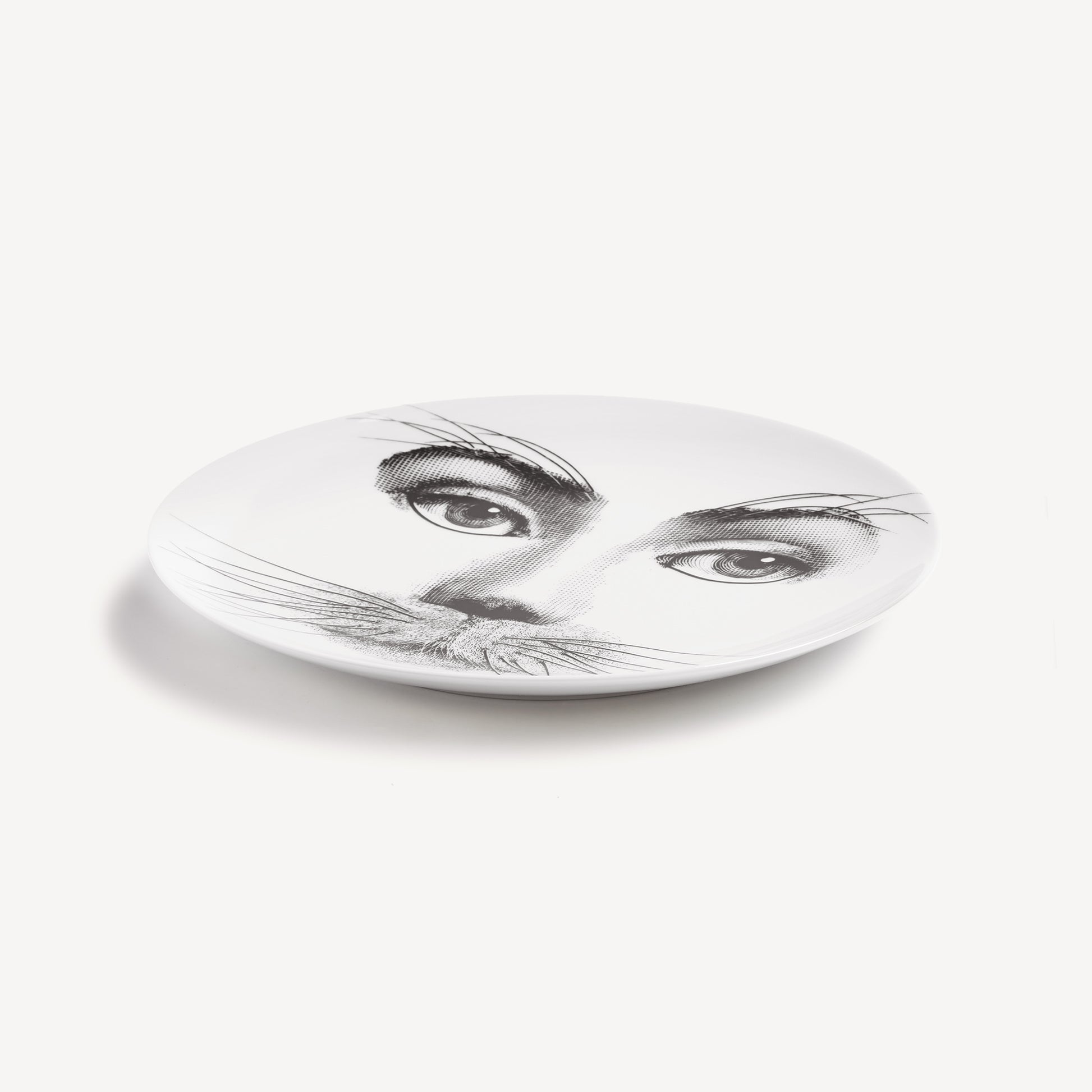 - The unmistakable features of Lina Cavalieri's face, playfully reinterpreted by Fornasetti, provide the inspiration for the Tema e Variazioni series to which this hand-decorated porcelain plate belongs. A true collector's item, you can use this creation as a wall plate, thanks to the two holes on the back, but also as an ornamental piece for table art. For cleaning, we recommend a damp cloth without any soaps or solvents.