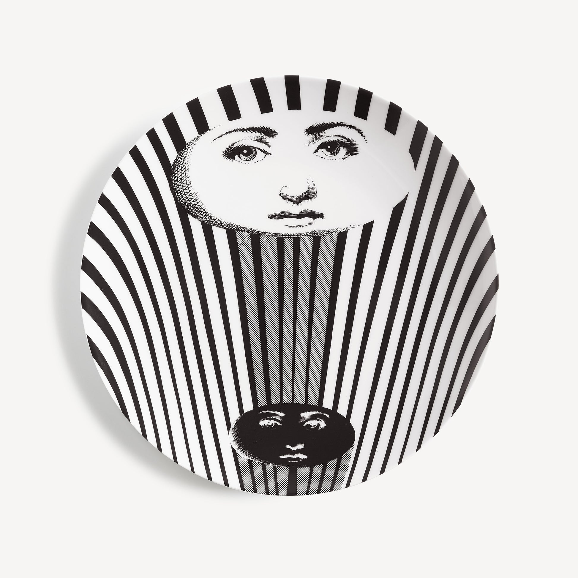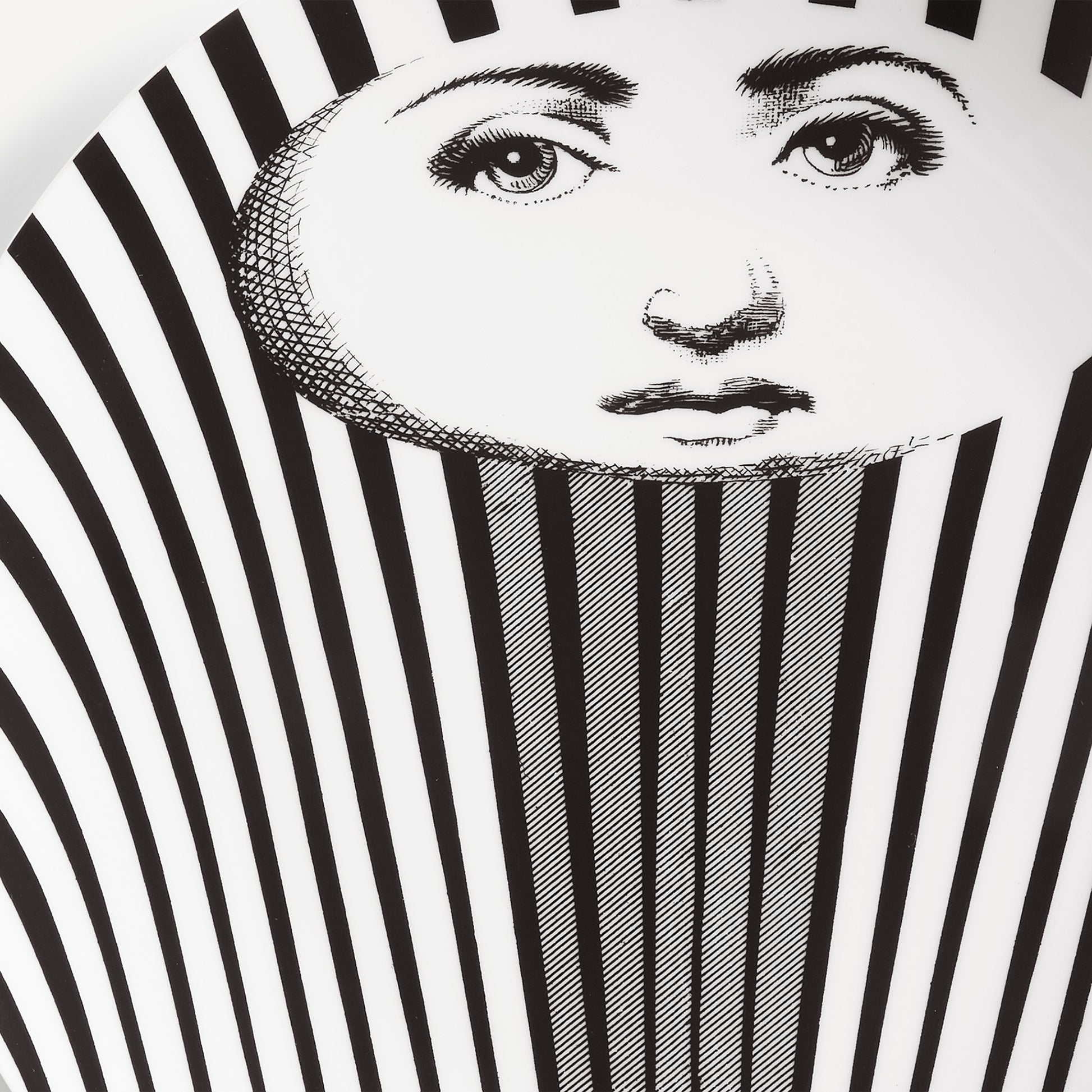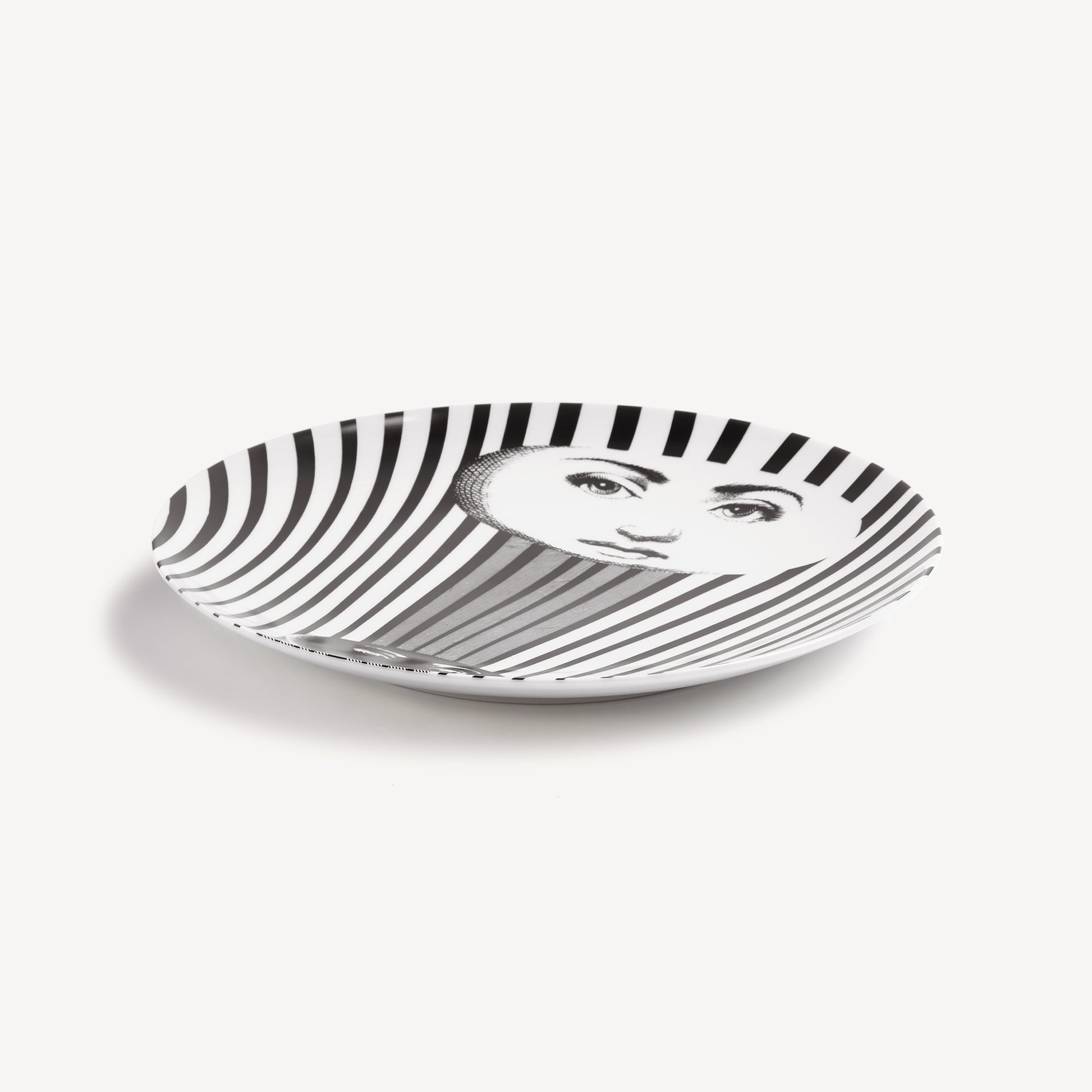 - The unmistakable features of Lina Cavalieri's face, playfully reinterpreted by Fornasetti, provide the inspiration for the Tema e Variazioni series to which this hand-decorated porcelain plate belongs. A true collector's item, you can use this creation as a wall plate, thanks to the two holes on the back, but also as an ornamental piece for table art. For cleaning, we recommend a damp cloth without any soaps or solvents.