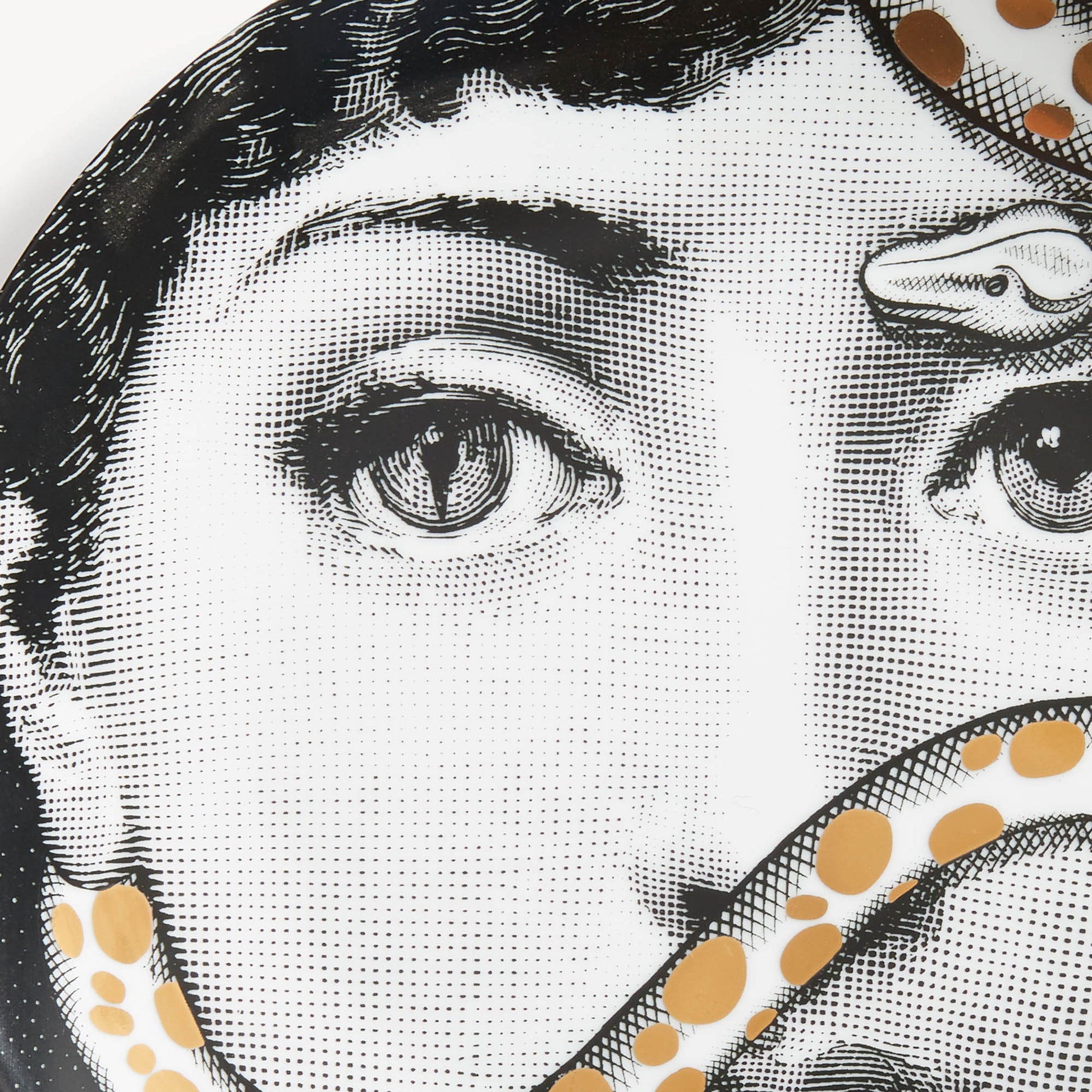 - The face of opera singer Lina Cavalieri, reinterpretated by Piero Fornasetti, adorns this hand-decorated porcelain plate with gold accents from the iconic Tema e Variazioni series. A true collector's item, you can use it as a wall plate, thanks to the two holes on the back, but also as an ornamental plate for table art. For cleaning, we recommend a damp cloth without any soaps or solvents.
