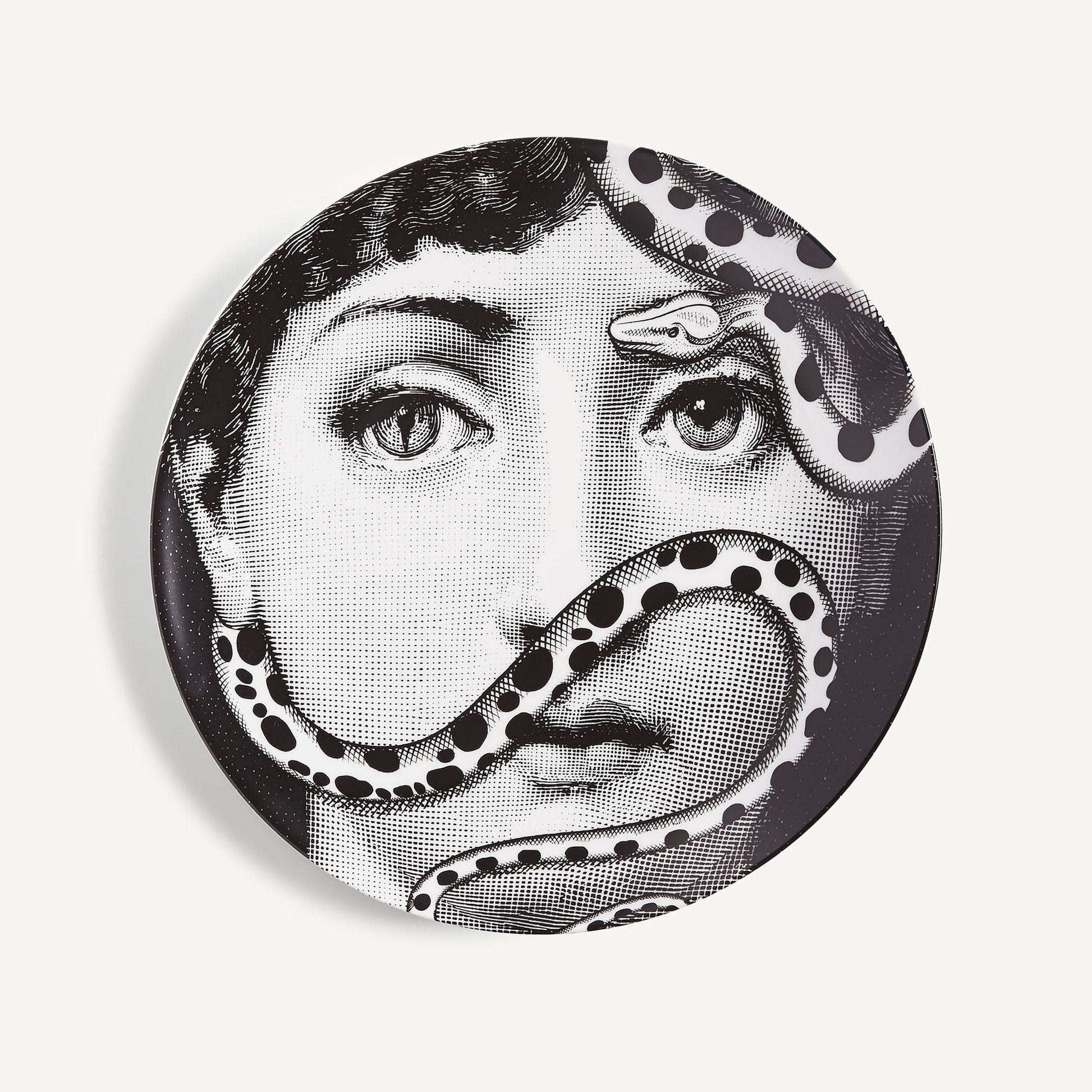 - The unmistakable features of Lina Cavalieri's face, playfully reinterpreted by Fornasetti, provide the inspiration for the Tema e Variazioni series to which this hand-decorated porcelain plate belongs. A true collector's item, you can use this creation as a wall plate, thanks to the two holes on the back, but also as an ornamental piece for table art. For cleaning, we recommend a damp cloth without any soaps or solvents.