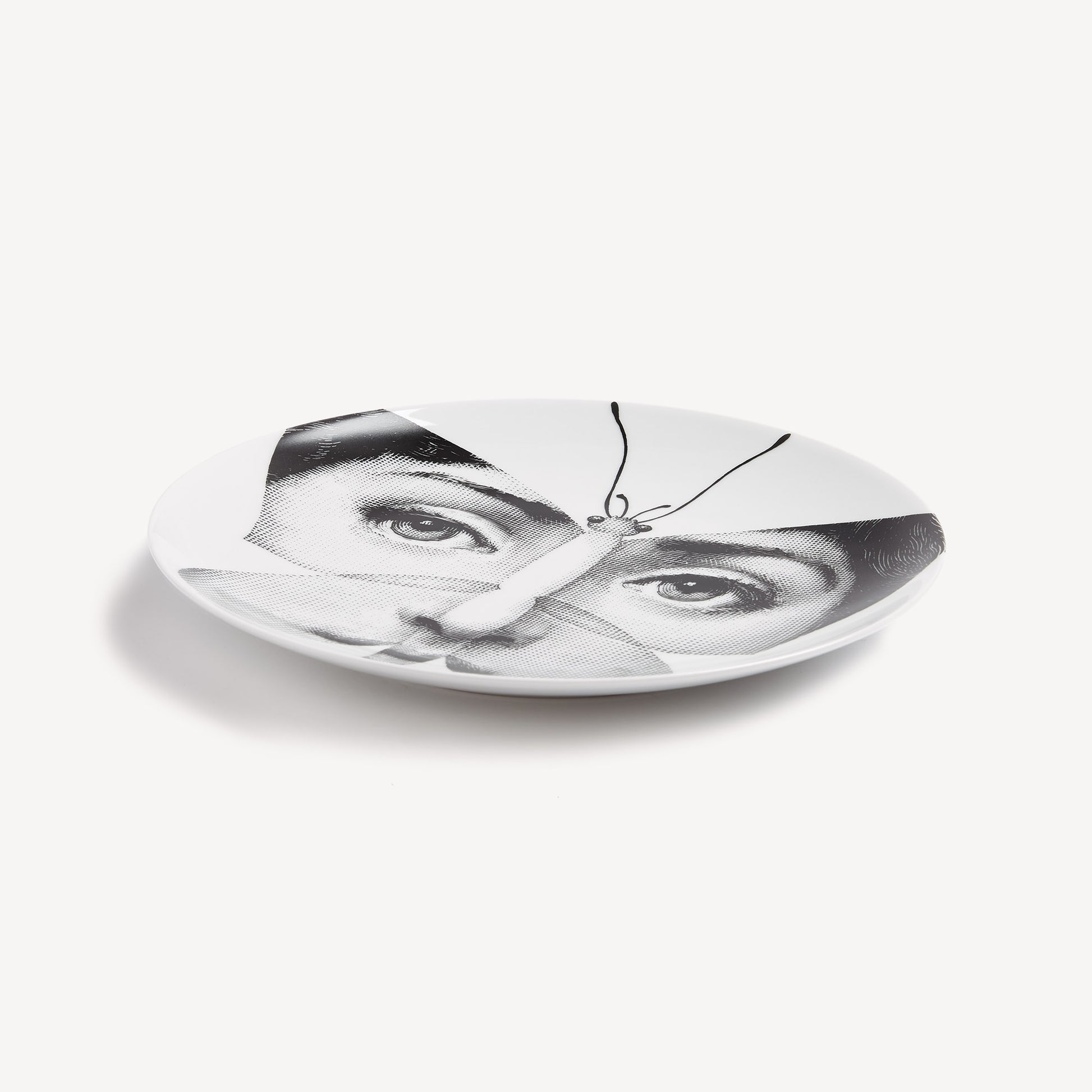 - The face of opera singer Lina Cavalieri, reinterpretated by Piero Fornasetti, adorns this hand-decorated porcelain plate from the iconic Tema e Variazioni series. A true collector's item, you can use it as a wall plate, thanks to the two holes on the back, but also as an ornamental plate for table art. For cleaning, we recommend a damp cloth without any soaps or solvents.
