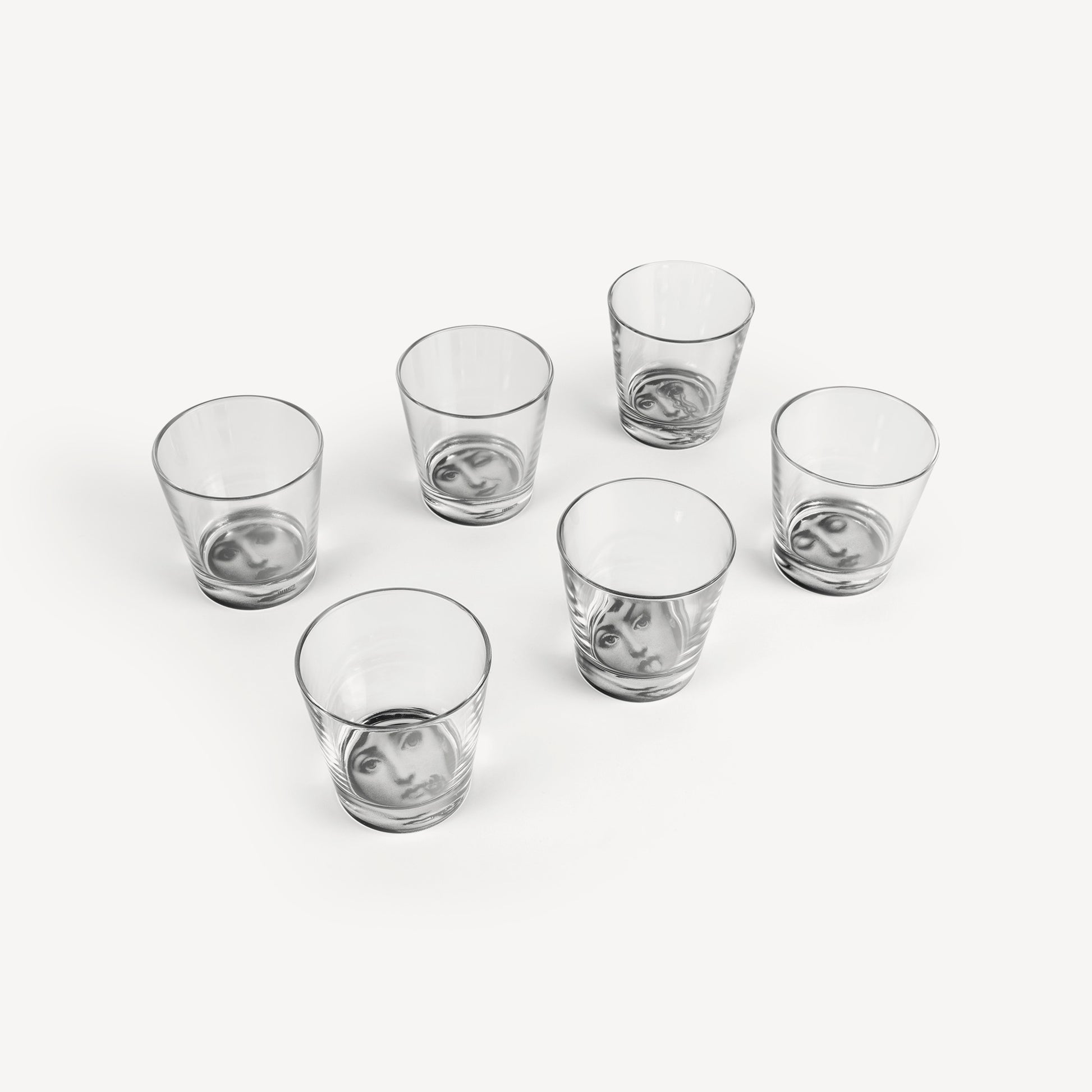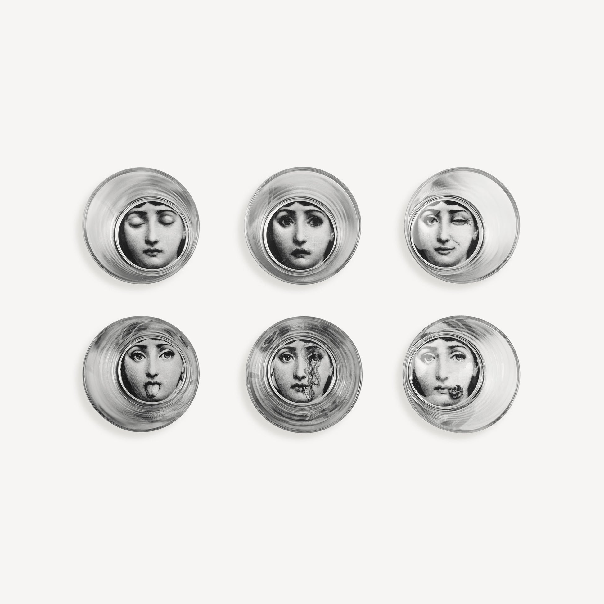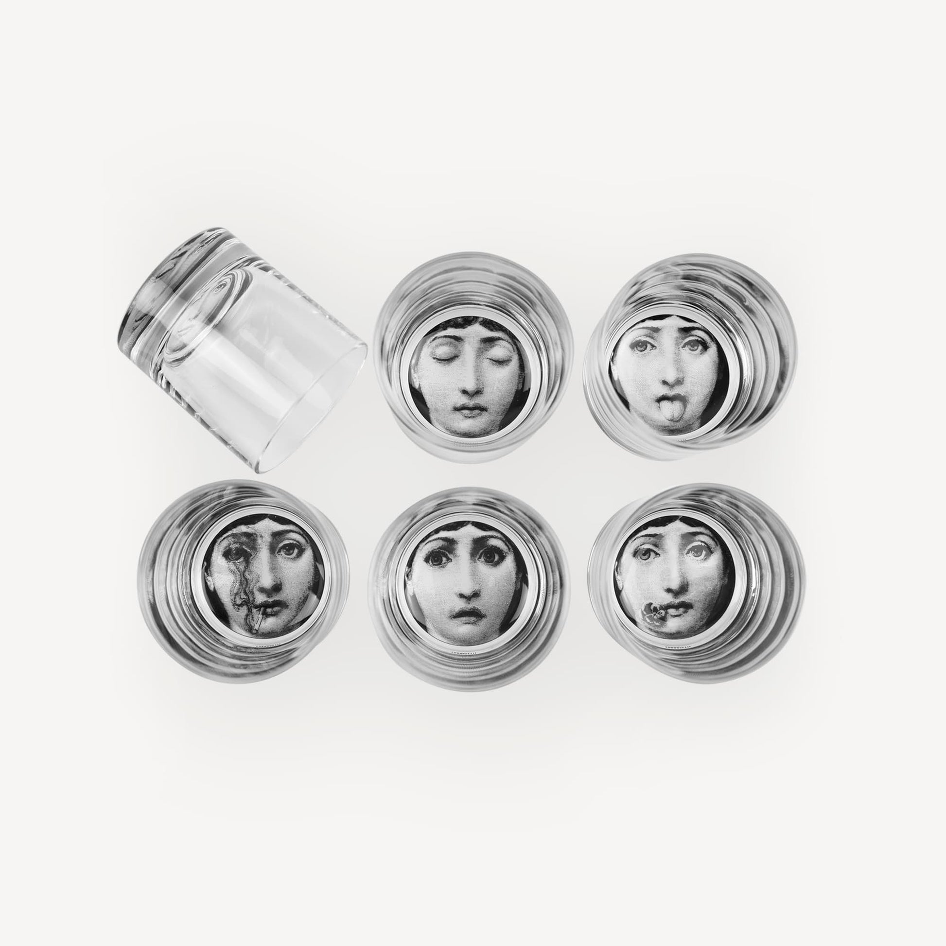 - The Fornasetti set of six glasses combines the linear design with the unmistakable Tema e Variazioni décor.