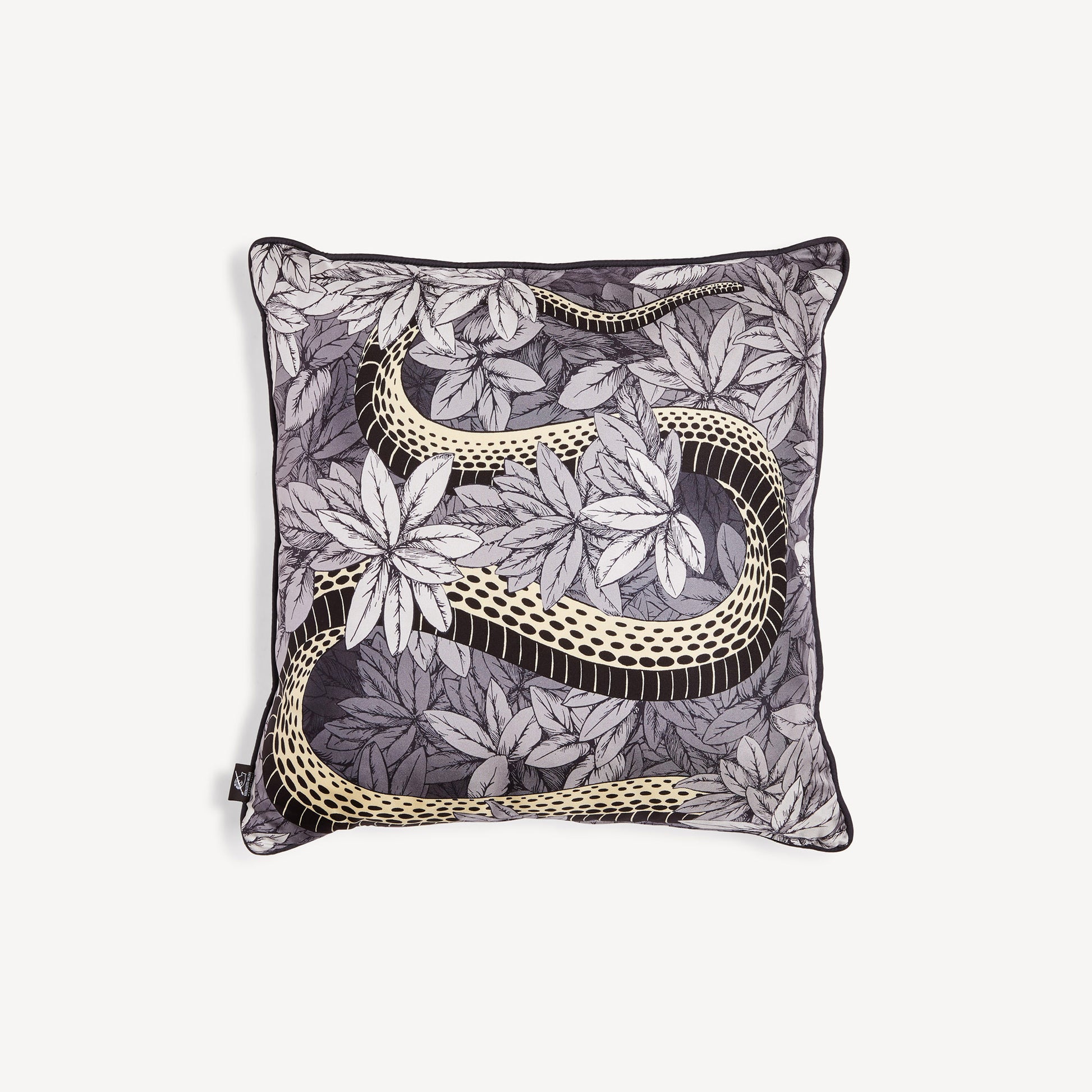 - The sinuous forms of a tempting snake intersect a bed of leaves. Depicting an eternal symbol of seduction, the decoration embellishes this cushion with a removable cover (and padding): a true collector's item.