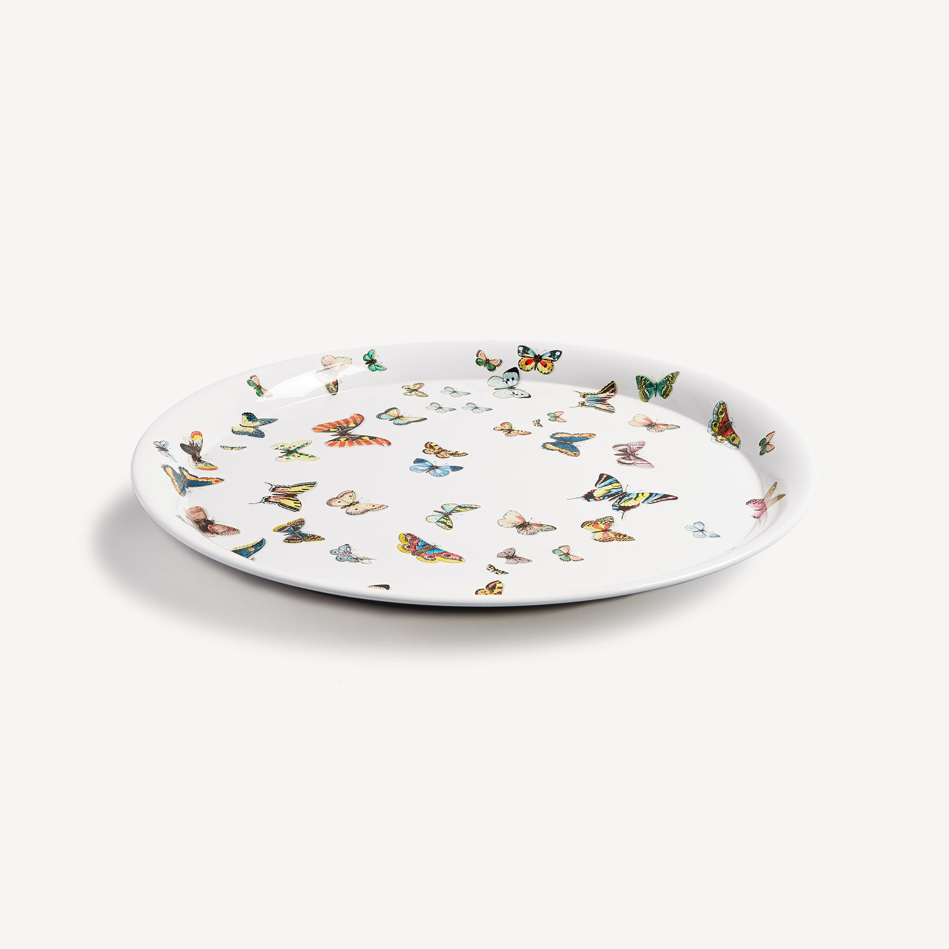 - The circular shape and flat surface give great prominence to the Atelier's decorations. This hand-silkscreened, painted, and lacquered tray is embellished by the graceful flight of a swarm of colourful butterflies. Combined with a foldable stand, the tray can be transformed into a coffee table.