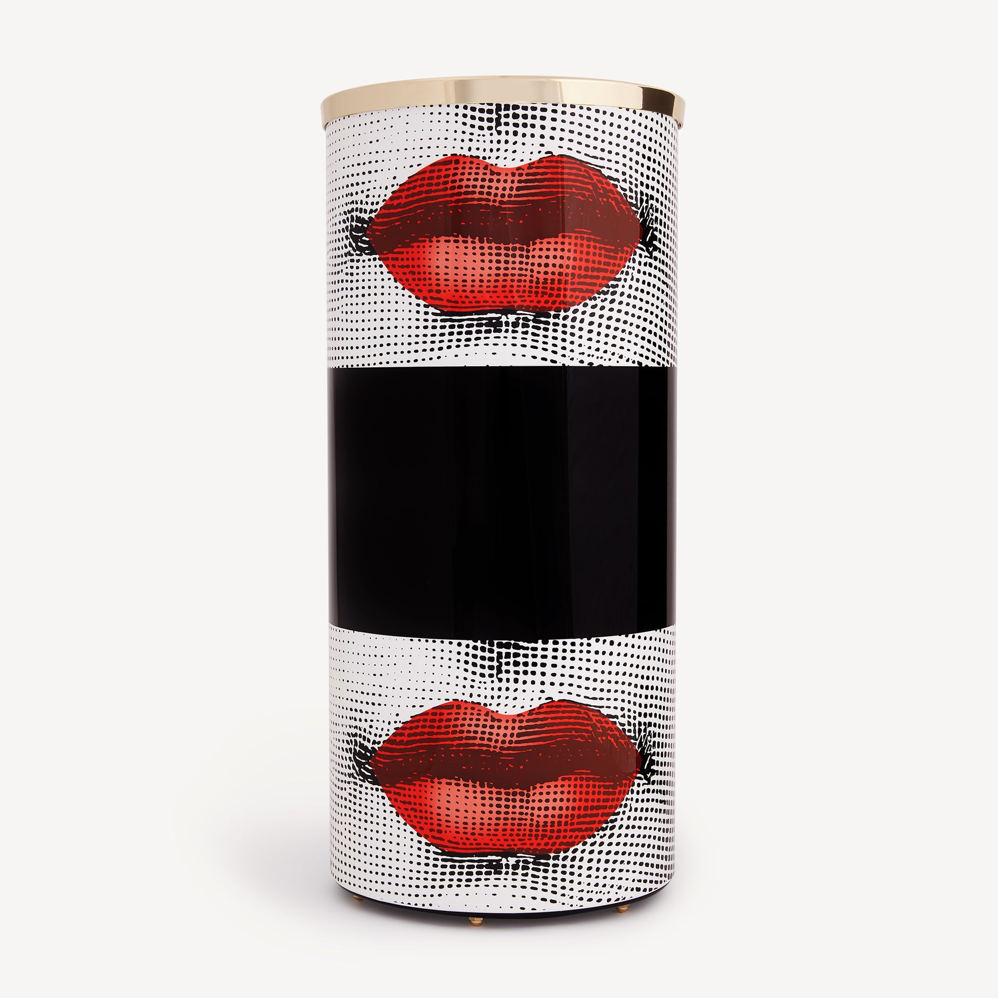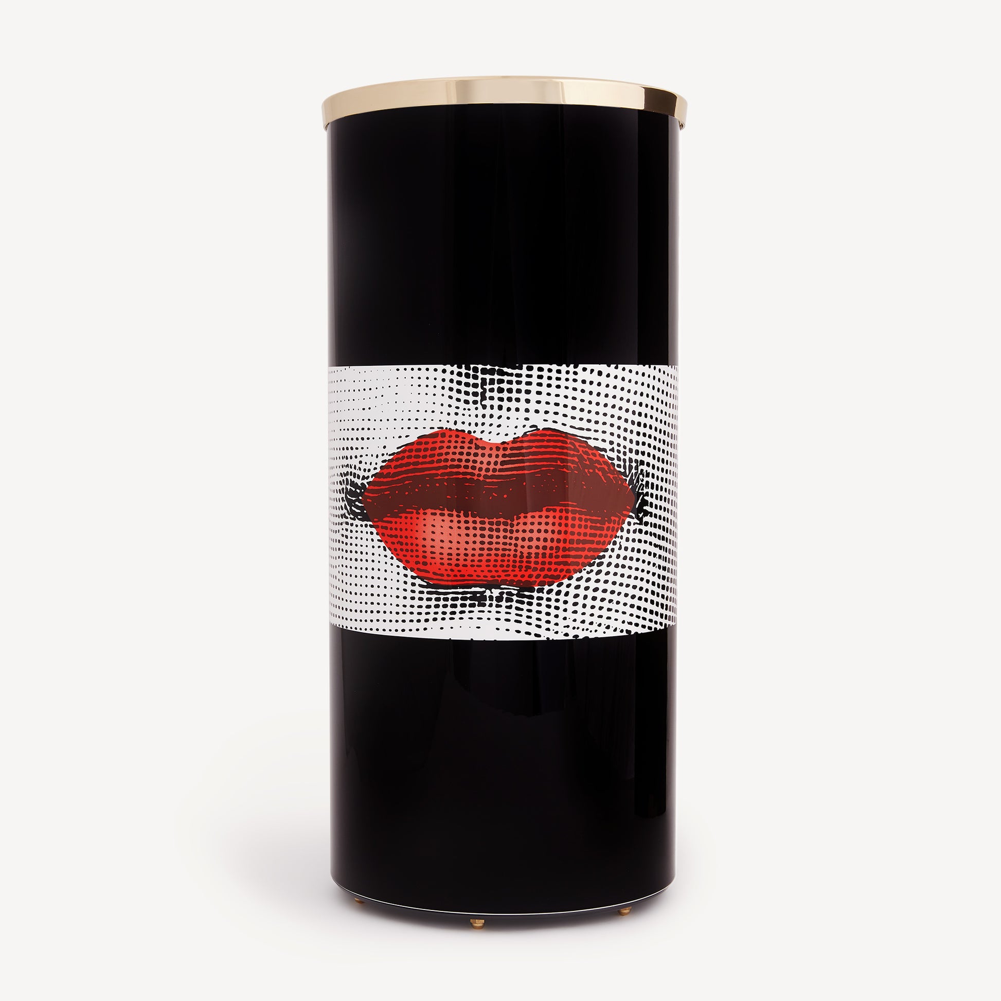 - Adorned with the painted lips of Fornasetti's muse Lina Cavalieri, this hand-silkscreened and lacquered metal umbrella stand, with a brass top rim and feet, gives a provocative and unmistakable touch to your environment. For cleaning, we recommend using a damp cloth without any soaps or solvents.
