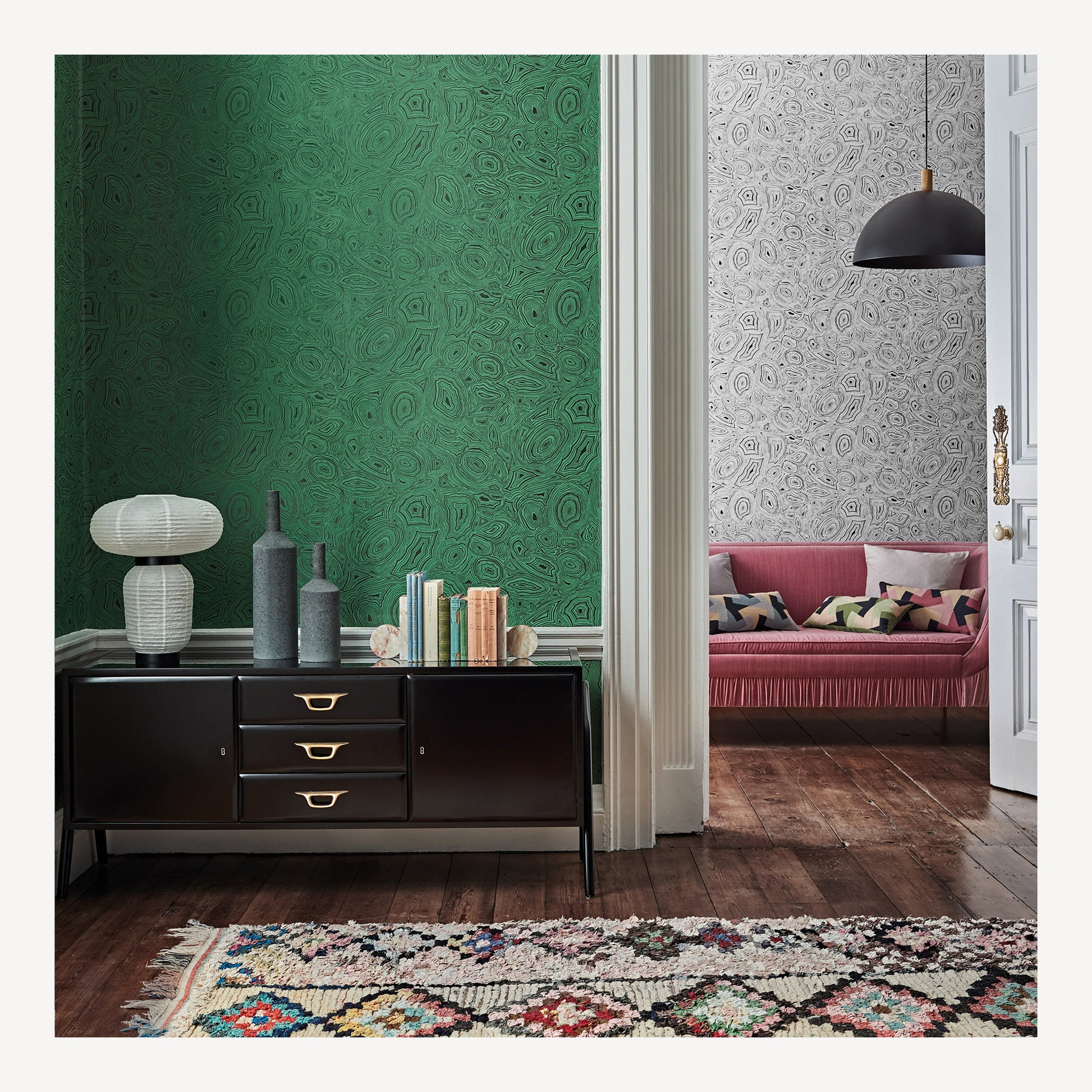 - The iconic Malachite wallpaper is inspired by the intricate curves and ripples of semi-precious stones, with the hypnotic curves becoming synonymous with the Fornasetti canon.