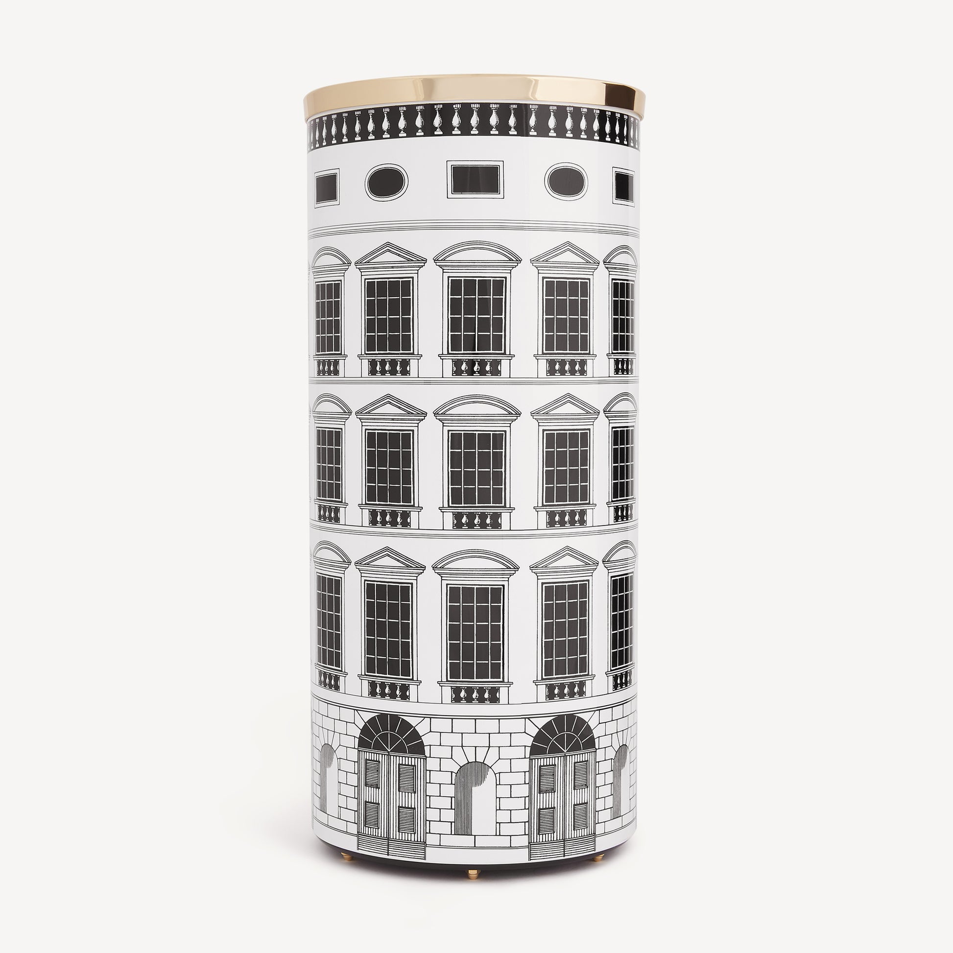 - Inspired by Italian Neoclassical architecture, this hand-silkscreened and lacquered metal umbrella stand, with a top edge and brass feet, plays at creating new worlds: this furniture accessory takes on the shape of an elegant antique palace - a visual icon of the Atelier - and lends your environment a touch of sophisticated functionality.