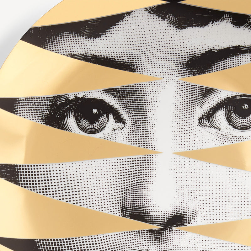 Hand-applied gold and platinum details enrich the decorations with a luminous touch. A Fornasetti tribute to the golden proportions of the face that has been deconstructed and reconstructed so many times.