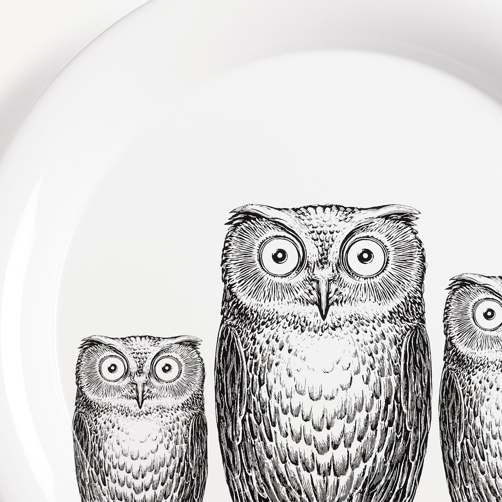 - The circular shape and flat surface give great prominence to the Atelier's decorations. This hand-decorated tray is embellished by the curious presence of three owls, an animal symbolising foresight. Combined with a foldable stand, the tray can be transformed into a coffee table.