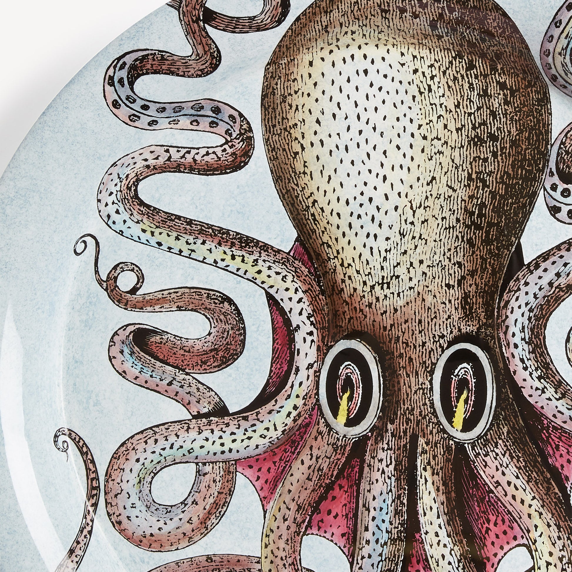 - The circular shape and flat surface give great prominence to the Atelier's decorations. This hand-silkscreened, painted, and lacquered tray is embellished with the mysterious silhouette of an octopus, a testament to Fornasetti's love of zoomorphic subjects. Combined with a foldable stand, the tray can be transformed into a coffee table.