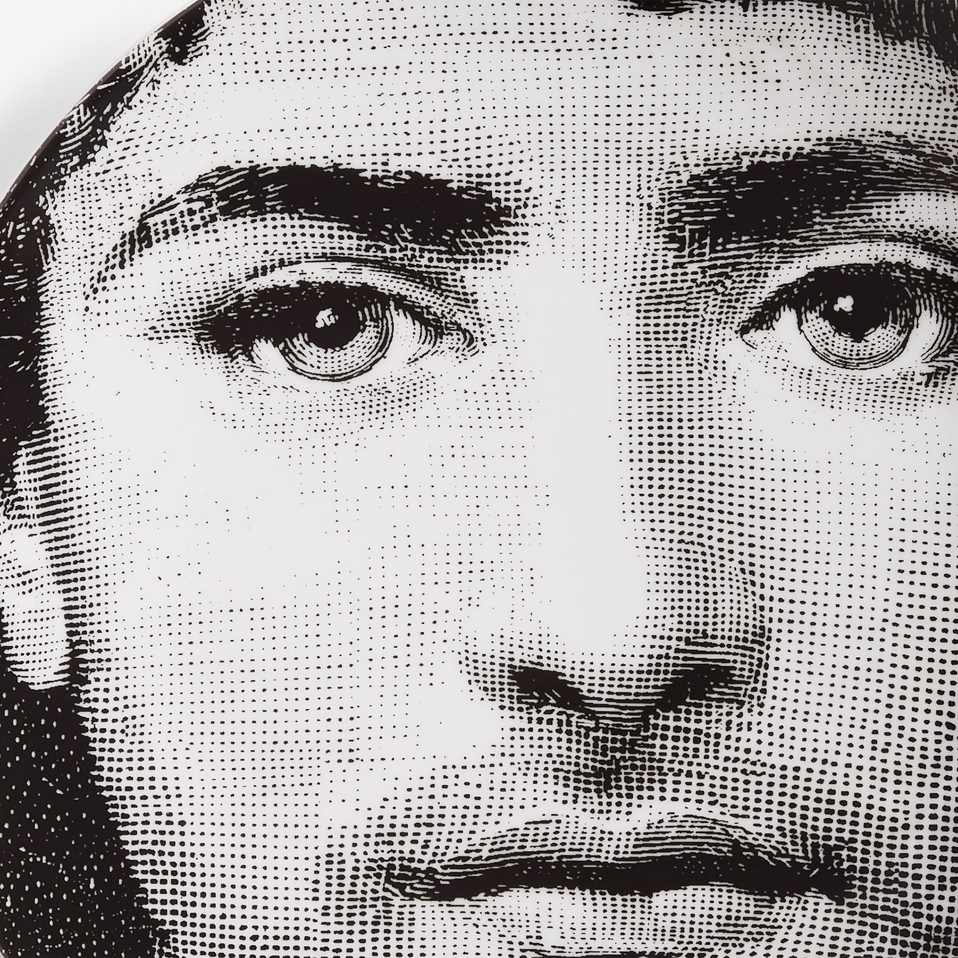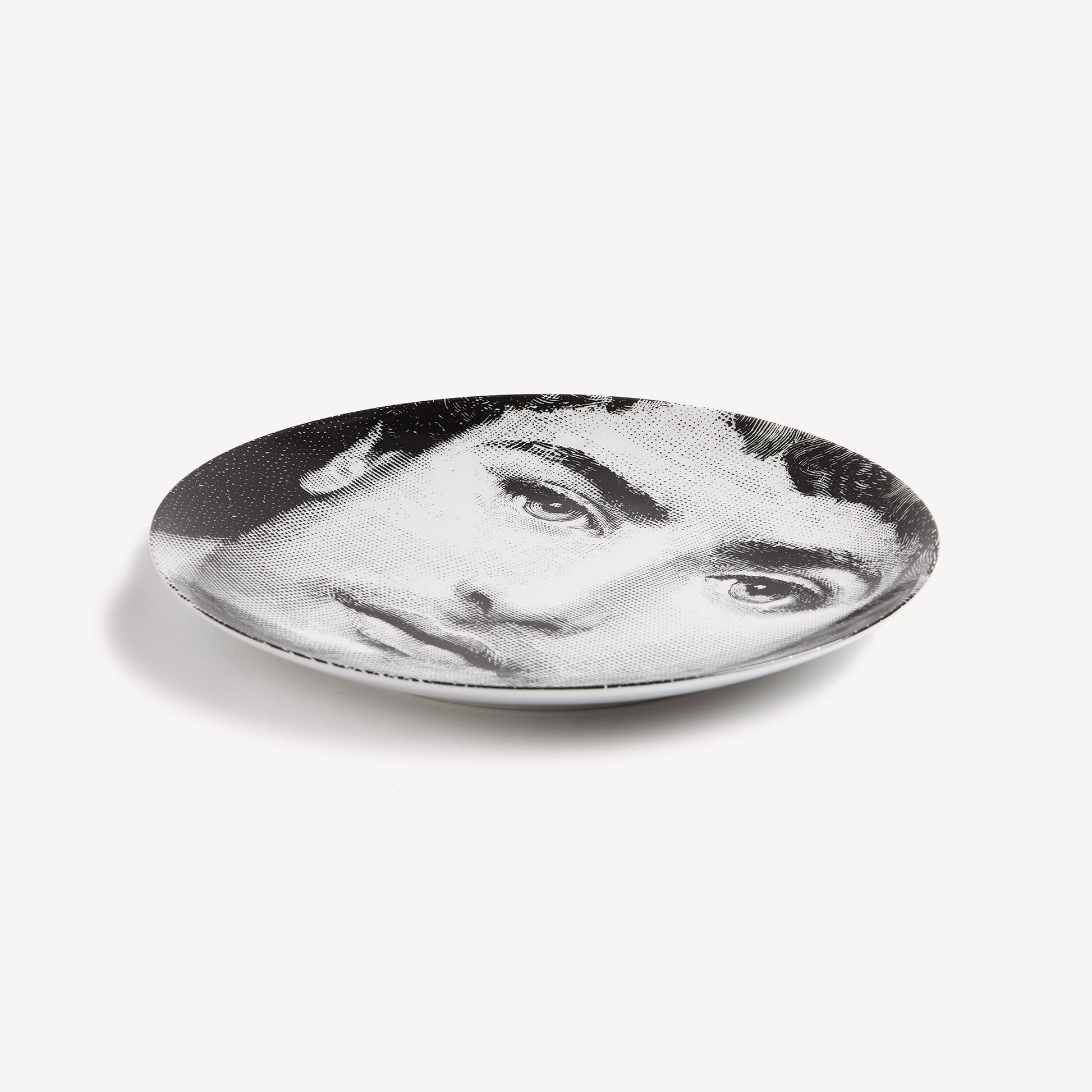 - The face of opera singer Lina Cavalieri, reinterpretated by Piero Fornasetti, adorns this hand-decorated porcelain plate from the iconic Tema e Variazioni series. A true collector's item, you can use it as a wall plate, thanks to the two holes on the back, but also as an ornamental plate for table art. For cleaning, we recommend a damp cloth without any soaps or solvents.