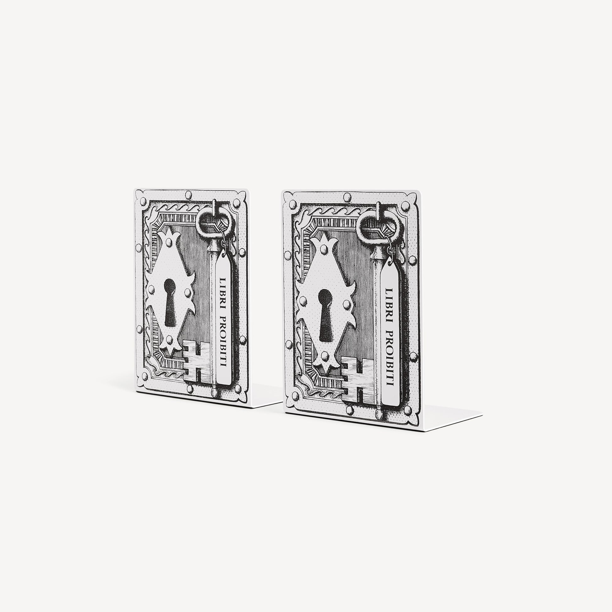 - This pair of hand-silkscreened metal bookends is embellished with the Libri Proibiti (Forbidden Books) motif: a touch of irony for an eye-catching addition to any shelf or countertop.