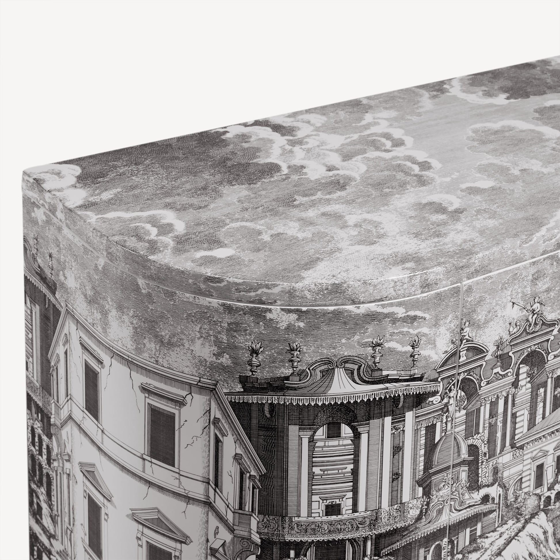 - This piece of furniture, screen-printed and lacquered by hand, is embellished by one of Fornasetti's most famous architectural decorations, designed to associate its practical function as a container with an aesthetic value that makes it a talking point in any space.