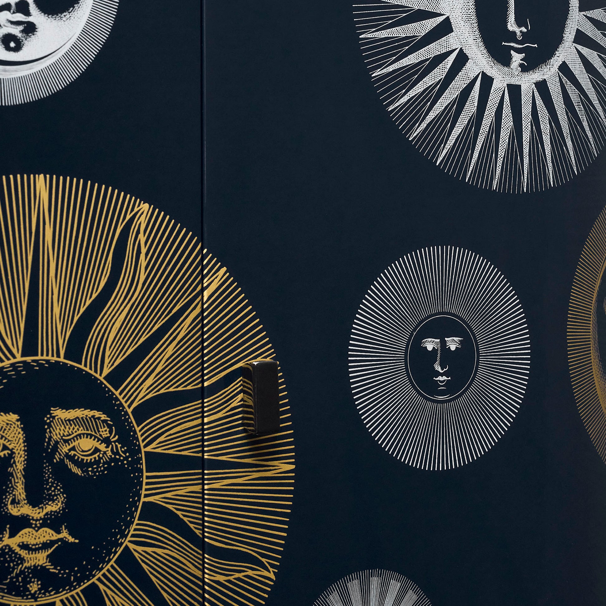 In the Soli e Lune design, Fornasetti's unmistakable graphic style translates an imaginary solar system into a sophisticated piece of furniture. The gold and silver details make it even more refined. Piero Fornasetti's self-portrait can be recognized in the mustachioed Sun.
