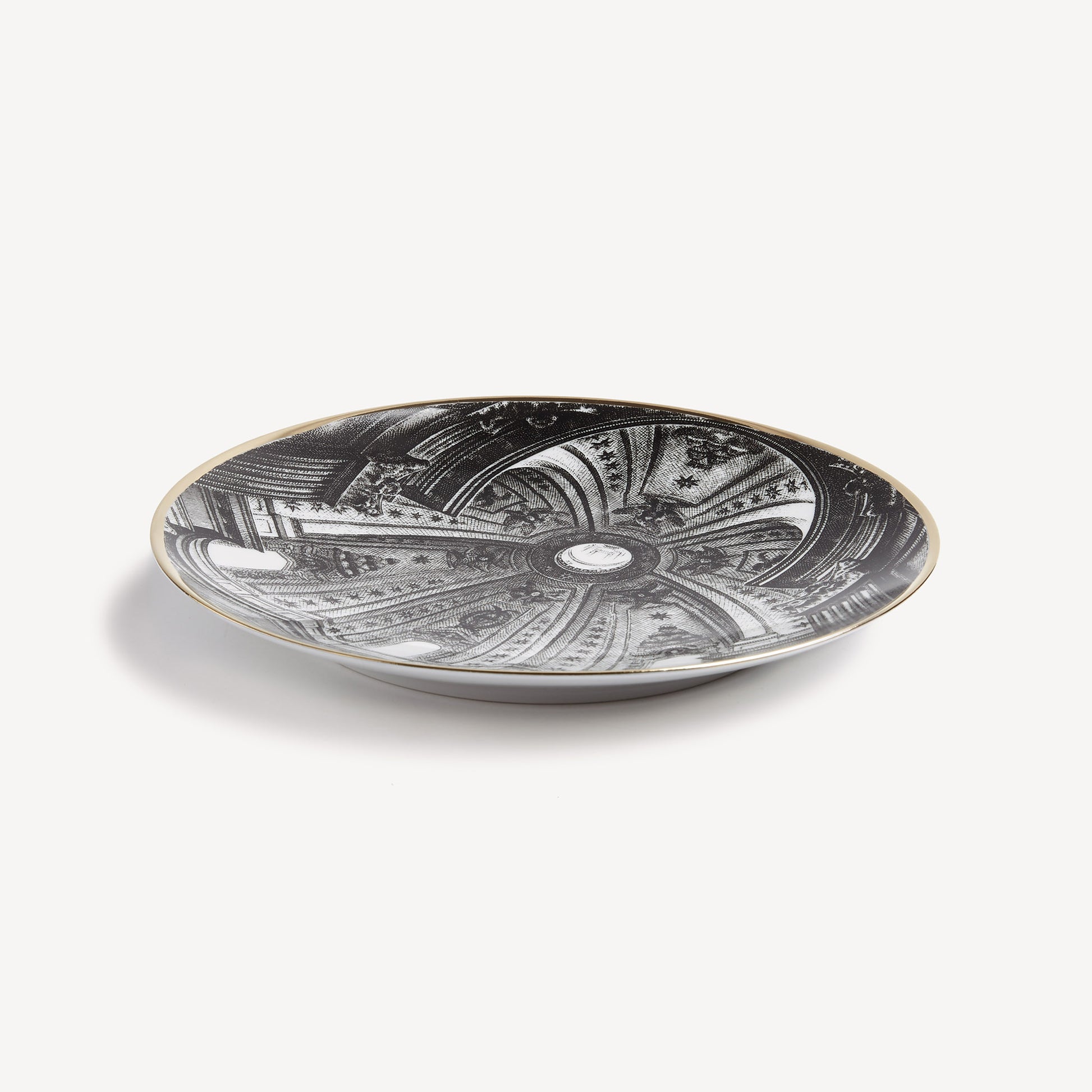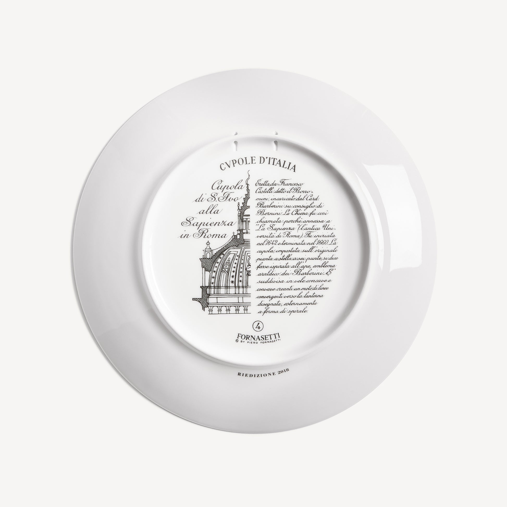 - Fornasetti loved incorporating architecture into his decorations, as evidenced by this series of plates dedicated to famous Italian domes. This hand-decorated porcelain plate with gold accents is a collector's item that you can use as a wall plate, thanks to the presence of two holes on the back, but also as an ornamental function for table art. For cleaning, we recommend a damp cloth without any soaps or solvents.