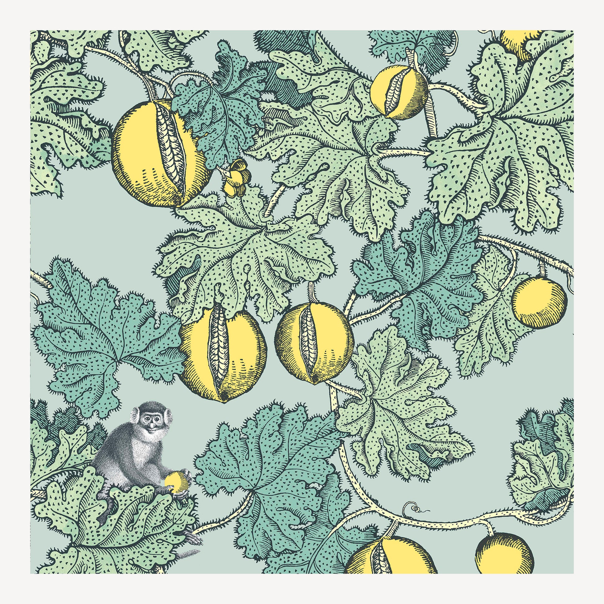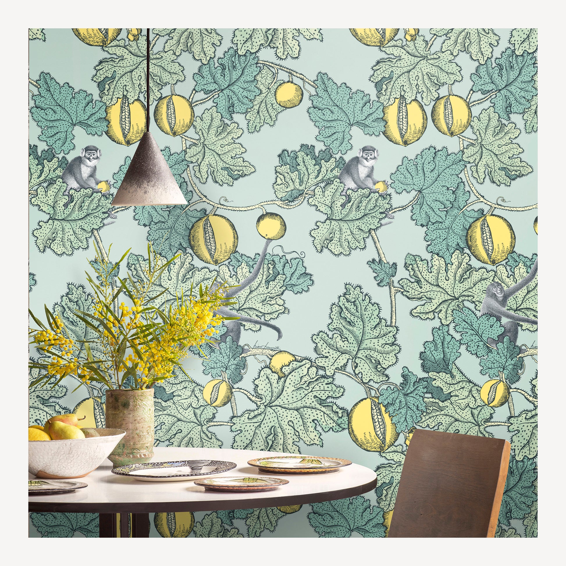 - The Frutto Proibito wallpaper features mischievous monkeys sitting amongst sprawling pomegranate tree branches.