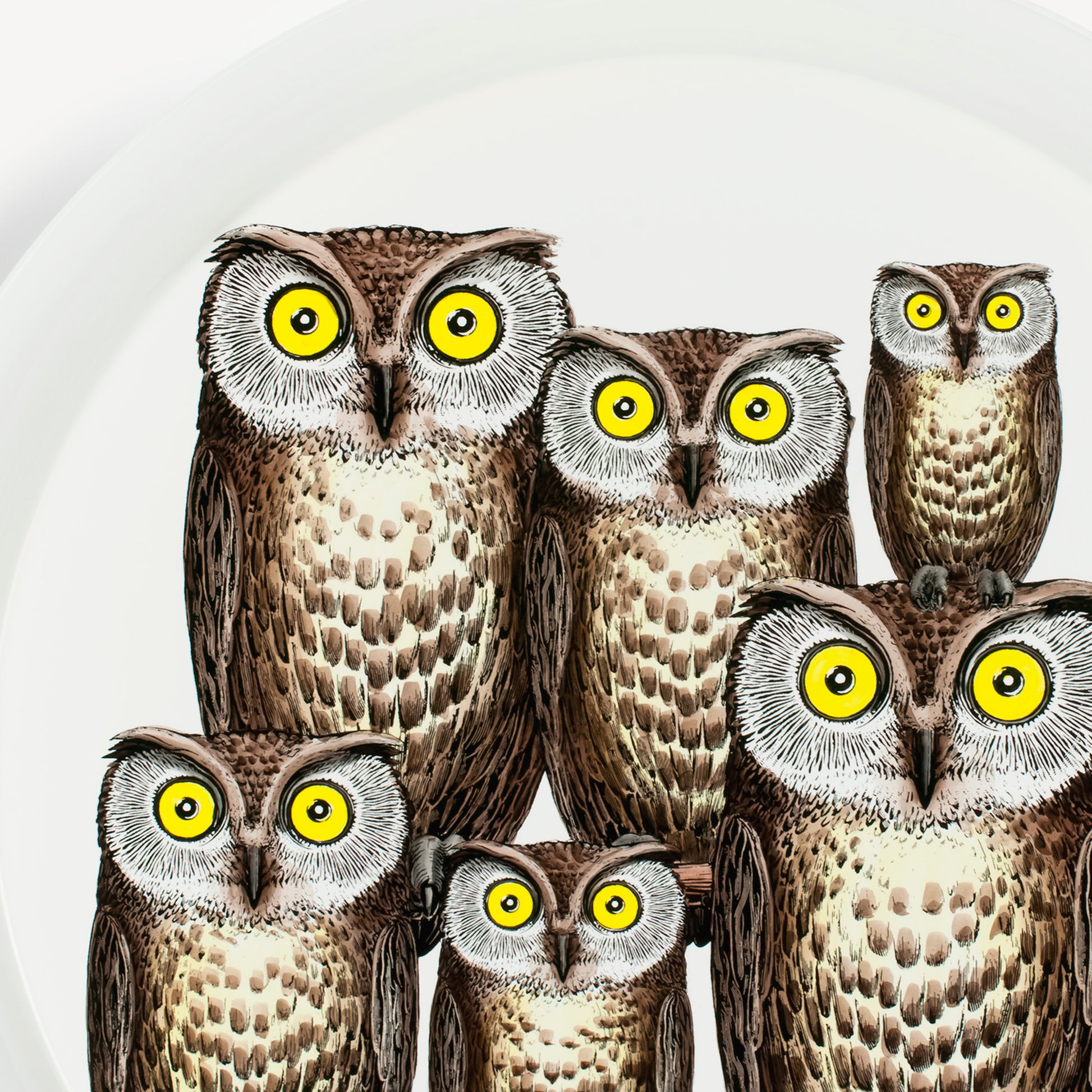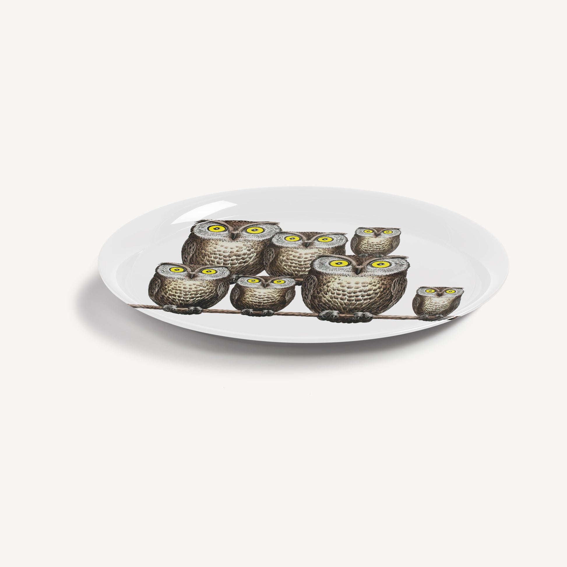 - The circular shape and flat surface give great prominence to the Atelier's decorations. This hand-silkscreened, painted, and lacquered tray depicts a group of austere owls, an animal symbolising foresight. Combined with a foldable stand, the tray can be transformed into a coffee table.