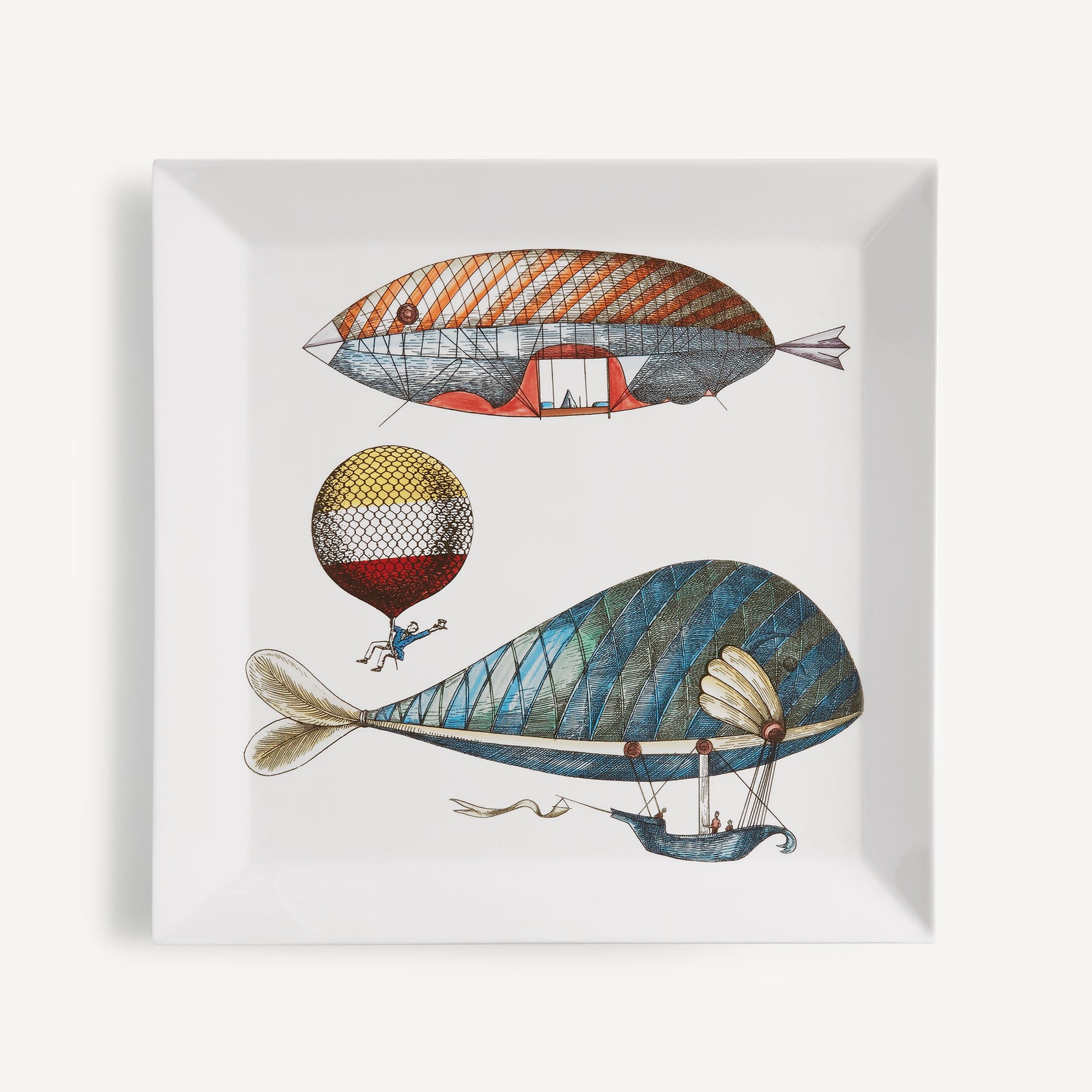 - This hand-painted and decorated square tray is part of Fornasetti's series dedicated to hot-air balloons and airships. This is how an everyday object can become a work of art or a complement that adds character to your table.