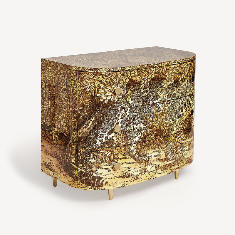 Dessinée dans les années 1950 pour le salon de la villa familiale, cette commode était l’une des créations préférées de Piero. Le décor exotique épouse les lignes élégantes de la commode Fornasetti et en fait une icône intemporelle du design.