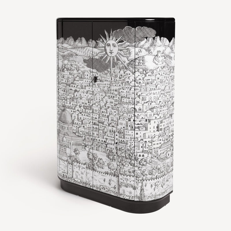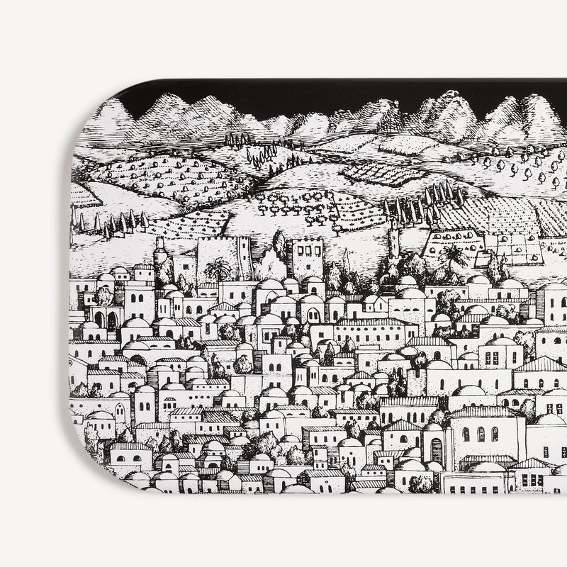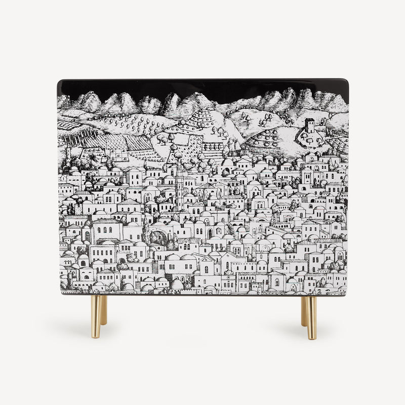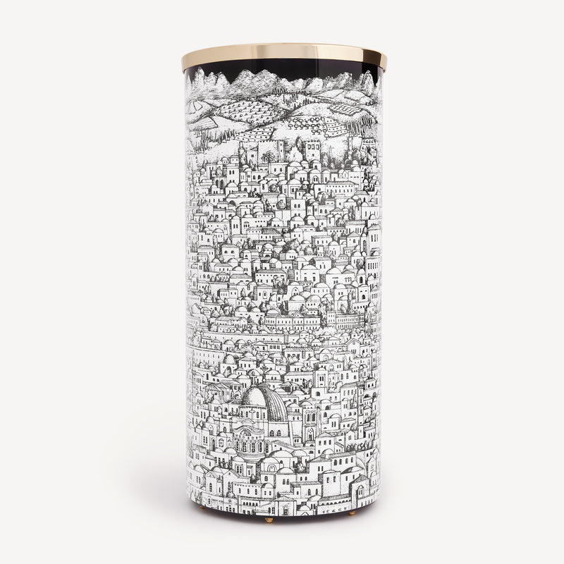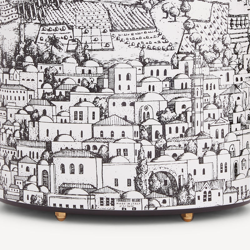 Un vol au-delà des limites de l’imagination conduit Fornasetti dans une Jérusalem enchantée et hypnotique. De multiples points de vue se superposent, différents styles architecturaux se succédant dans un motif continu. La ligne noire précise interprète une imagination sans limites, créant une texture intrigante. Le premier voyage onirique de ce motif a eu lieu sur le papier peint « Gerusalemme », dessiné pour la Casa Fornasetti à la fin des années 1940. Il a ensuite été étendu aux plateaux, porte-revues, lampes et à l’emblématique cabinet arrondi Fornasetti.