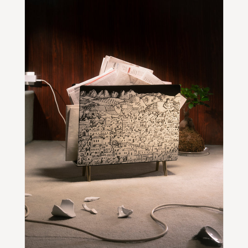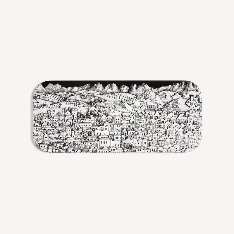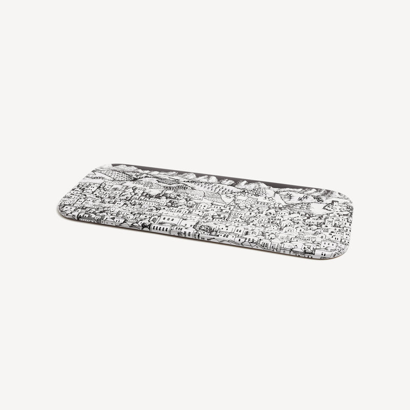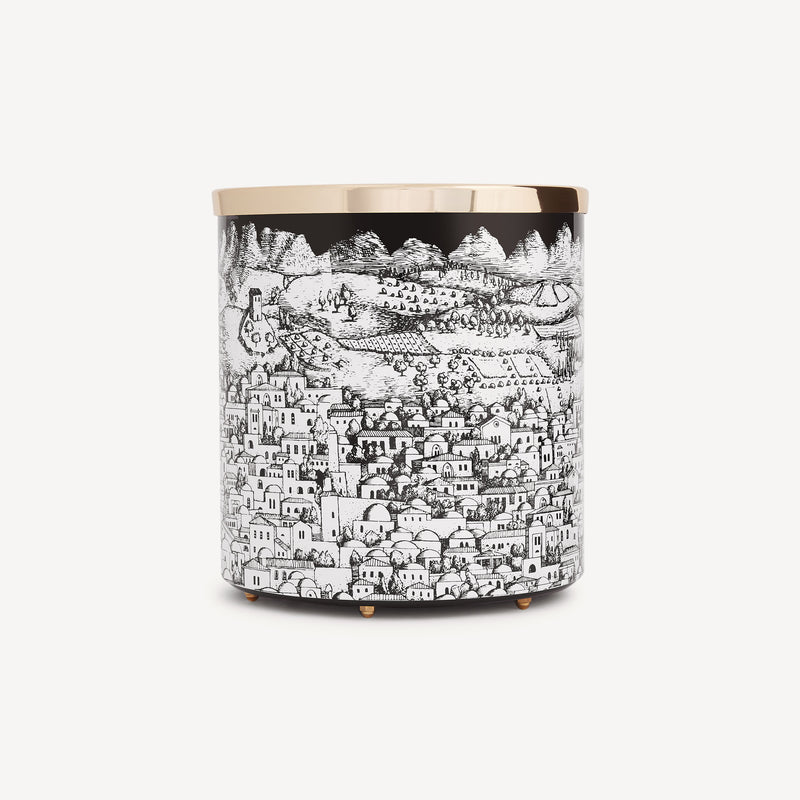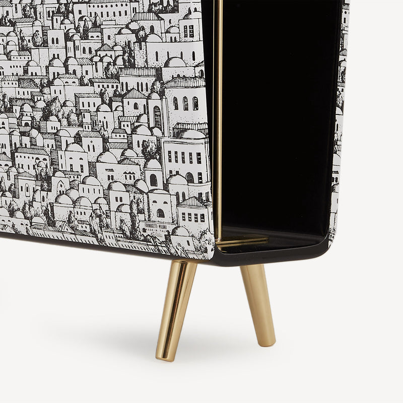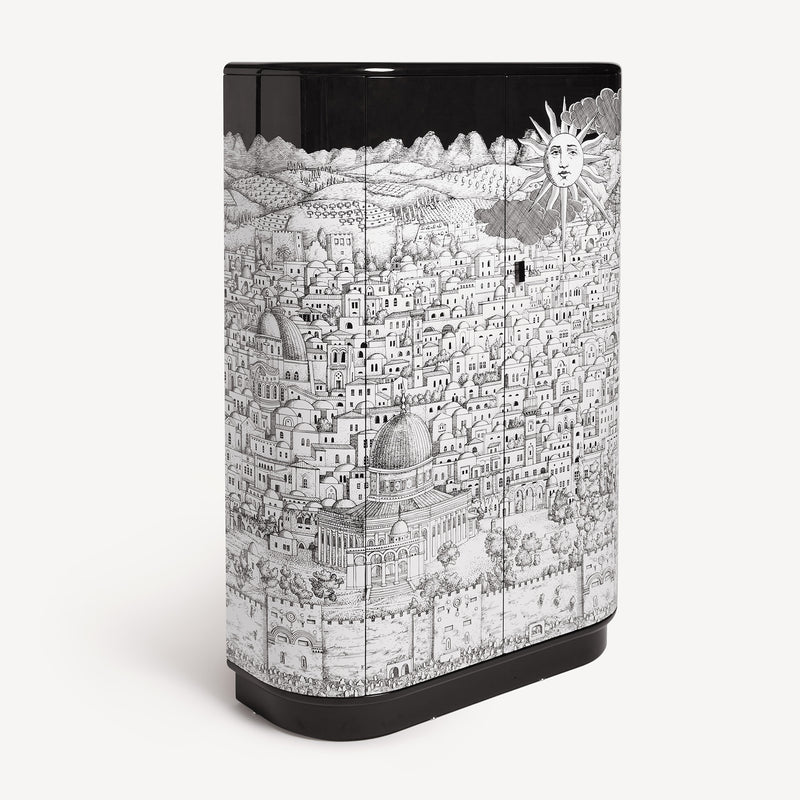 Un vol au-delà des limites de l’imagination conduit Fornasetti dans une Jérusalem enchantée et hypnotique. De multiples points de vue se superposent, différents styles architecturaux se succédant dans un motif continu. La ligne noire précise interprète une imagination sans limites, créant une texture intrigante. Le premier voyage onirique de ce motif a eu lieu sur le papier peint « Gerusalemme », dessiné pour la Casa Fornasetti à la fin des années 1940. Il a ensuite été étendu aux plateaux, porte-revues, lampes et à l’emblématique cabinet arrondi Fornasetti.