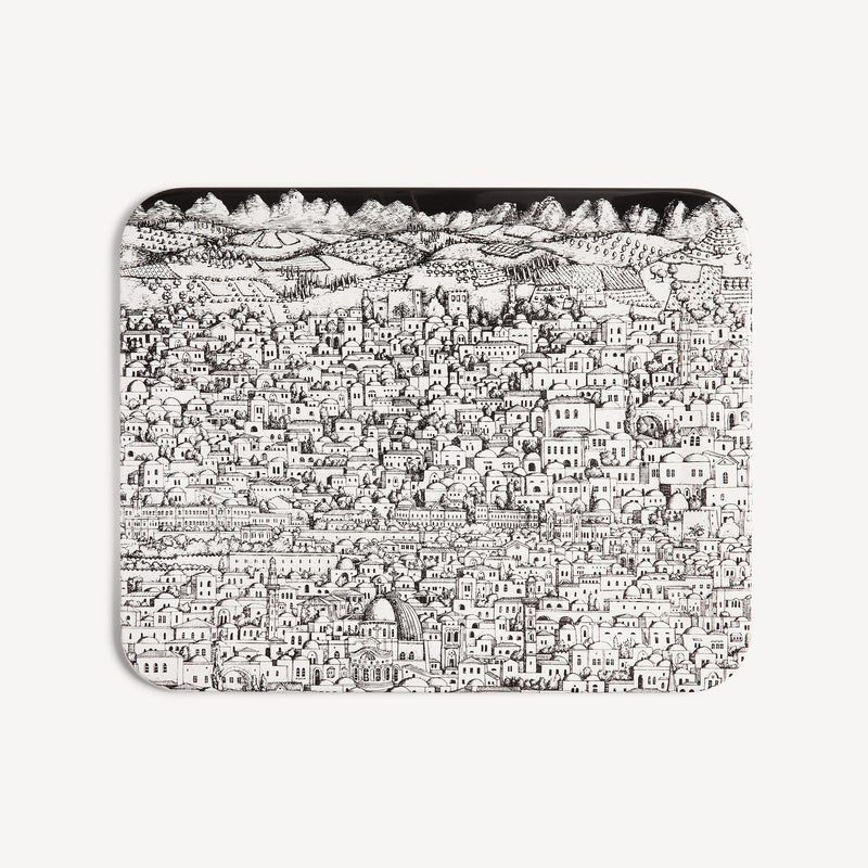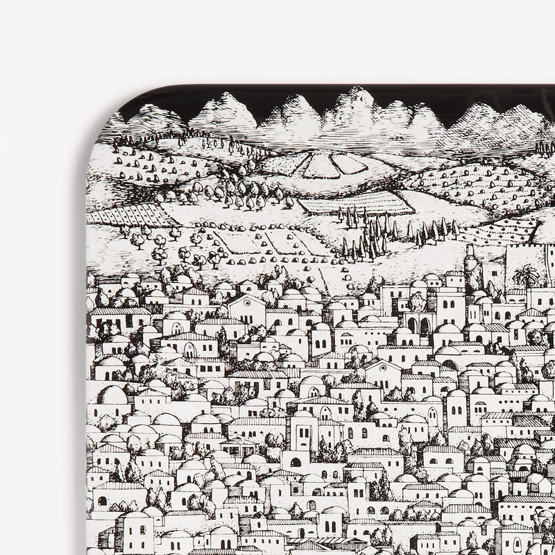 La vision imaginaire et rêveuse de Jérusalem est le point de départ d’un exercice graphique impeccable, où la main de Fornasetti laisse libre cours à la créativité.